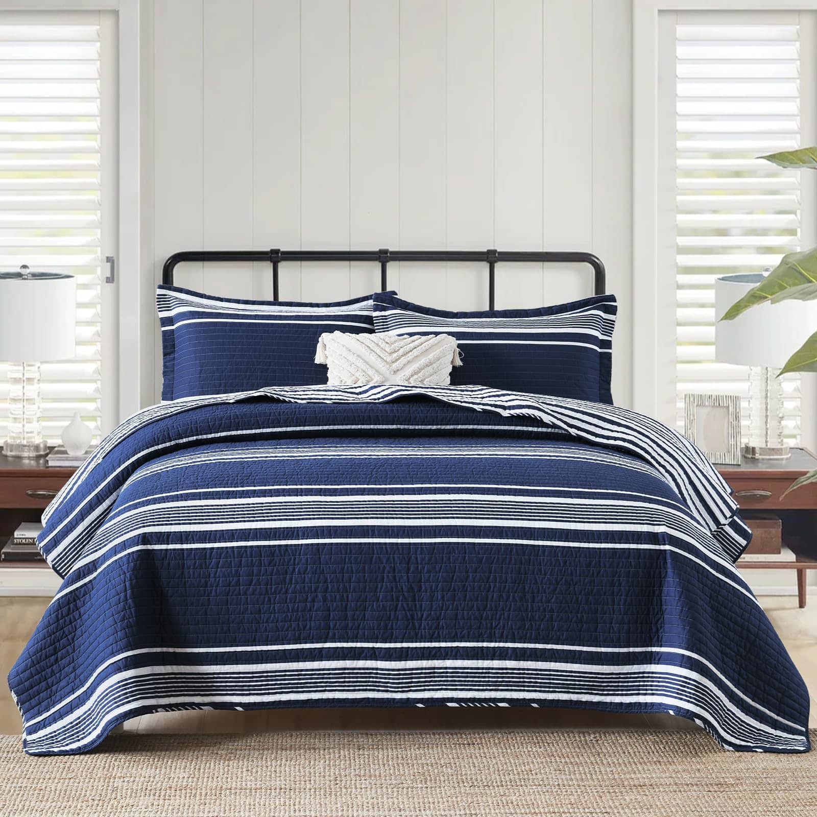 2. Diseño Clásico de Juego de Edredón: El juego de edredón con estampado botánico y de rayas sirve también como una elegante colcha y cubrecamas, complementando fácilmente diferentes estéticas de dormitorio y asegurando una hermosa adición a cualquier decoración del hogar, incluidos dormitorios, salas de estar, habitaciones principales, habitaciones de invitados, estudios, cabañas rústicas, acampadas y vehículos recreativos.