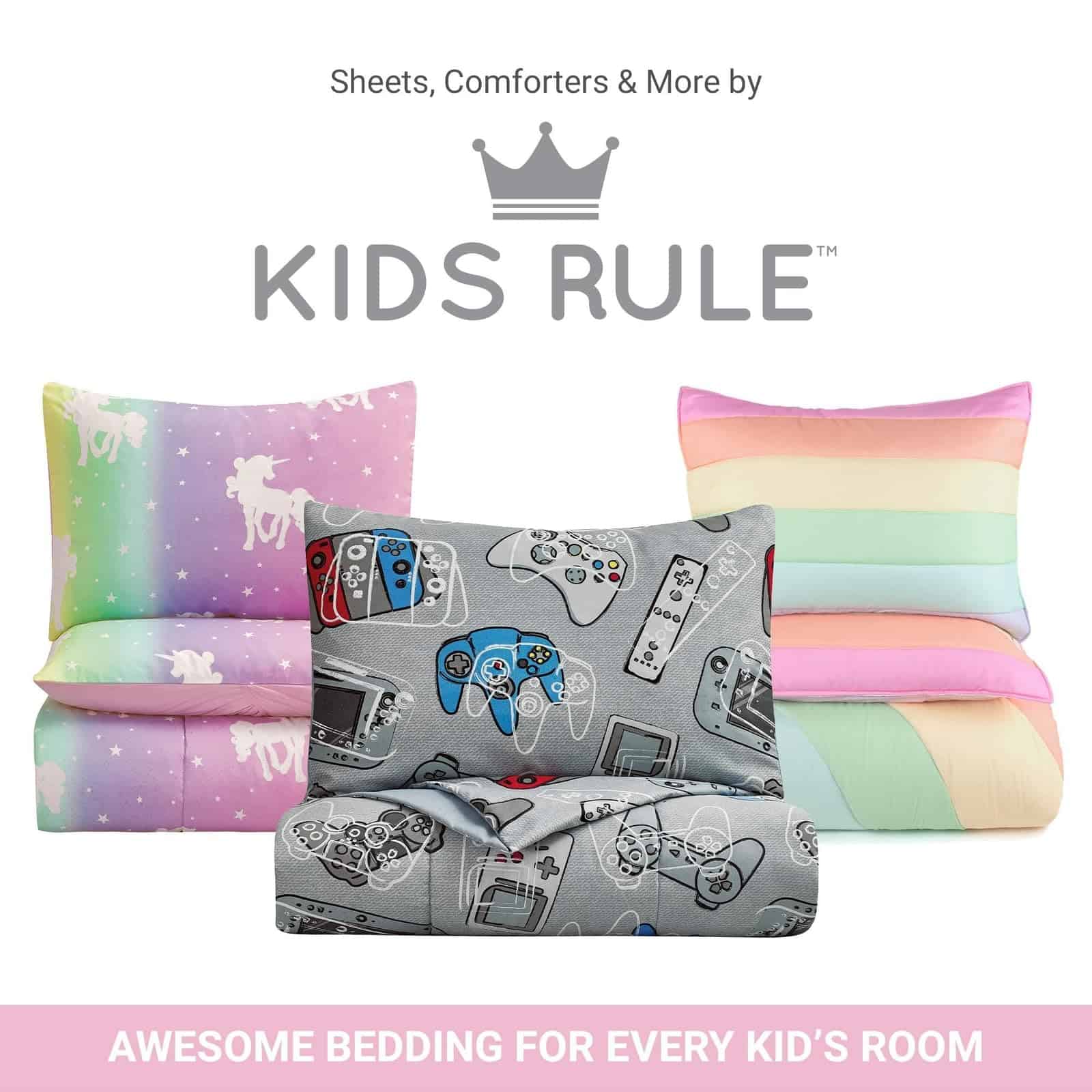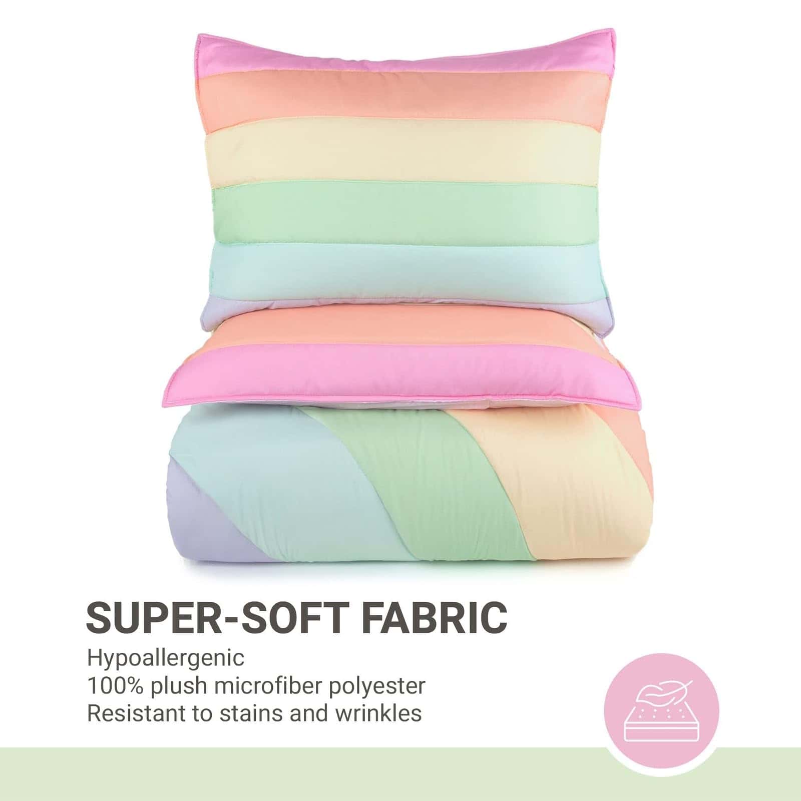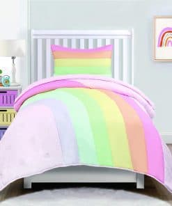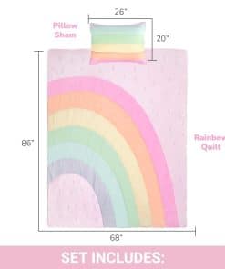Este hermoso juego de edredón de 2 piezas para niños presenta un vibrante arco iris de colores. El set incluye un edredón suave y una funda a juego. Fabricado con un 100% de fibra de poliéster microdenier, este juego es hipoalergénico y resistente a encoger, estirar y arrugarse. Las dimensiones del tamaño Twin son 68″x86″ para el edredón y 20″x26″ para la funda. Cuidar este juego es muy sencillo, ya que es lavable a máquina y se puede secar en secadora.
