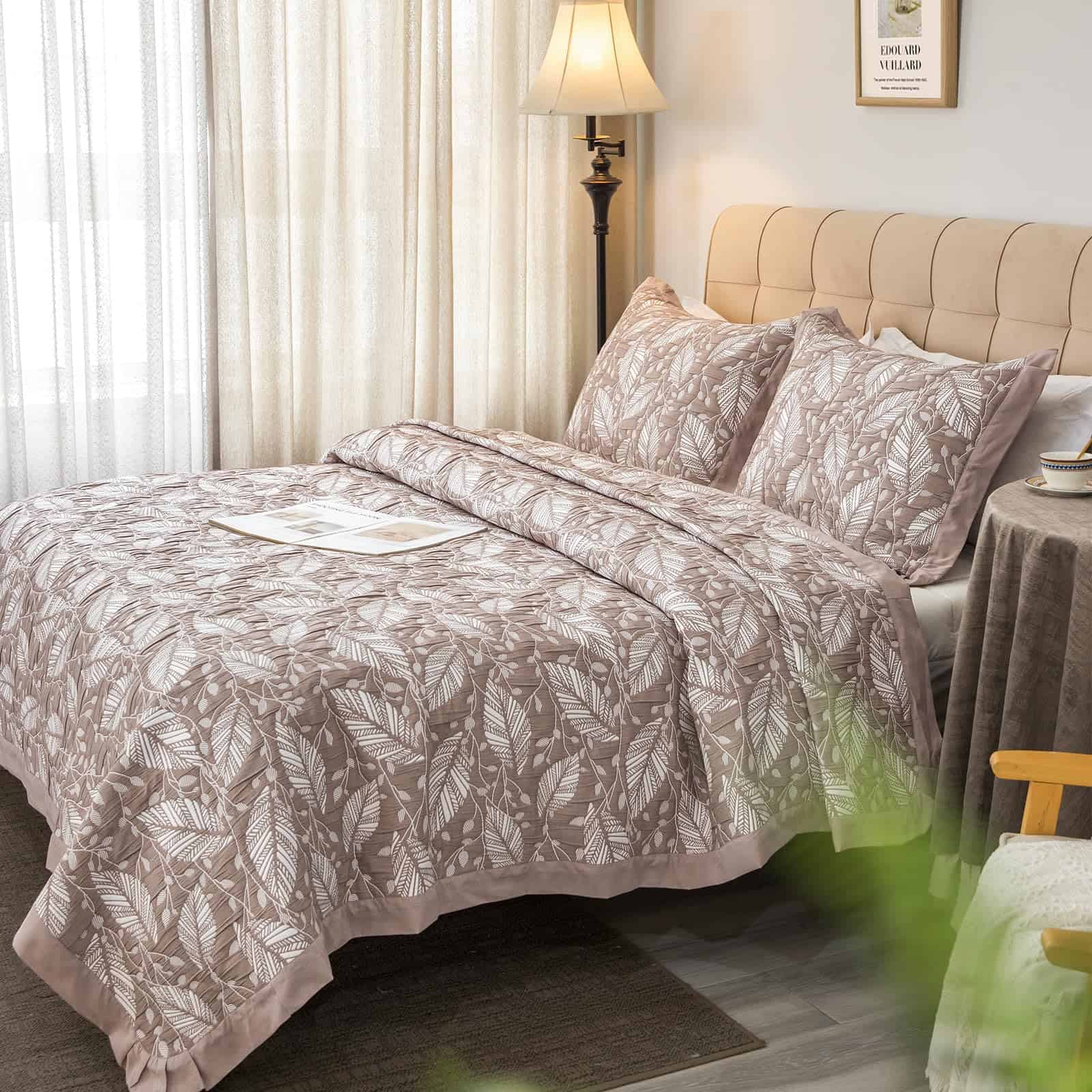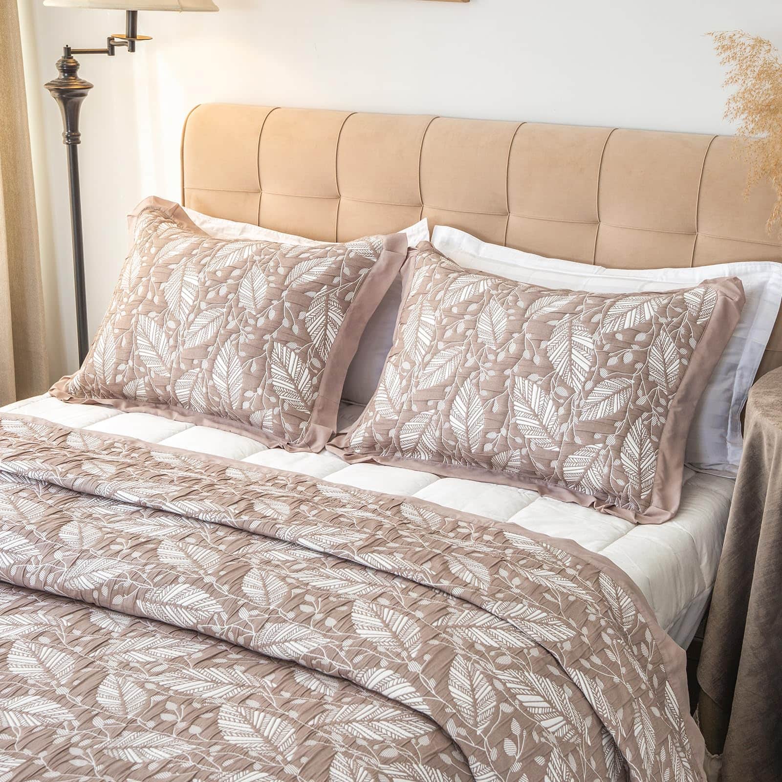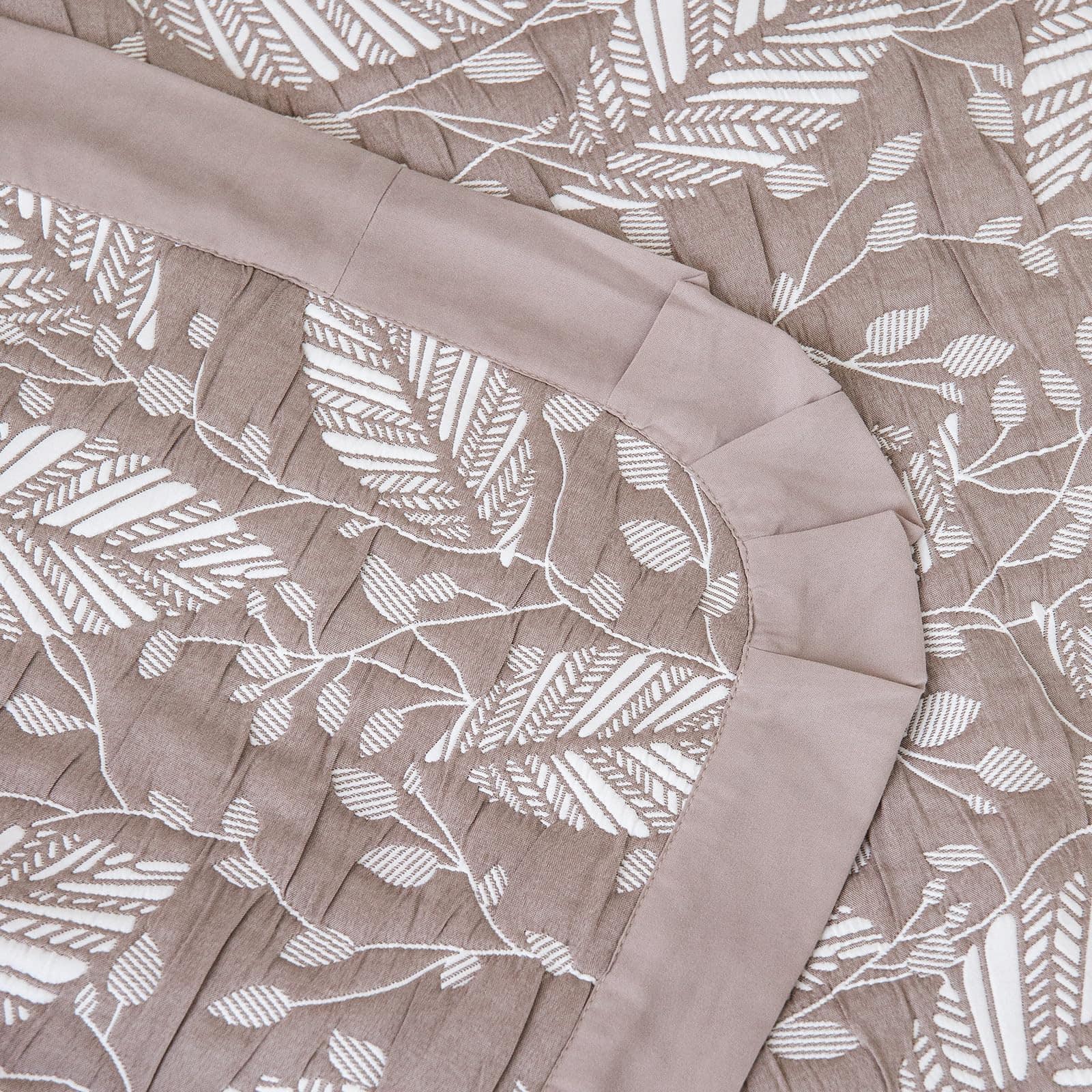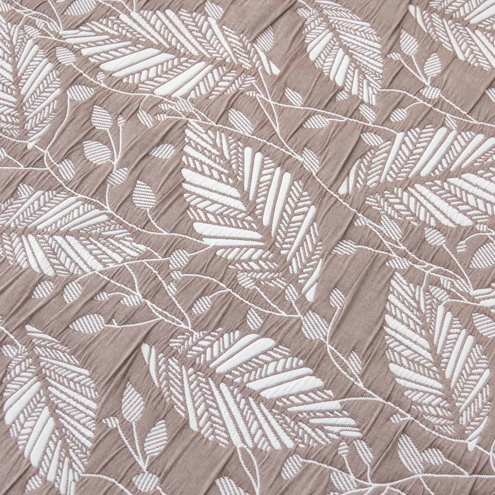 Exquisito diseño de hojas color marfil y café en jacquard, como el bajorrelieve en el palacio vintage, que hacen que los detalles del patrón sean más ricos y tridimensionales. La tela de jacquard teñida de hilos pesados y densos premium, la exquisita confección y costura hacen que los juegos de edredón sean más confiables, pero también transpirables y acogedores. Conveniente para su uso en todas las temporadas. Los bordes plisados hechos a mano liberan elegancia y estilo de lujo, un dibujo jacquard vibrante adecuado para decorar tu habitación y habitación de huéspedes. La comodidad tranquila y serena ofrece una manera elegante de actualizar tu hogar.