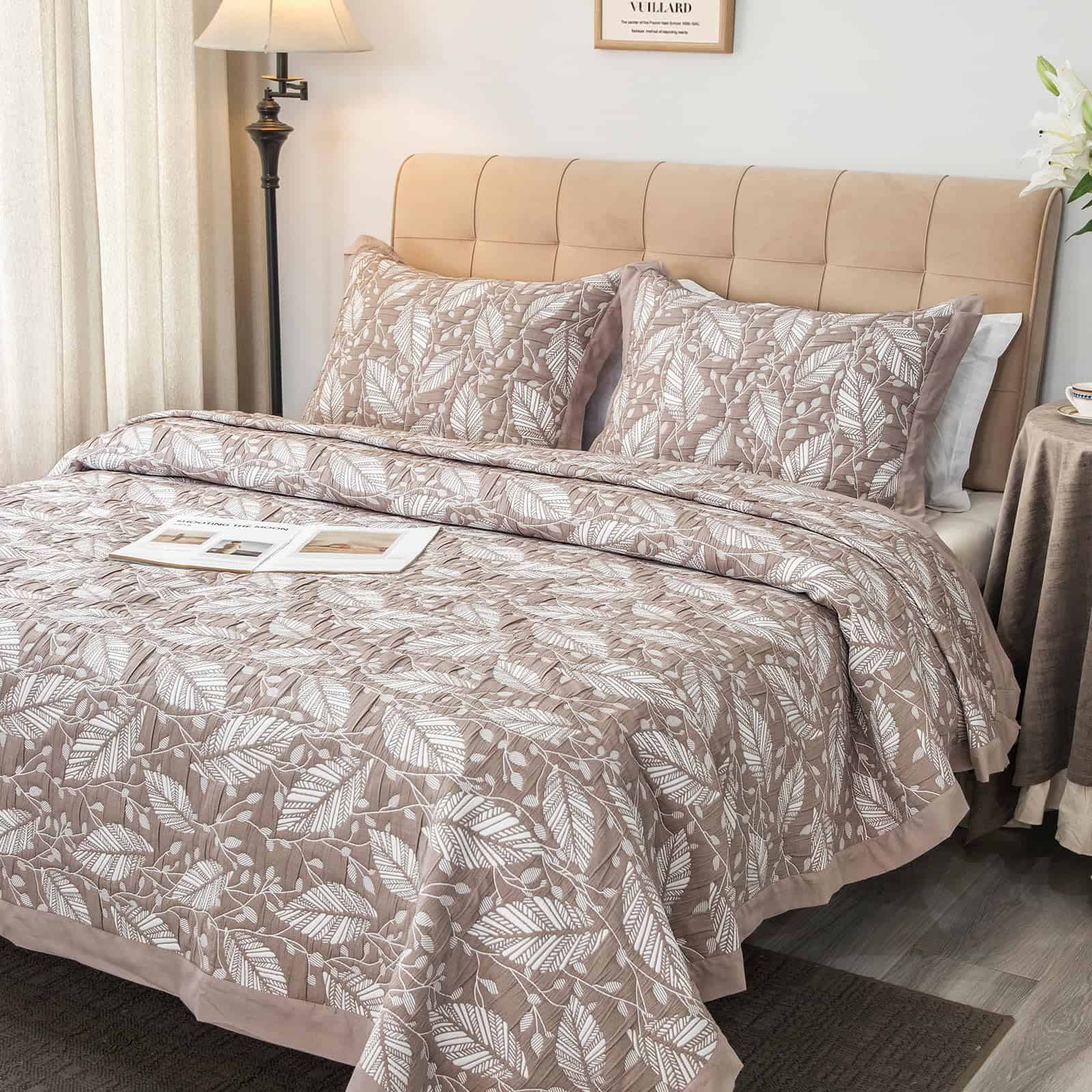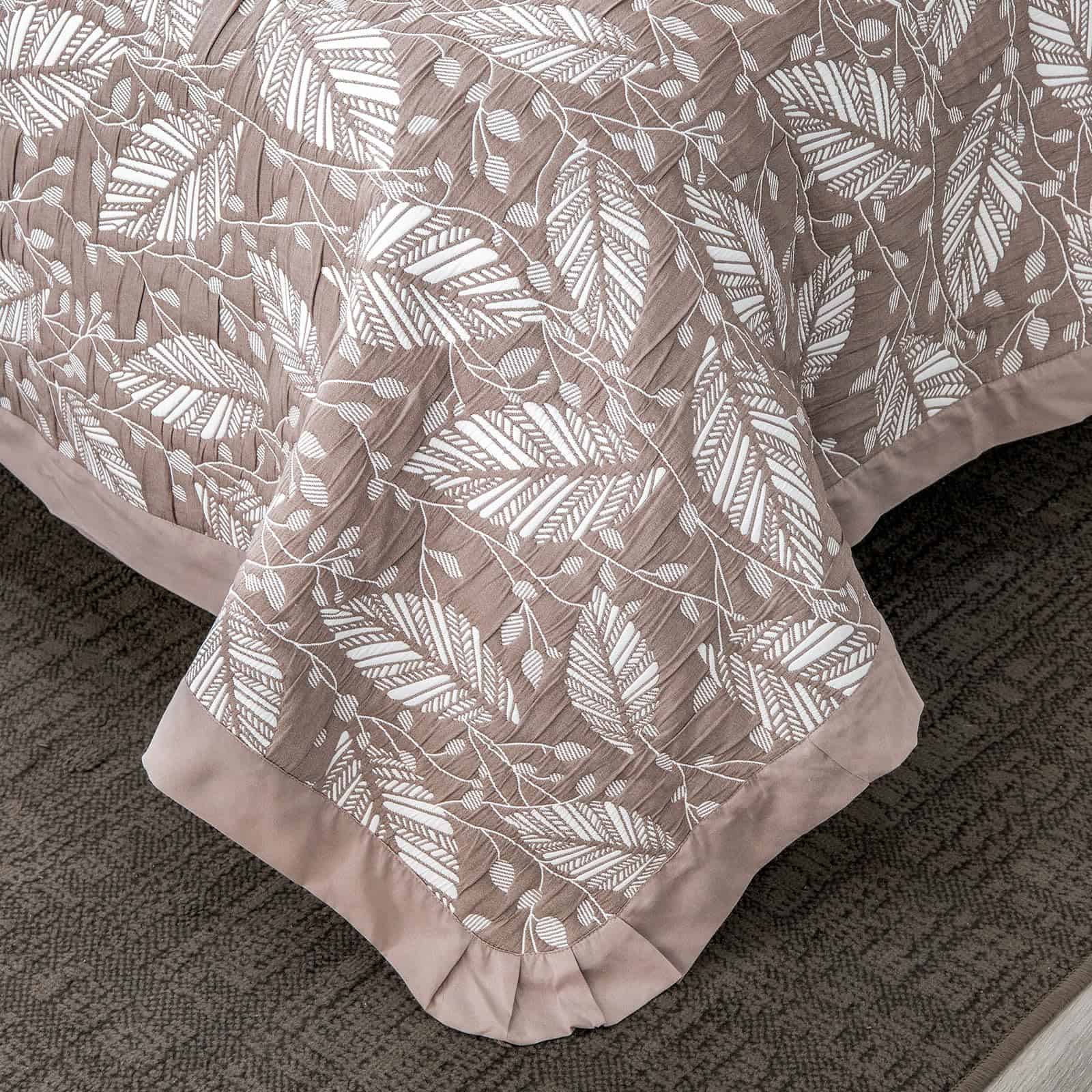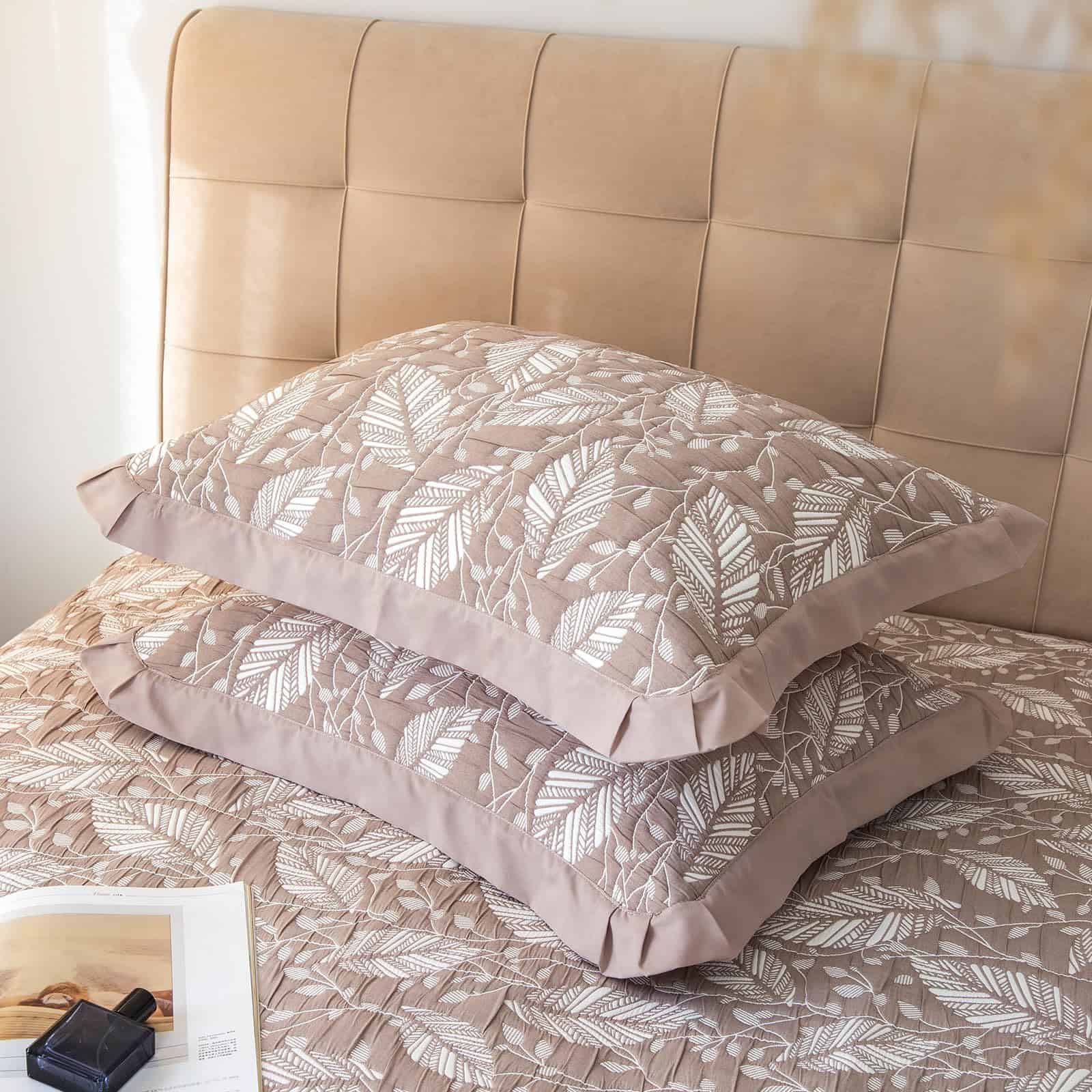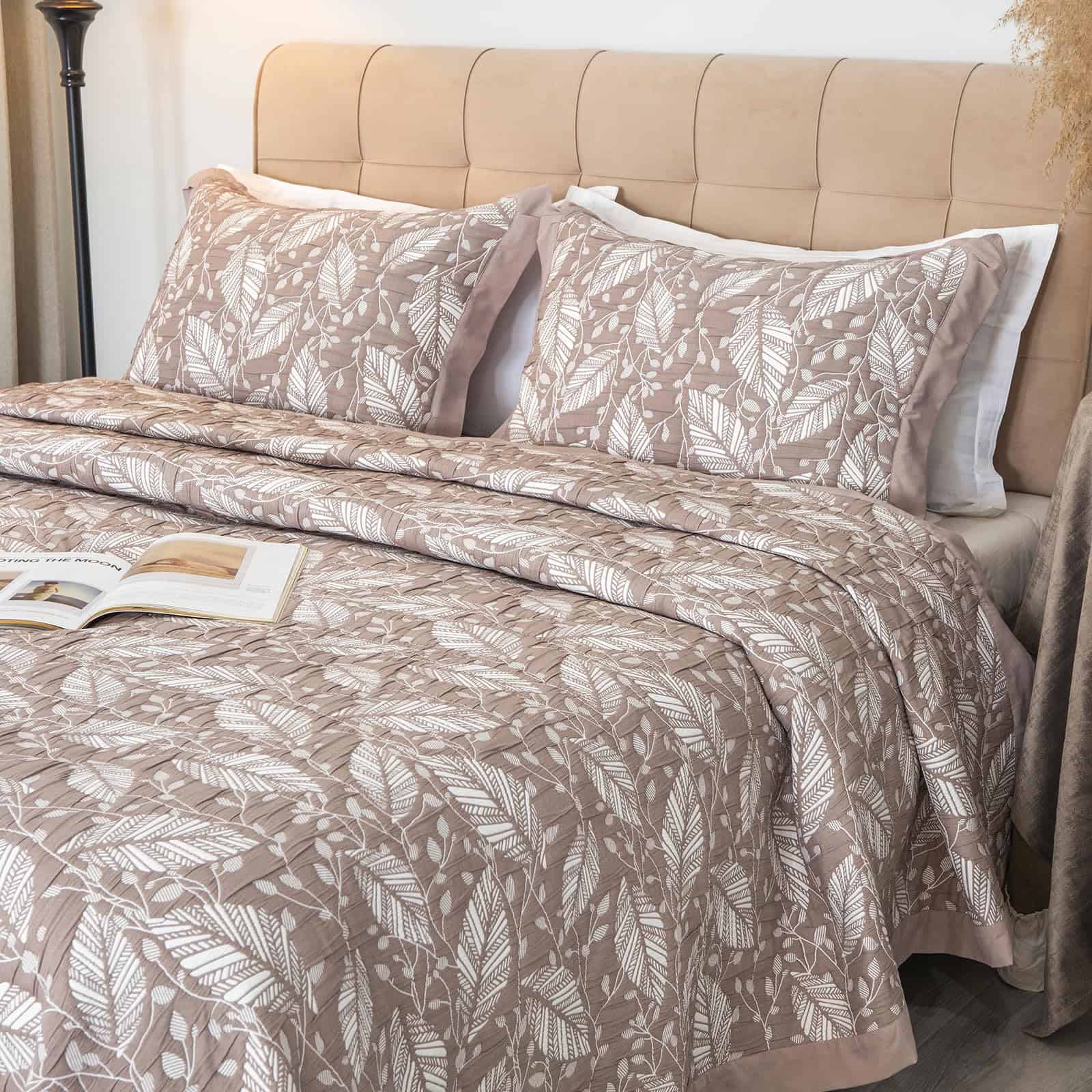 Exquisito diseño de hojas color marfil y café en jacquard, como el bajorrelieve en el palacio vintage, que hacen que los detalles del patrón sean más ricos y tridimensionales. La tela de jacquard teñida de hilos pesados y densos premium, la exquisita confección y costura hacen que los juegos de edredón sean más confiables, pero también transpirables y acogedores. Conveniente para su uso en todas las temporadas. Los bordes plisados hechos a mano liberan elegancia y estilo de lujo, un dibujo jacquard vibrante adecuado para decorar tu habitación y habitación de huéspedes. La comodidad tranquila y serena ofrece una manera elegante de actualizar tu hogar.