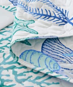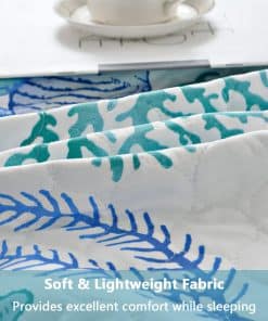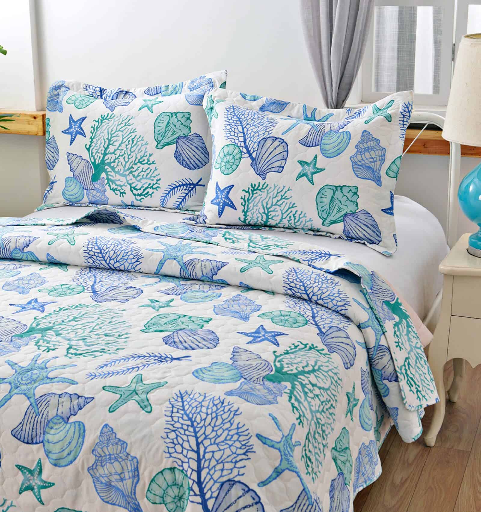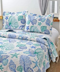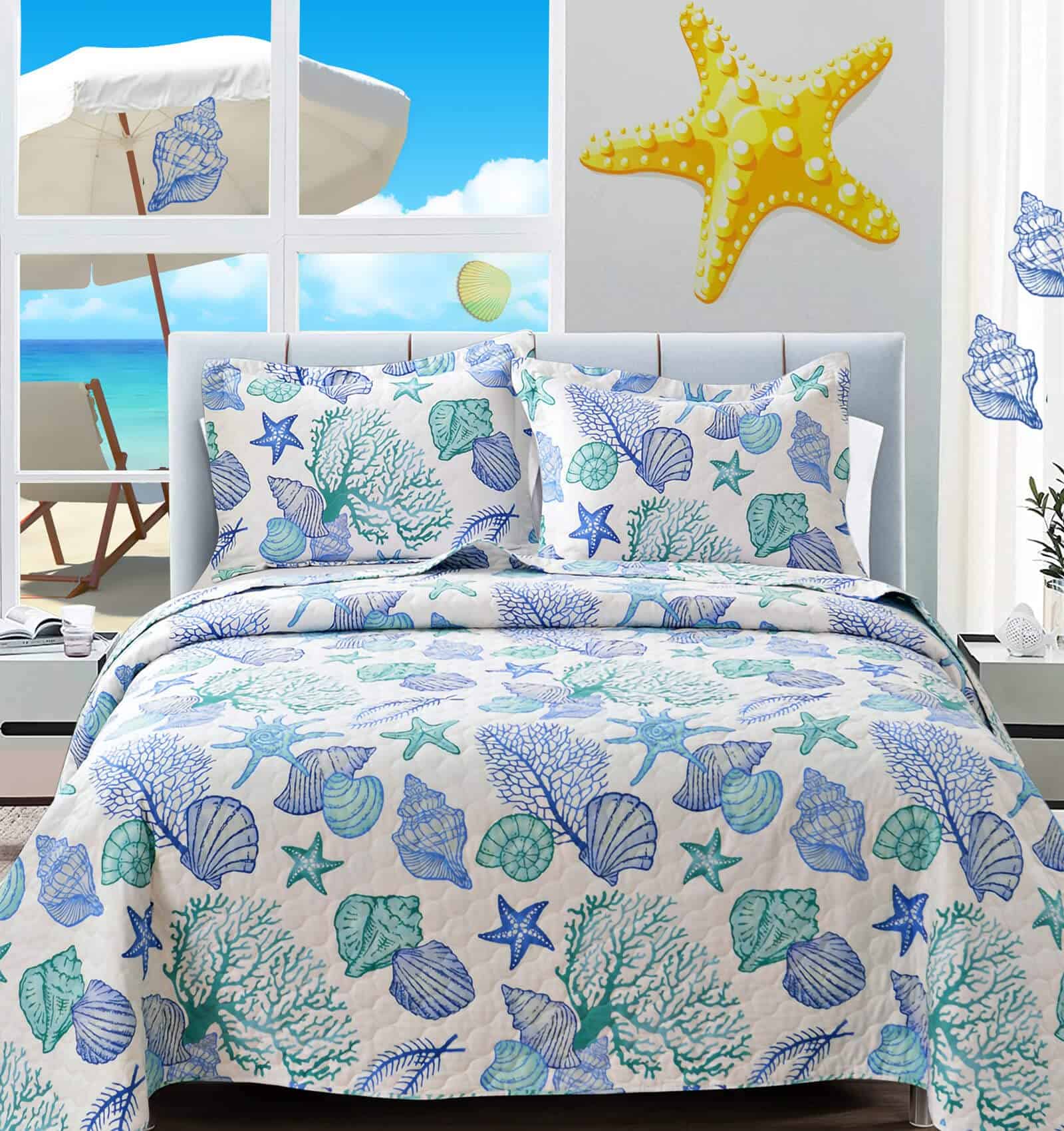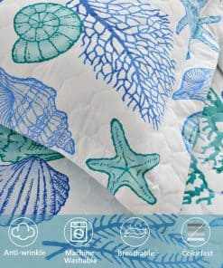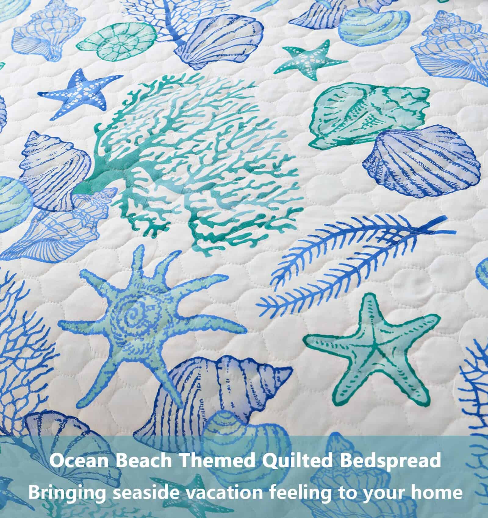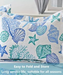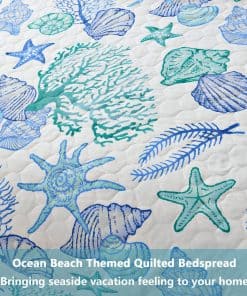 Juego de Edredón de Tamaño King CHESITY de 3 piezas con diseño reversible de tema de playa oceánica. Incluye una colcha (96″x106″) y 2 fundas de almohada king size (20″x36″+2″). Con estampado de estrellas de mar, conchas y caracoles en tonos azules claros, este juego de edredón lleva la sensación relajante de la playa a tu habitación. La tela reversible hace que el juego de ropa de cama náutico se vea elegante y bonito en cualquier lugar. Hecho de material de microfibra de poliéster, el juego de edredones es suave al tacto y cómodo, garantizando un mejor sueño y una sensación de frescura por la mañana. Ligero y portátil, es perfecto para las noches de primavera y verano, así como para llevarlo contigo de vacaciones. La alta calidad del acolchado del edredón garantiza durabilidad y resistencia, con costuras apretadas y bordes perfectamente cosidos. Resistente a las arrugas y a la decoloración, este juego de ropa de cama de playa tamaño king es adecuado para todas las estaciones. Fácil de cuidar, simplemente lavar a máquina en frío por separado con un ciclo suave para mantener la frescura y suavidad. Disfruta de un sueño cómodo y relajante con este hermoso juego de edredón de playa.