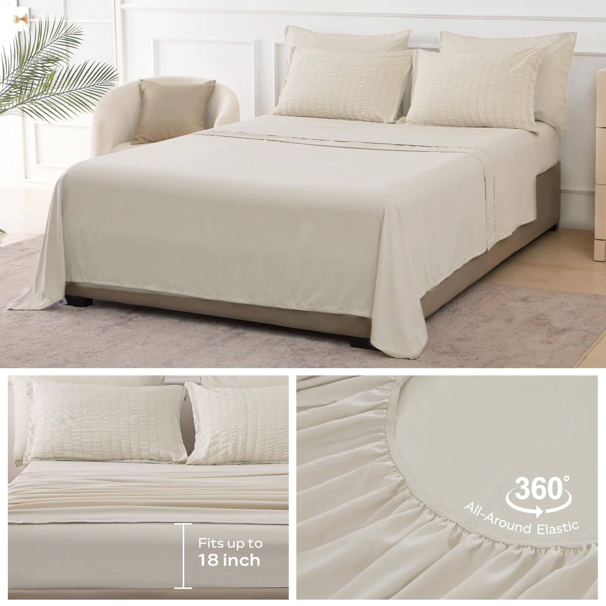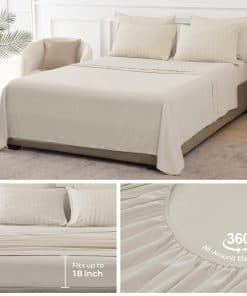 2. Diseño Elegante: Esta sábana bajera elástica con bolsillos profundos está diseñada para adaptarse a colchones de hasta 18 pulgadas de profundidad. Su diseño garantiza un ajuste antideslizante, proporcionando estabilidad sin importar cuánto te muevas durante la noche. Los tonos blancos suaves añaden un toque sutil de color a la estética refinada y minimalista.