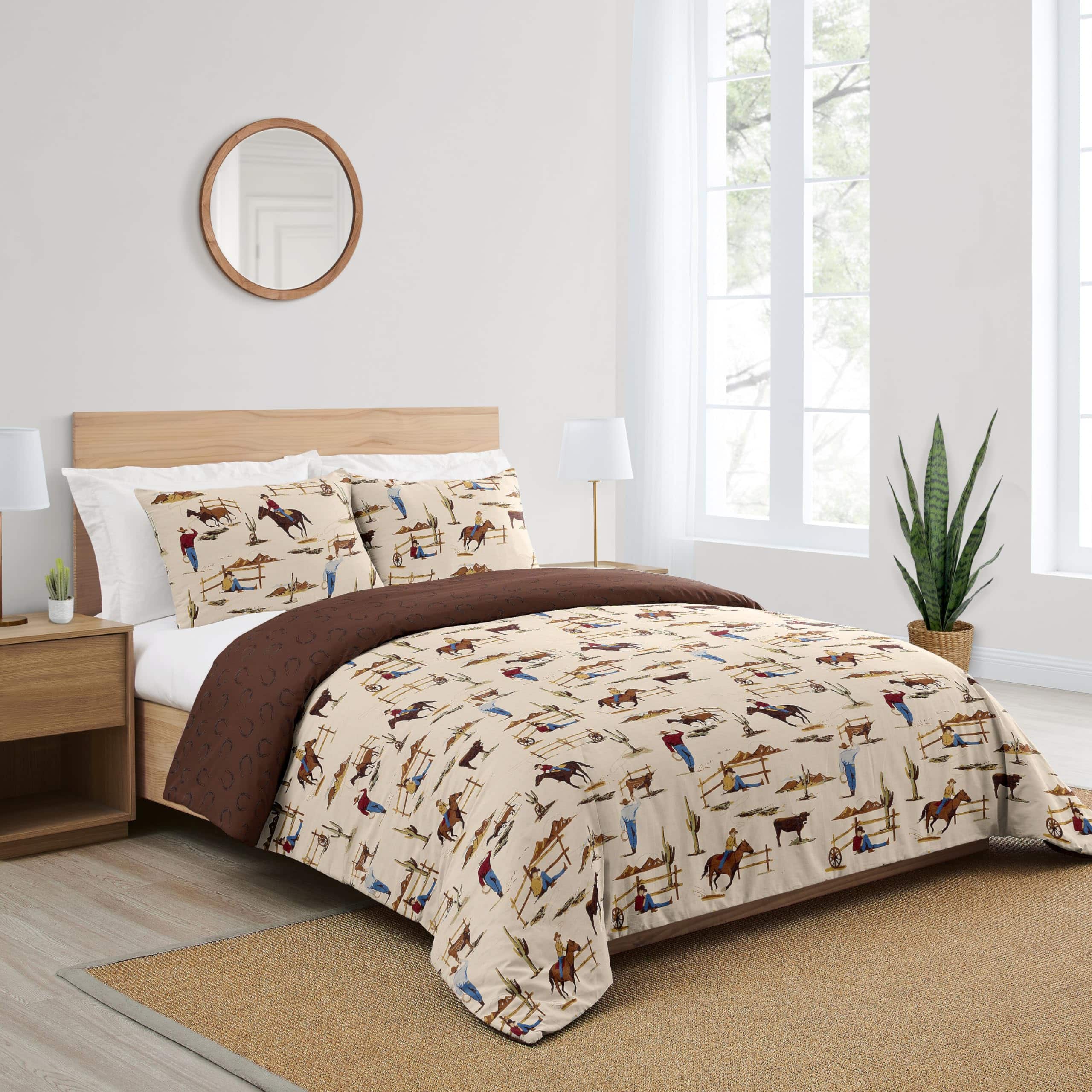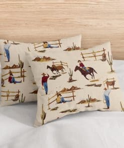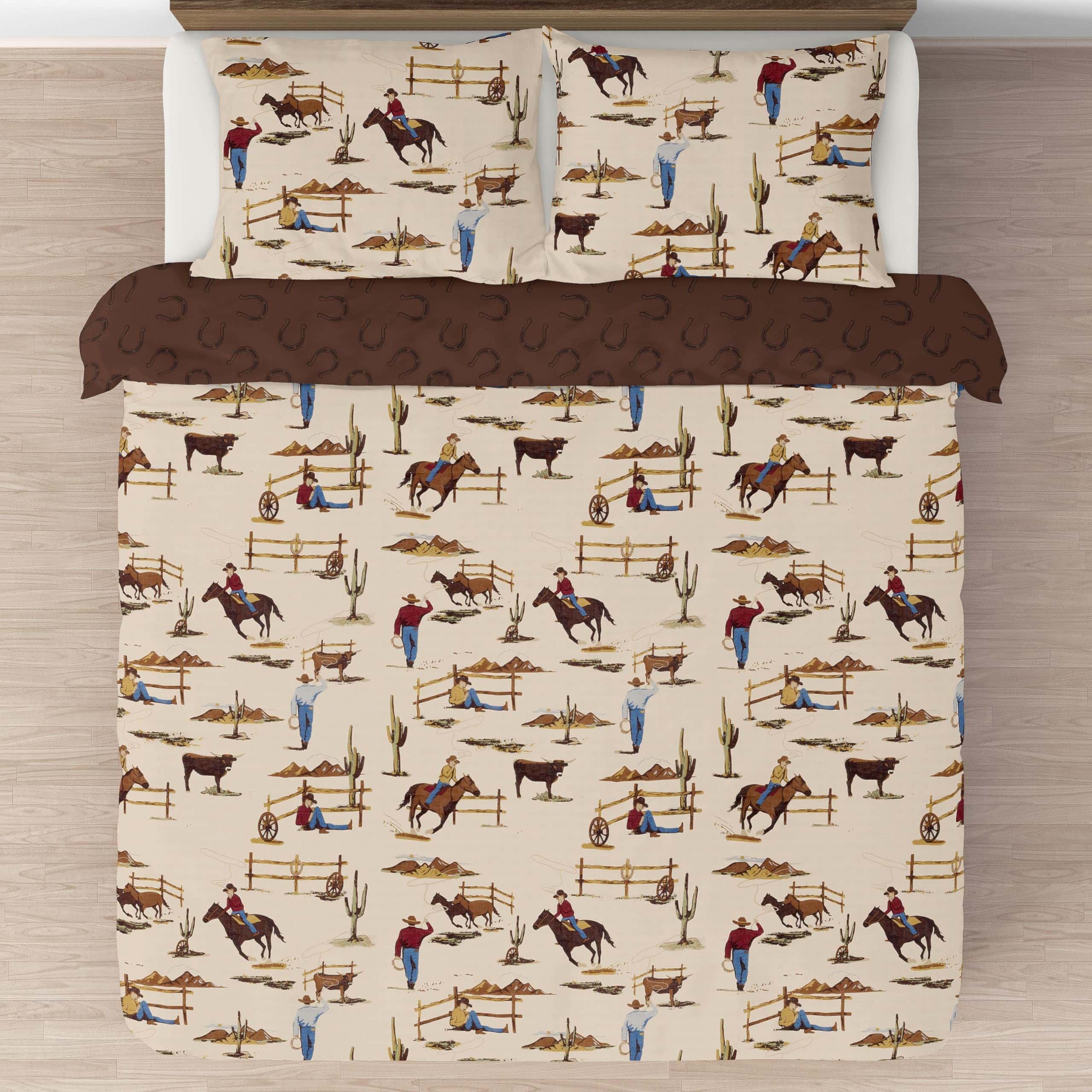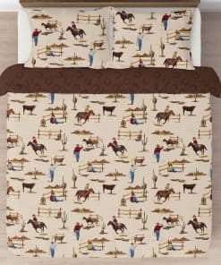 Este juego de 3 piezas cuenta con un diseño vintage inspirado en el estilo cowboy del suroeste, con caballos, ganado y cactus en un paisaje de atardecer en el desierto. El reverso presenta un estampado de herraduras a tono. Las fundas de almohada estándar también tienen el mismo estampado y reverso a coordinado con herraduras. Combina perfectamente con accesorios como cortinas, cestas de ropa, cortinas de baño y cojines a juego.
