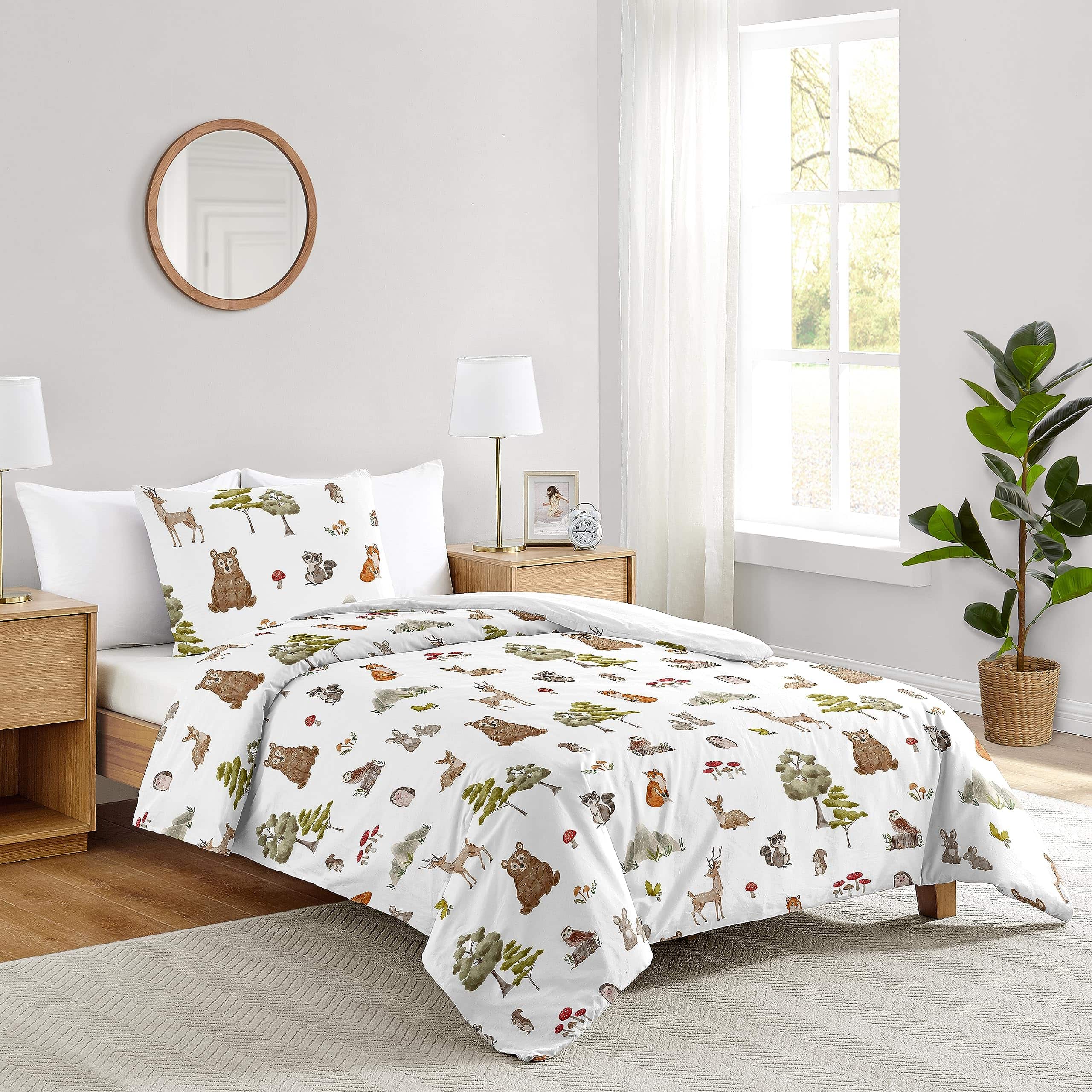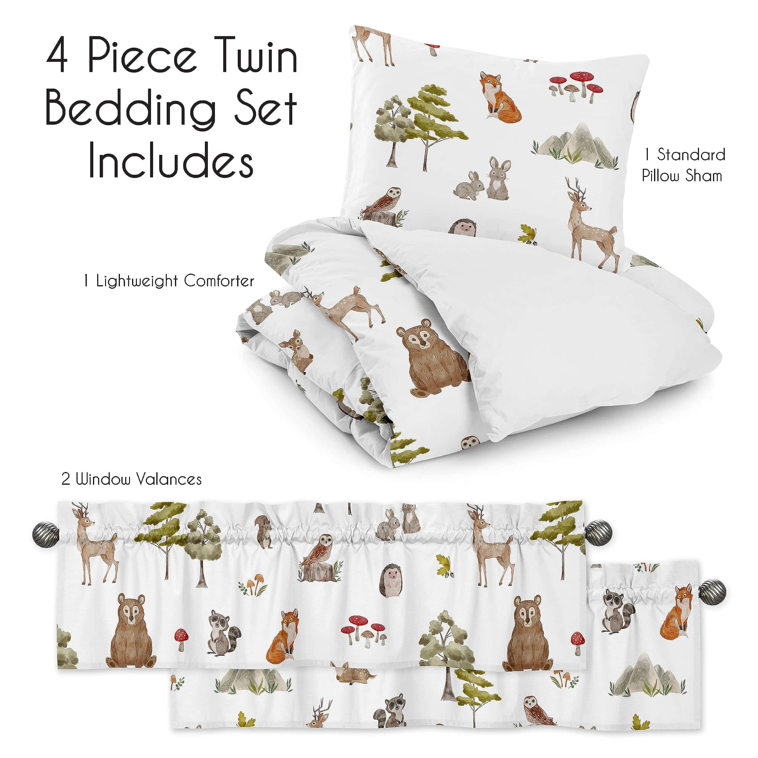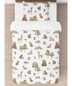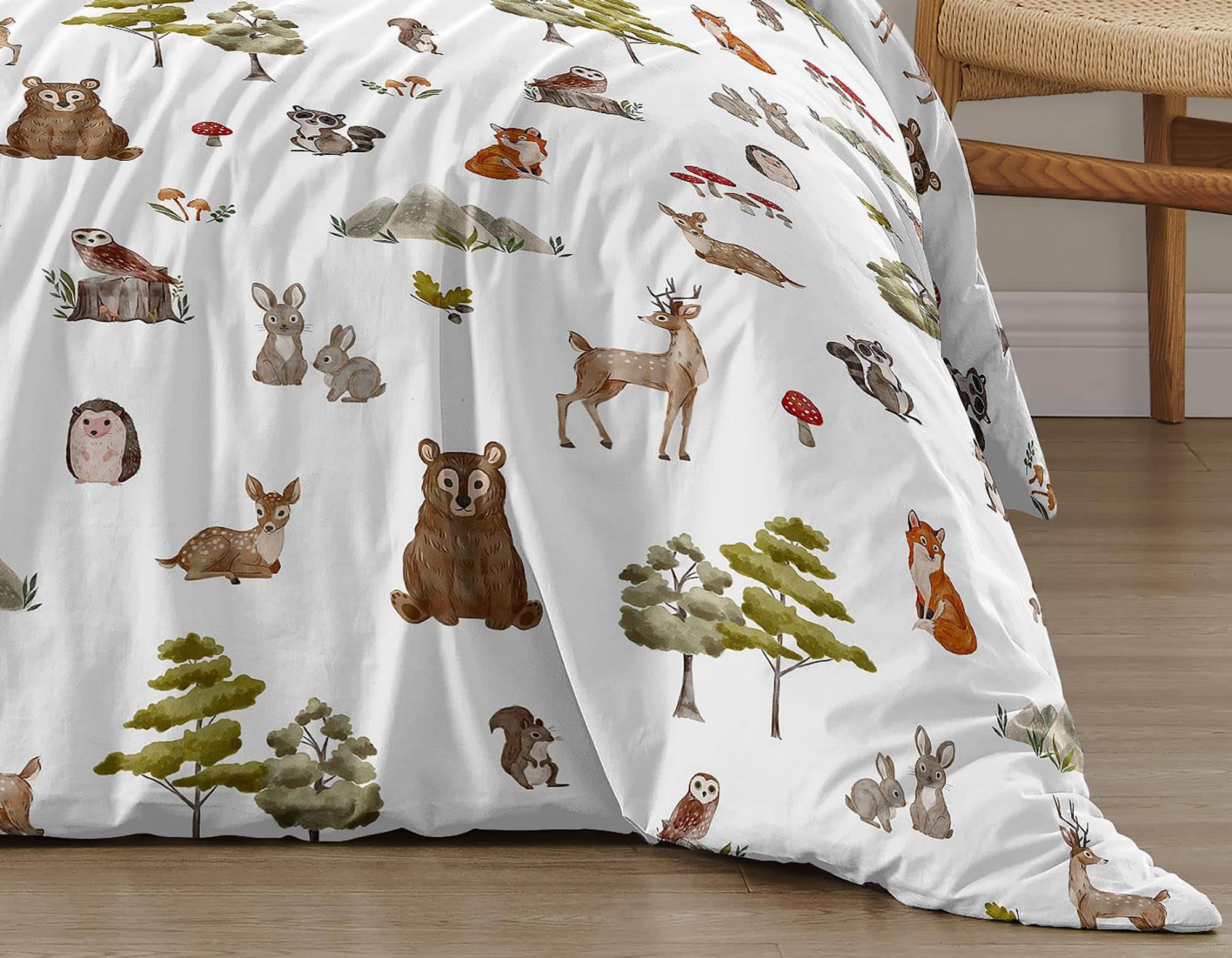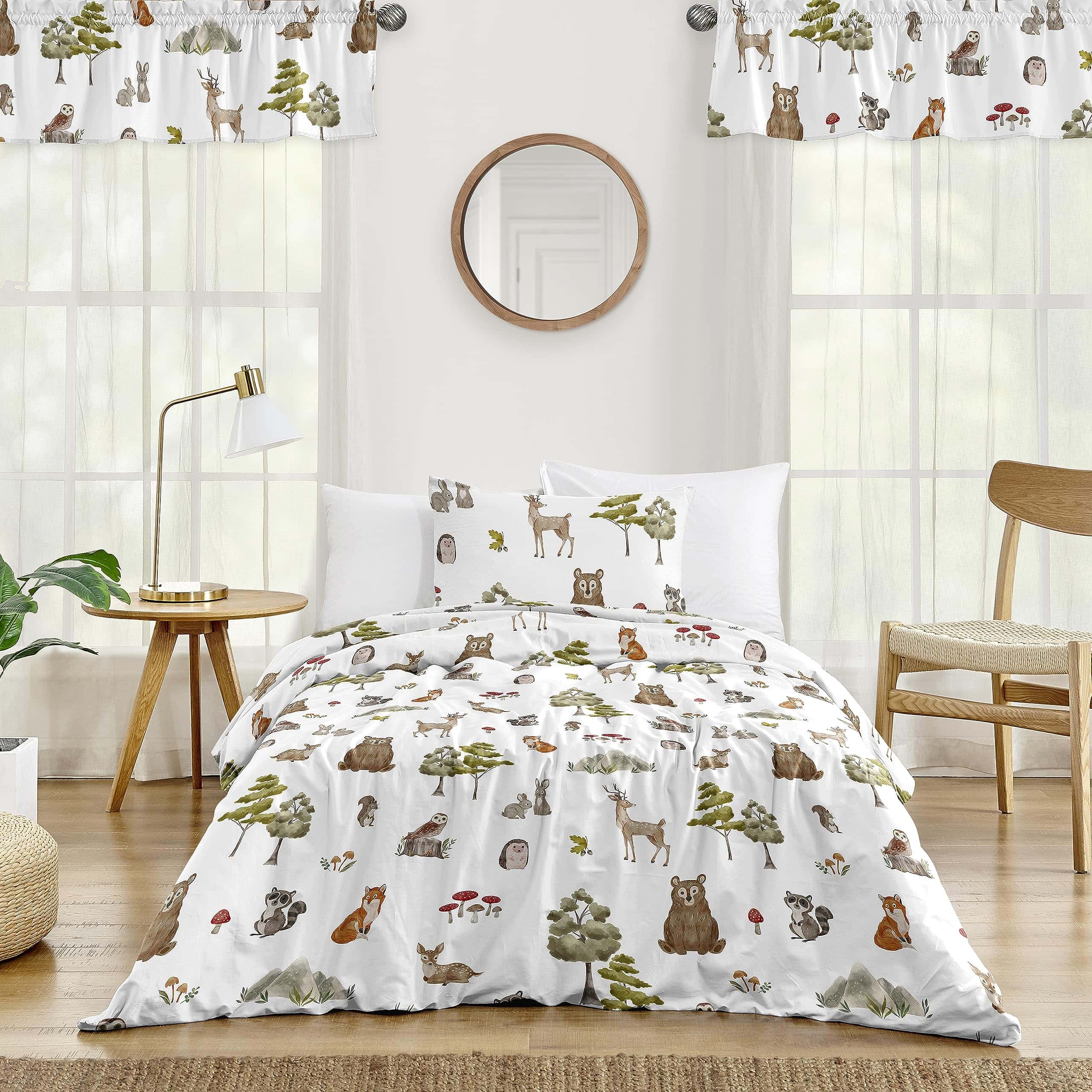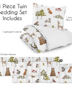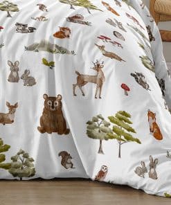 Este juego incluye animales de bosque en acuarela en tonos verde salvia, gris y marrón, incluyendo oso, zorro, erizo, ciervo y ardilla como amigos animales. Hecho de microfibra cepillada, esta colección es lavable a máquina. Apto para secadora a baja temperatura. Diseño que combina con accesorios como tratamientos para ventanas, cestos, cortinas de baño y cojines.