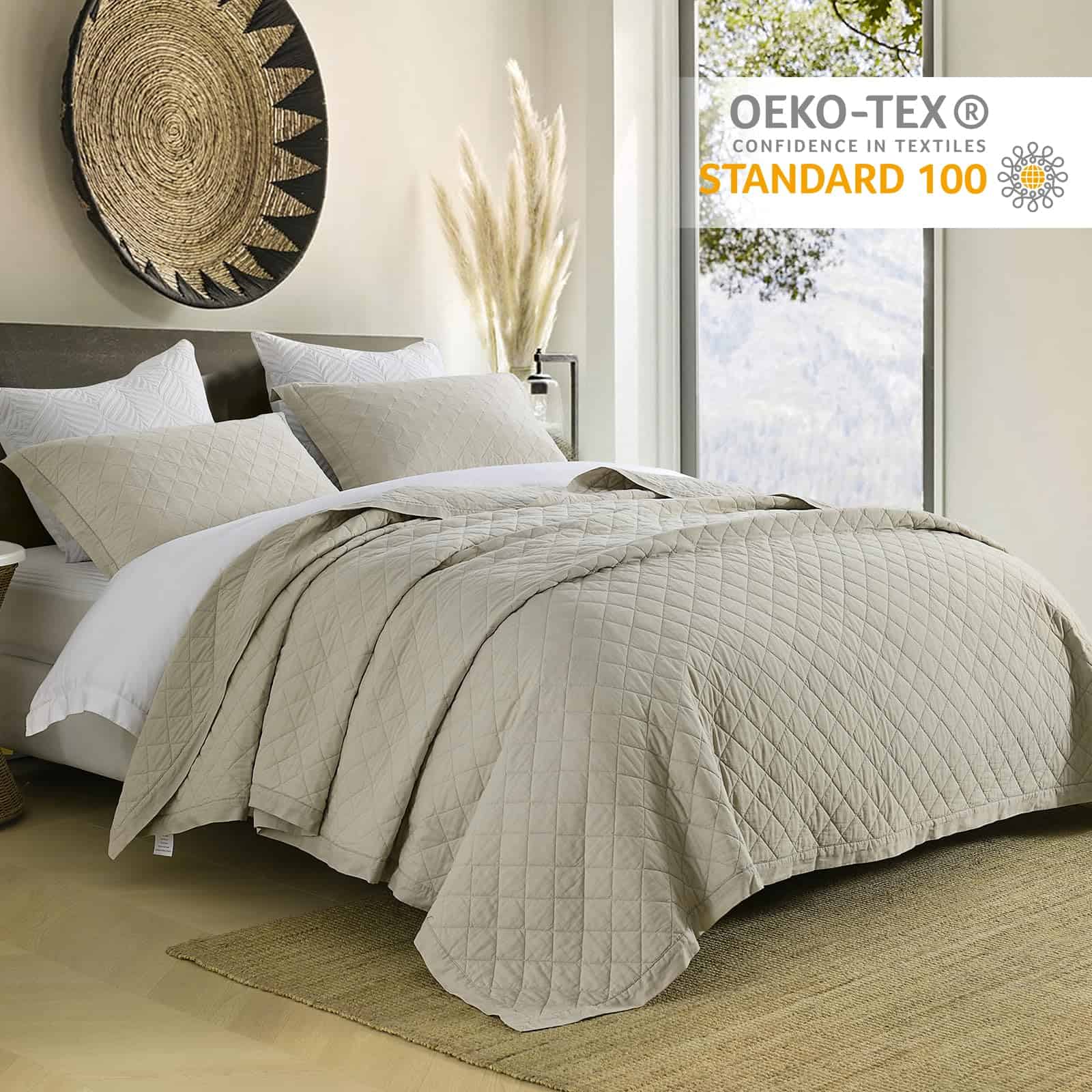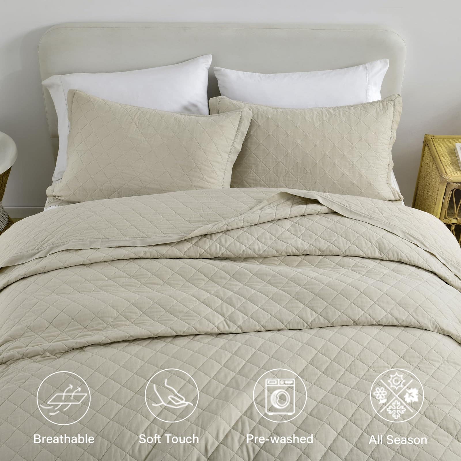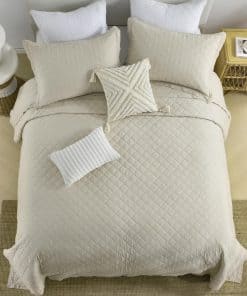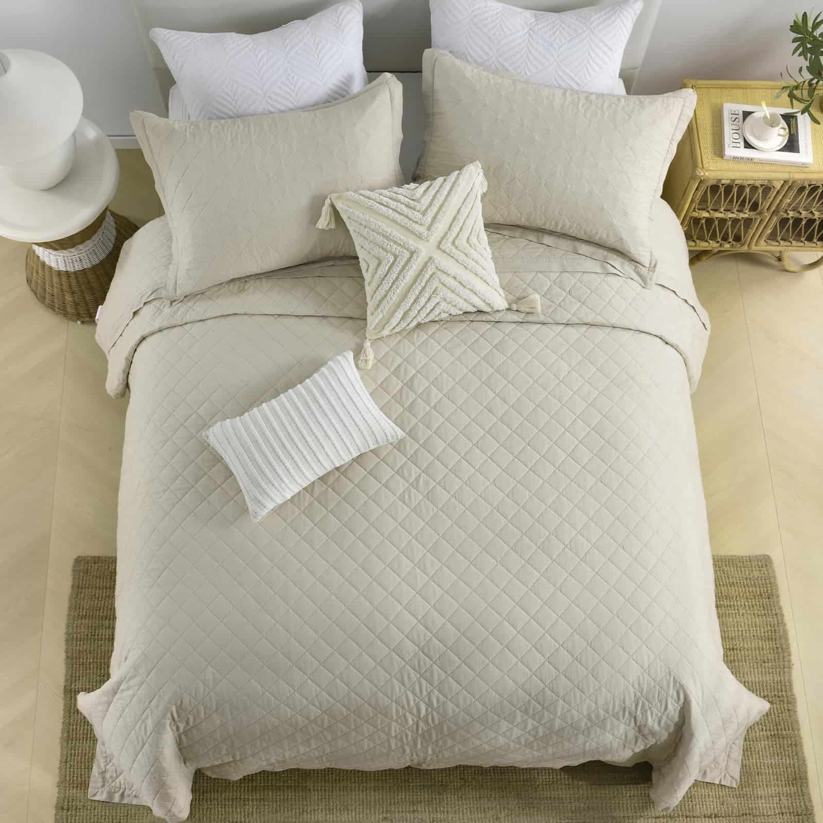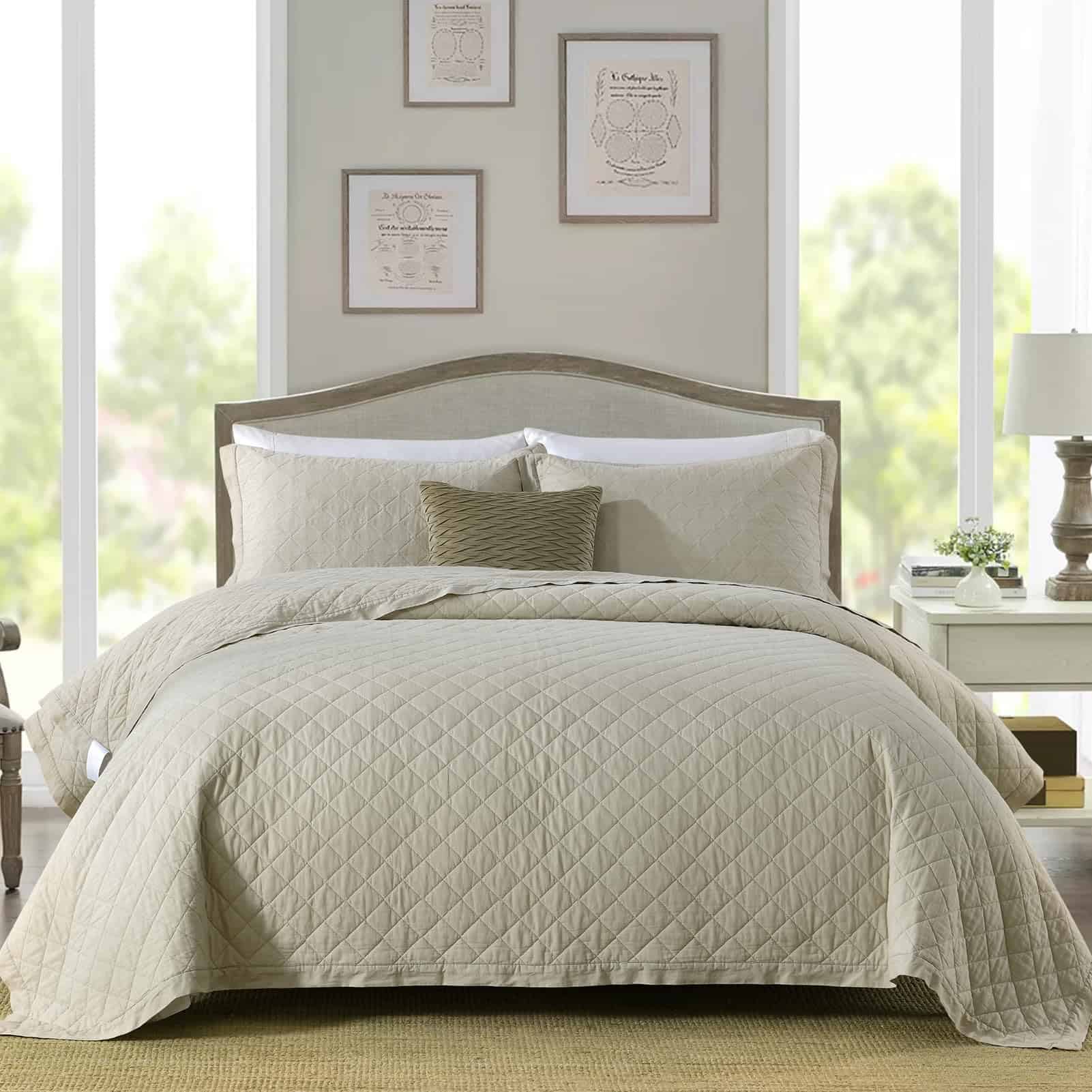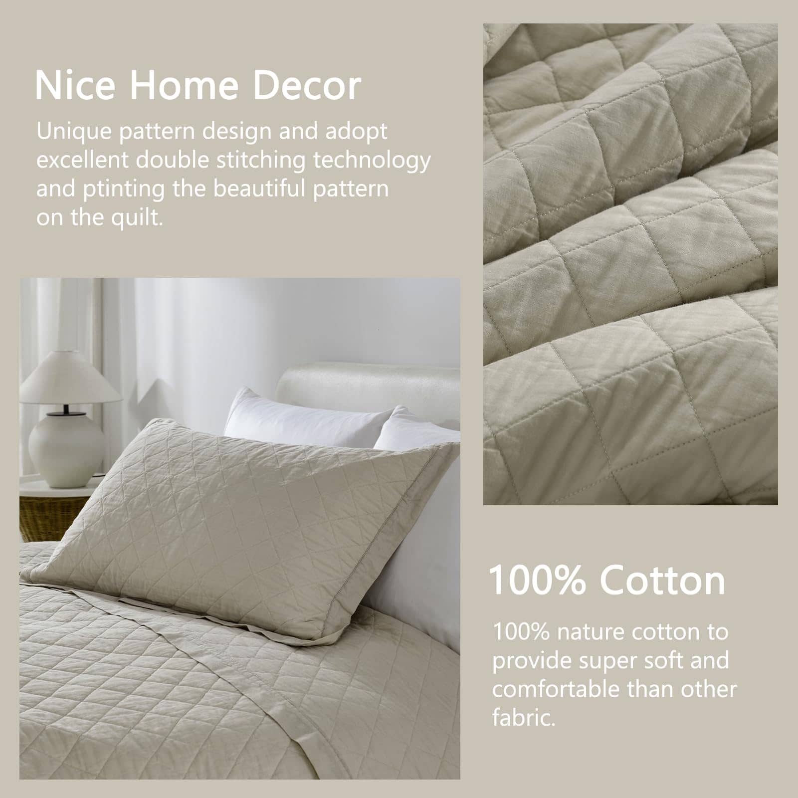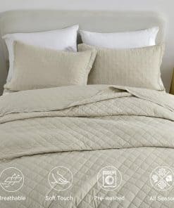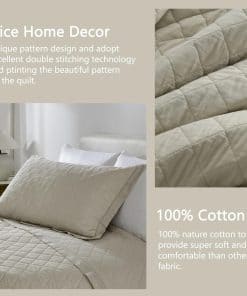 1. Cotton Quilt – El juego de edredón tamaño queen está hecho de 100% algodón, más saludable y transpirable. Suavidad, amigable con la piel y duradero. 2. Edredón Minimalista Simple – Diseño de patrón de diamantes y bordes hermosos y exquisitos, estilo simple con un color beige claro sólido, combinando bien con tu habitación y una bonita decoración para el hogar. El edredón es la mejor opción de regalo para tus padres y amigos. 3. Set de Ropa de Cama de 3 Piezas – Este juego de edredón tamaño queen certificado Standard 100 por OEKO-TEX viene con 1 edredón (90″ x 98″) y 2 fundas de almohada (20″ x 28″). 4. Edredón para Todas las Estaciones – Este juego de edredón está diseñado para ser utilizado durante todo el año, es ligero pero cálido como una manta acolchada en primavera y verano, como un edredón en otoño e invierno. Edredón ligero, lo suficientemente fresco para las temperaturas más cálidas. 5. Cuidado Fácil del Edredón – Lavar a máquina en agua fría, ciclo suave, secar a baja temperatura, no usar lejía. El juego de edredón tamaño queen de algodón seguirá siendo cálido y en la misma forma suave después de cada lavado. 6. Actitud de Confianza – Con una costura uniforme y densa, esta ropa de cama duradera garantiza la satisfacción duradera. Si, por algún motivo, no estás satisfecho, infórmanos de inmediato para una devolución sin problemas. ¡Añádelo a tu cesta ahora y experimenta la comodidad suprema de un edredón Finlonte!