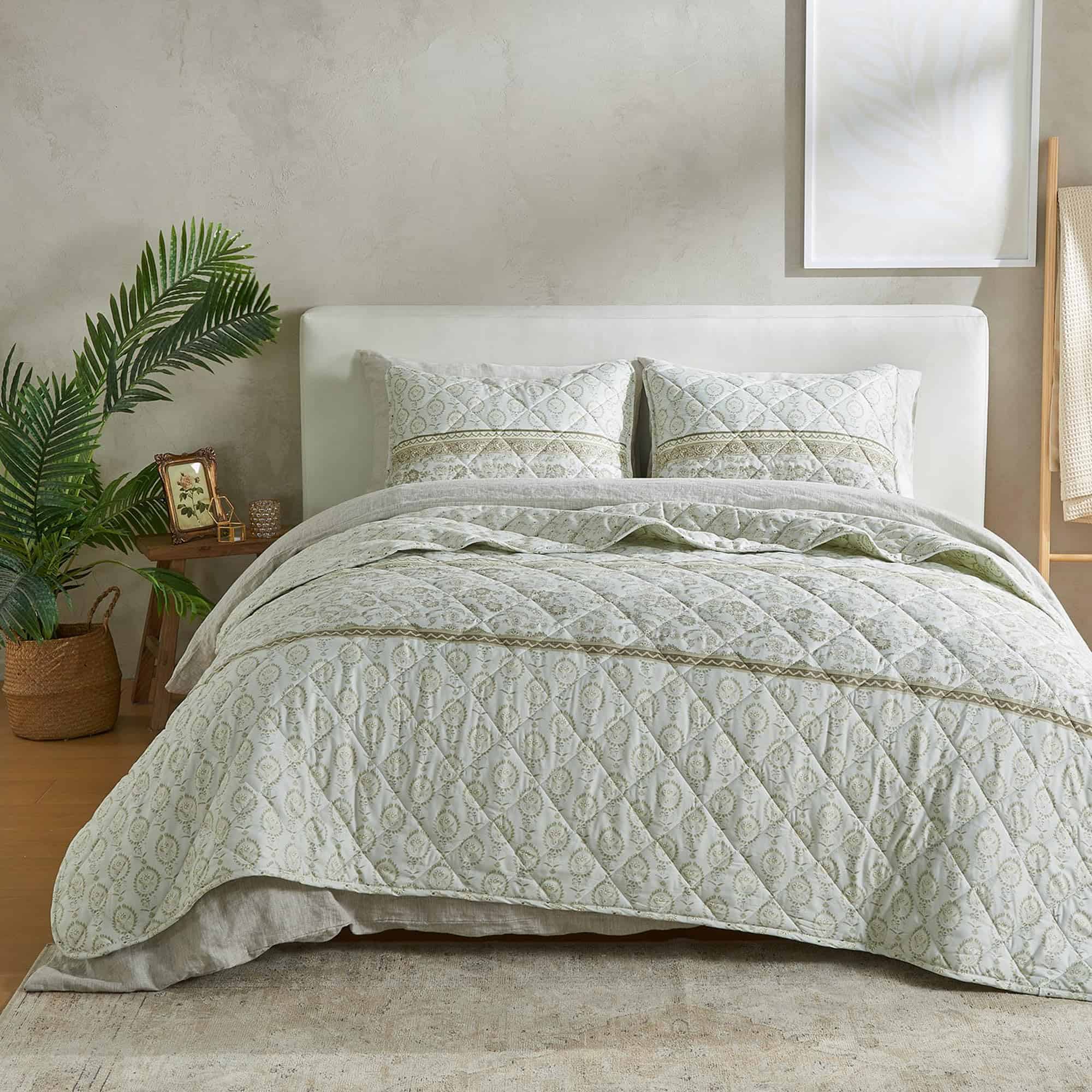 4. ¿Qué incluye este juego de ropa de cama? 1 colcha completa/queen. Este edredón completo/queen mide 90″ x 90″ y viene con dos fundas estándar de 26″ x 20″. Este edredón extra suave y duradero presenta una construcción gruesa, pero ligera que es perfecta para superponerse. Este juego de colcha de cama de todas las temporadas presenta un diseño de puntada único y floral vintage.