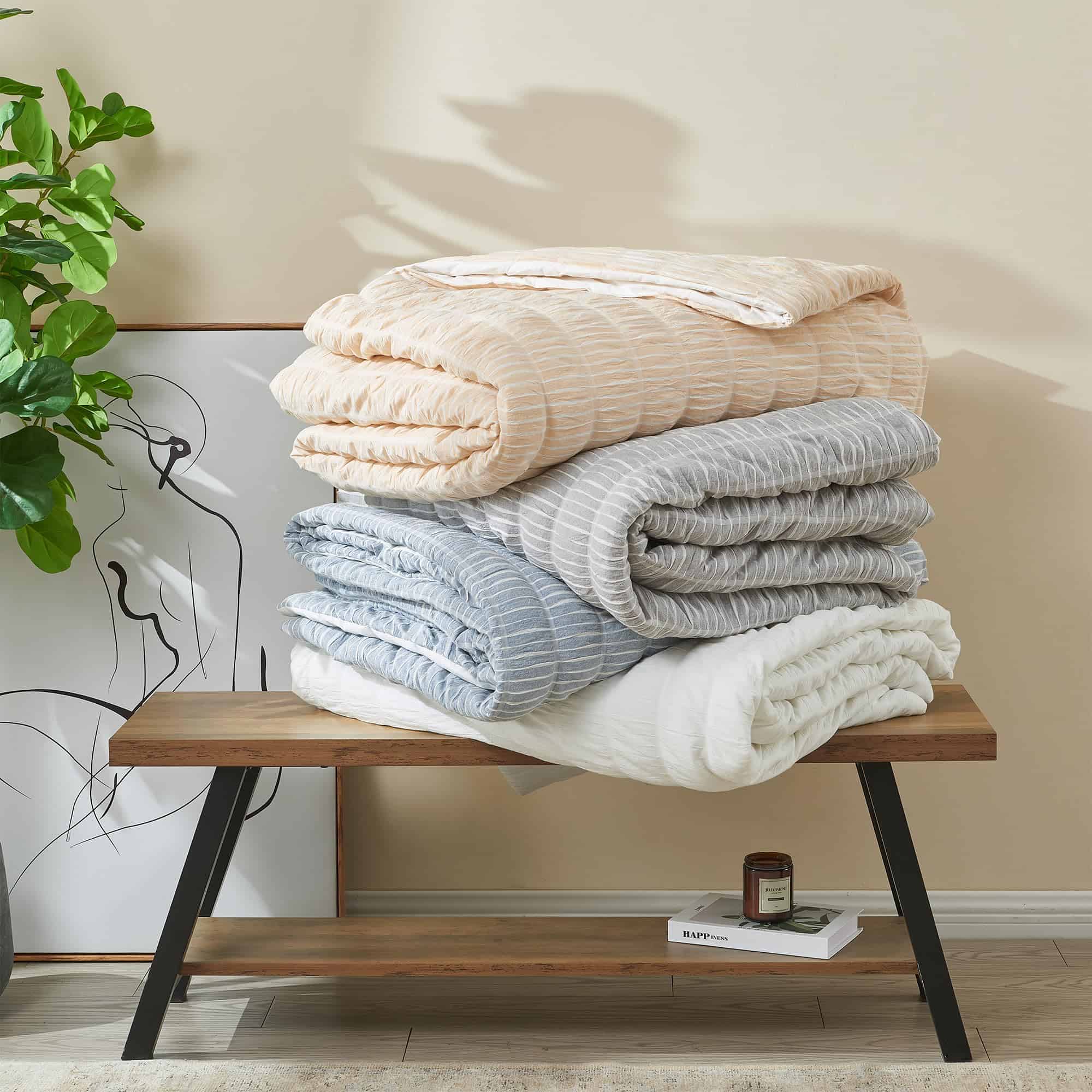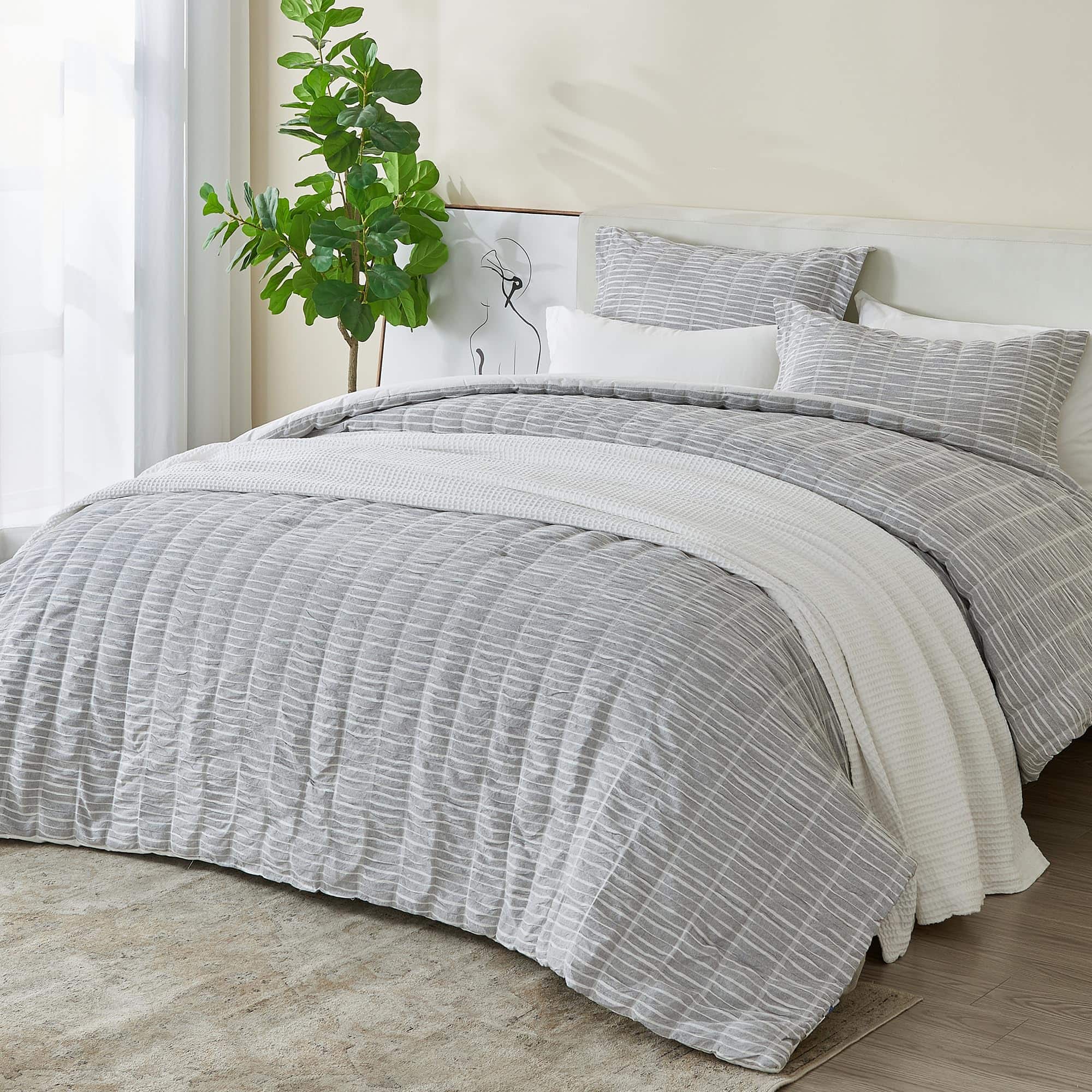 1. Diseños de Decoración de Habitación Simple y Preppy: Estos juegos de ropa de cama de edredón cuentan con un estilo inspirado que coincidirá con múltiples estéticas de decoración de dormitorio. Este set tiene un diseño de rayas simple con un acabado abullonado que agrega textura a tu cama. Esta colección cuenta con una gama de colores simples que combinarán fácilmente con tu decoración del hogar. 2. Juegos de Ropa de Cama Ultra Suaves: Este juego de edredón cuenta con una suave carcasa de 100% algodón, que proporciona suavidad, textura y durabilidad. Este set de ropa de cama es un esencial de dormitorio y se suavizará con cada lavado. La sensación ligera de este edredón y su diseño inspirador lo hacen ideal para usar durante todo el año. 3. Duradero y Fácil de Cuidar: No temas lavar este juego de edredón. Estos sets son lavables a máquina. Simplemente lava con agua fría y seca a baja temperatura. Incluso puedes planchar tibio si es necesario para lograr esa sensación de ropa de cama de hotel. Este algodón duradero y de alta calidad está diseñado para un uso duradero y disfrute y se suavizará con cada lavado, un esencial para el dormitorio. 4. ¿Qué incluye este juego de edredón? 1 edredón king. Este edredón mide 104 x 90 y viene con dos fundas de almohada estándar. Este edredón extra suave y duradero cuenta con una construcción gruesa, pero ligera que es perfecta para superponer. Este juego de todo temporada es un accesorio perfecto para el dormitorio que refrescará tu decoración. 5. Enfoque en el Cliente: La satisfacción del cliente es de suma importancia para nosotros. Estamos seguros de que te encantarán nuestros productos, pero si no estás 100% satisfecho con este edredón, nuestro equipo de servicio al cliente trabajará contigo para solucionarlo. Tenemos muchos productos disponibles. Encuentra tu combinación de ropa de cama perfecta en una de nuestras colecciones.