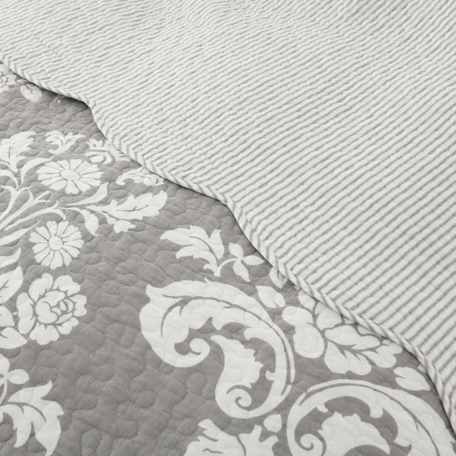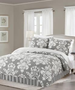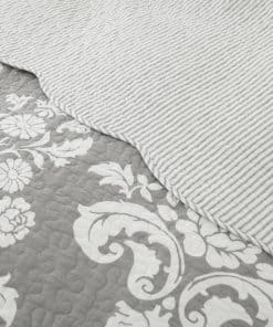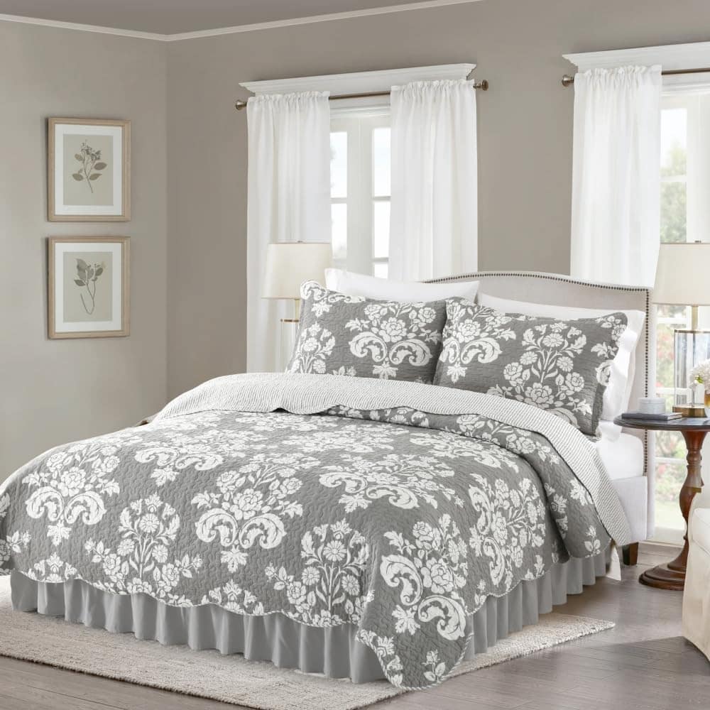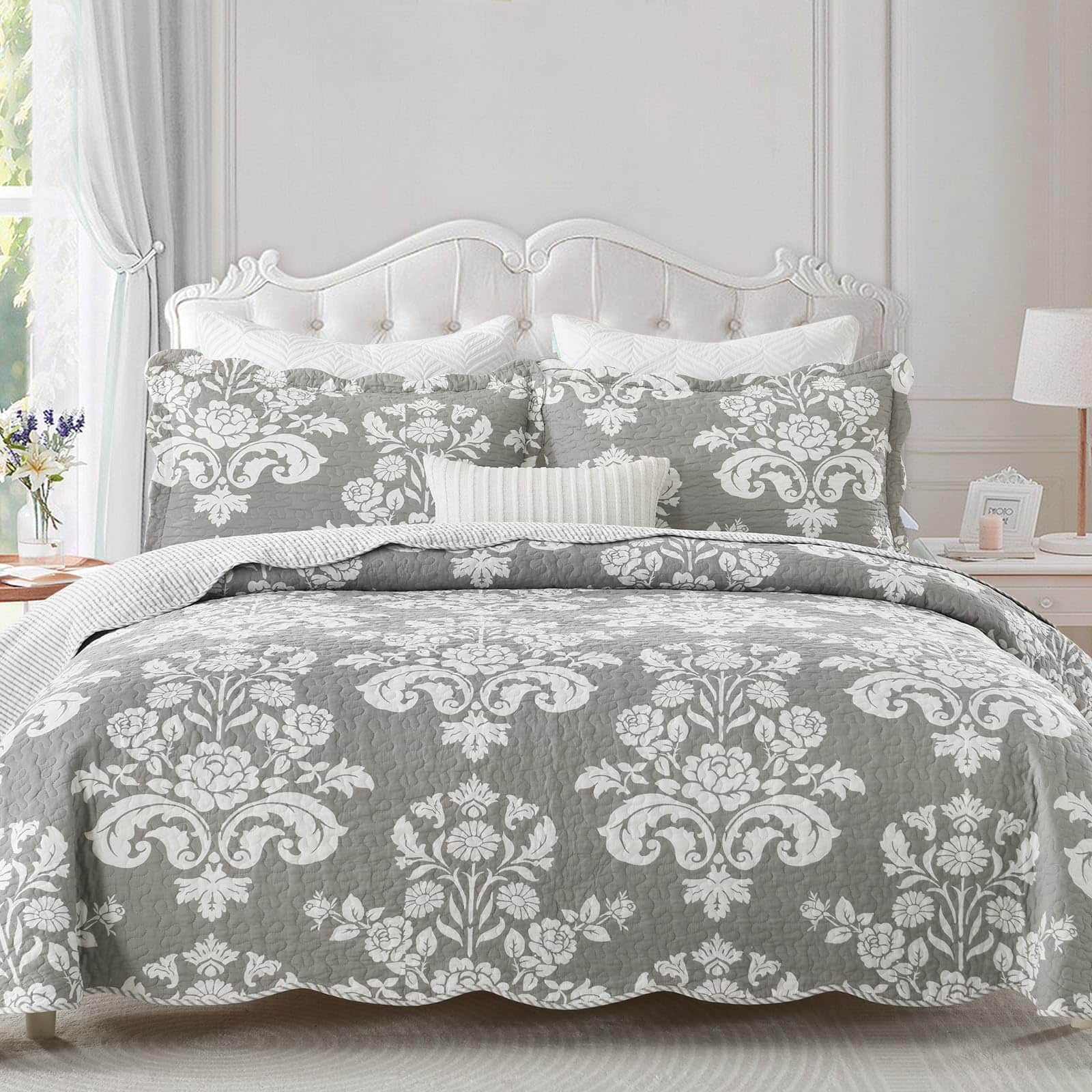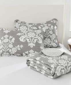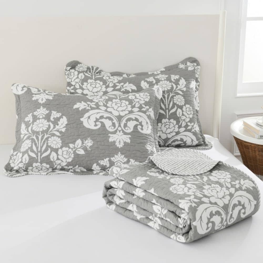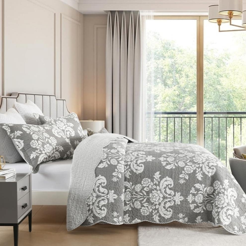 2. Diseño Floral Gris: Este juego de edredón tamaño queen presenta un impresionante diseño de flores en el frente y un diseño a rayas en la parte trasera. Una combinación de colores gris neutro para hacer que tu dormitorio luzca más elegante.