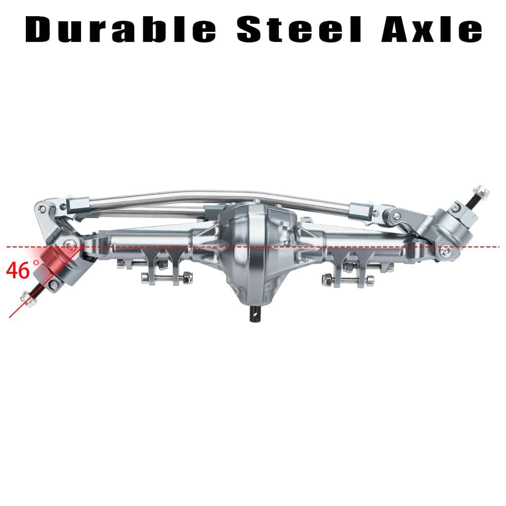 1. Compatibilidad: El eje RC es compatible con los accesorios de actualización de 1/10 Axial SCX10 I II 90046 90047 (Nota: NO es compatible con SCX10 III). 2. Alta Calidad: Los alojamientos del eje están fabricados en aluminio premium 6061 con ejes de transmisión de acero endurecido y enlace de dirección de acero inoxidable, mecanizado CNC para una mayor precisión, resistencia y precisión, y se pueden actualizar fácilmente desde las piezas originales. 3. Estabilidad mejorada: El diseño del C-hub integrado permite una apariencia mucho más escalar, soportes de choque en doble cizalla, soporte panhard integrado y soportes de enlace superior incorporados en la tapa diferencial para proporcionar el máximo espacio libre y mayor claridad de enlace superior para una mayor capacidad de recorrido de la suspensión. 4. Alta simulación: Este eje delantero y trasero de crawler de RC 1/10 de alta simulación tiene un eje de inclinación y tiene una excelente capacidad de paso. Dirección grande de 46 grados, inclinación de 8 grados, engranajes de acero, relación de engranajes: 30T/8T (3.75:1). 5. Lo que obtienes: 1 Eje delantero, 1 Eje trasero, 1 Enlace de dirección, 1 Montaje de servo, 1 Kit de tornillos.