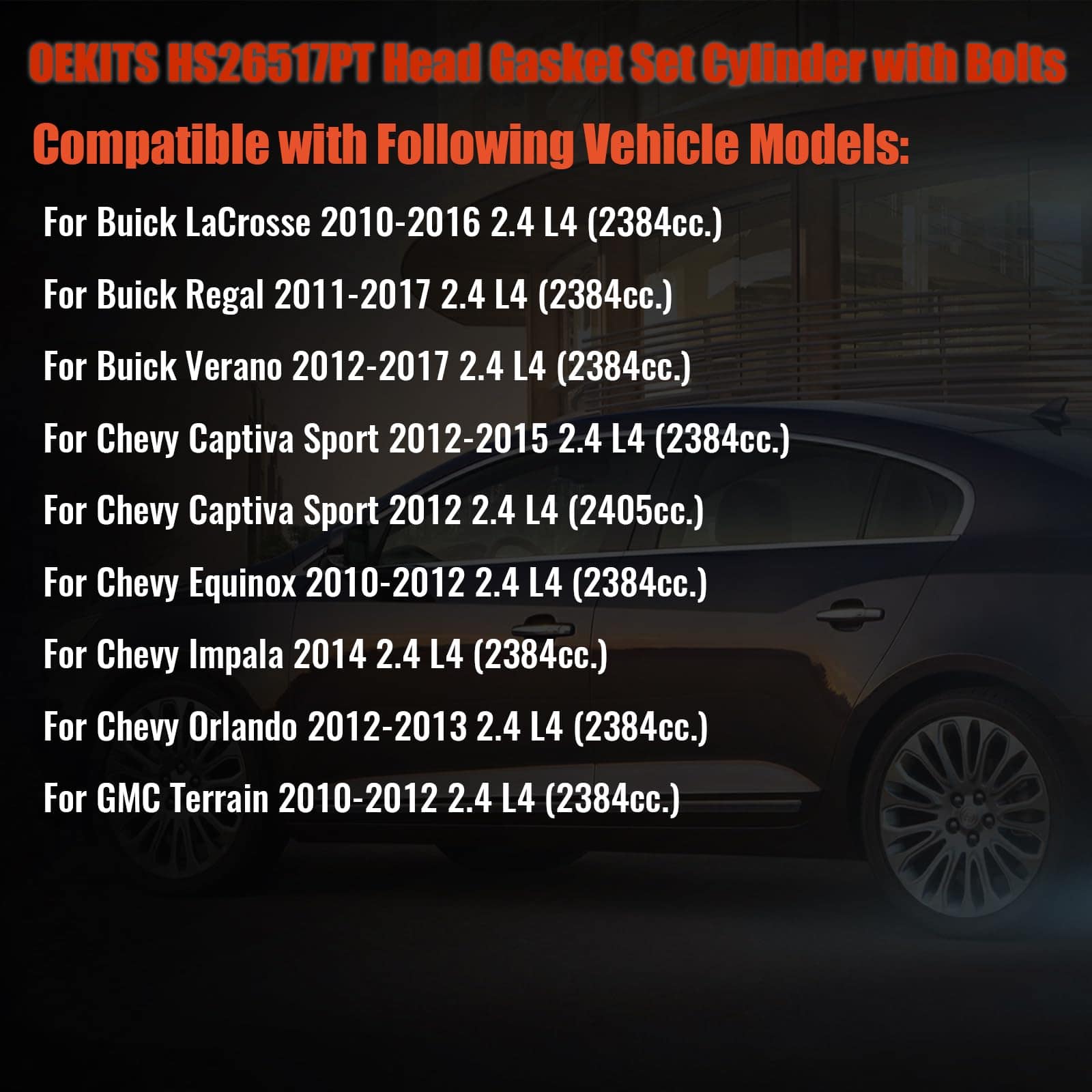 2. Ajuste HS26517PT ES72196 Juego de empaquetadura de culata con pernos de culata Compatible con: para Buick LaCrosse 2010-2016 2.4 L4 (2384cc.), para Buick Regal 2011-2017 2.4 L4 (2384cc.), para Buick Verano 2012-2017 2.4 L4 (2384cc.), para Chevy Captiva Sport 2012-2015 2.4 L4 (2384cc.), para Chevy Captiva Sport 2012 2.4 L4 (2405cc.), para Chevy Equinox 2010-2017 2.4 L4 (2384cc.), para Chevy Impala 2014 2.4 L4 (2384cc.), para Chevy Orlando 2012-2013 2.4 L4 (2384cc.), para Chevy Malibu 2.4 L4 2013-2014 (2384cc.), para GMC Terrain 2010-2017 2.4 L4 (2384cc.).