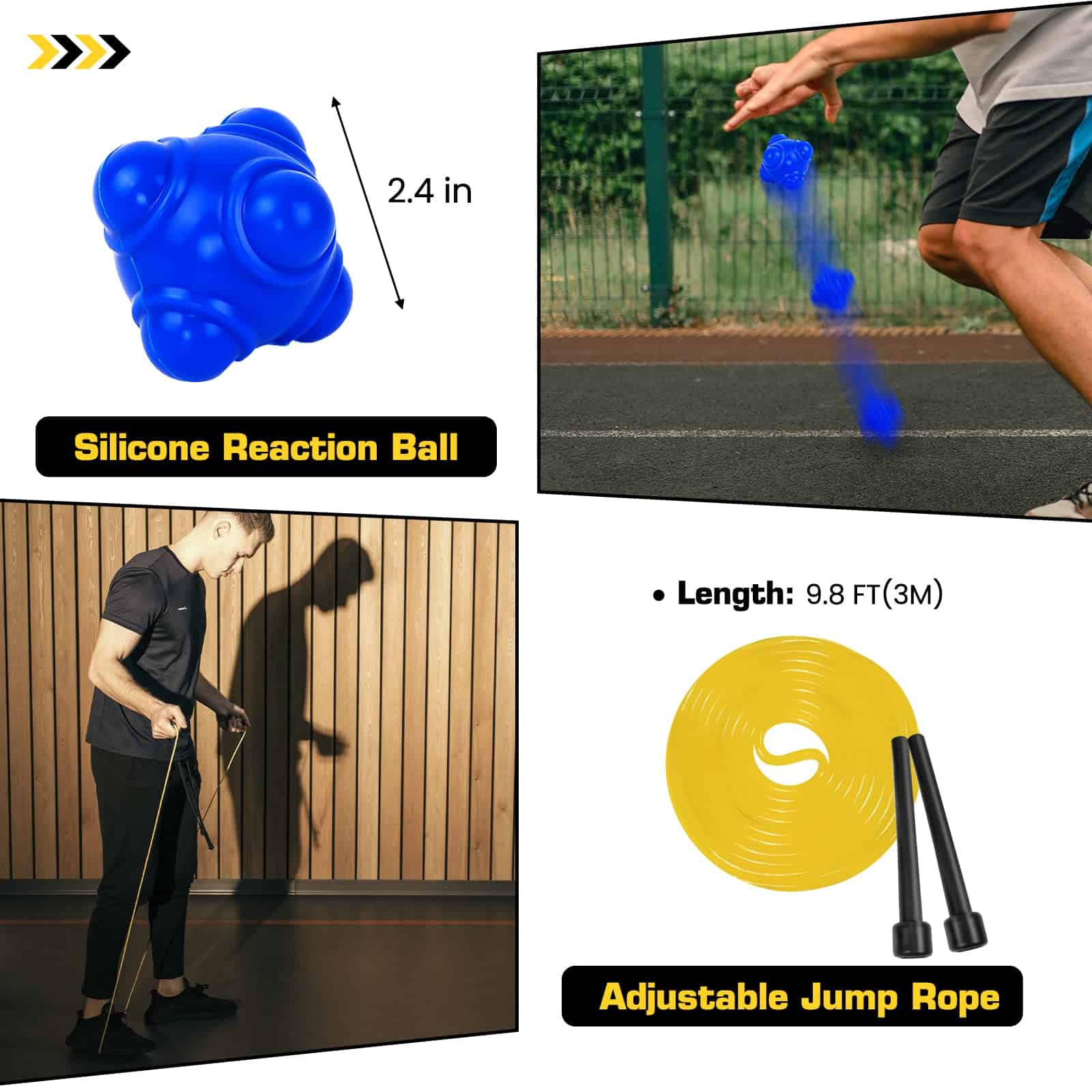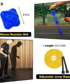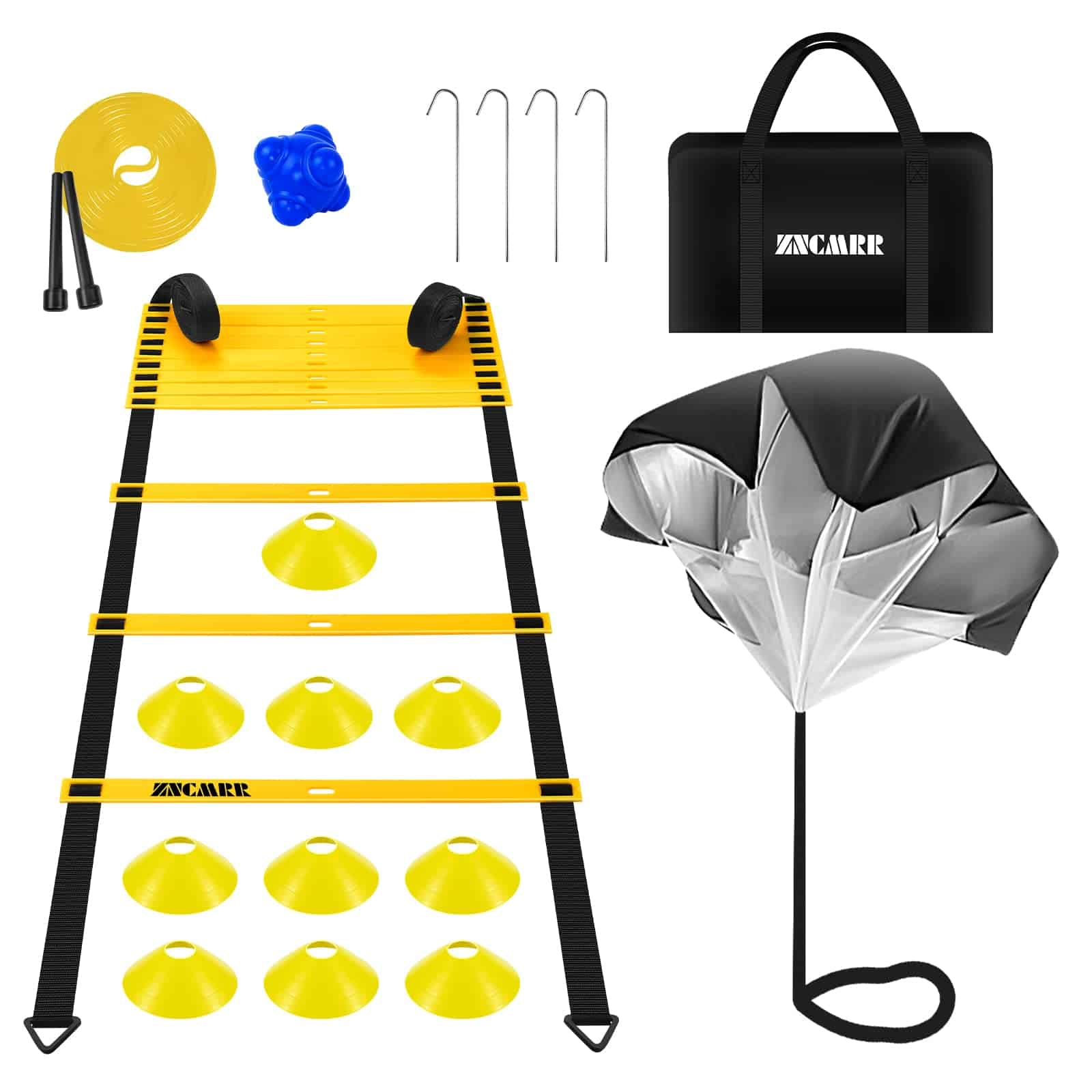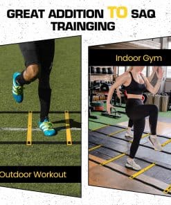 4. Entrenamiento variado – Usa las estacas de ACERO incluidas para mantener la escalera de entrenamiento en su lugar. Coloca CONOS en el patrón que desees. Realiza entrenamientos adicionales con CUERDA PARA SALTAR y ejercita la coordinación mano-ojo con la PELOTA DE REACCIÓN. Mezcla todo para que los entrenamientos sean divertidos.