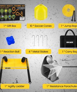 1. Juego de entrenamiento de velocidad y agilidad: el kit incluye 1 escalera de agilidad, 1 paracaídas de resistencia, 1 cuerda para saltar, 4 estacas terrestres, 10 conos deportivos, 1 bolsa de transporte y 1 caja de almacenamiento. Perfecto para quienes buscan movimientos ágiles, resistencia mejorada, buenos músculos de pierna, pérdida de peso y estar en forma.