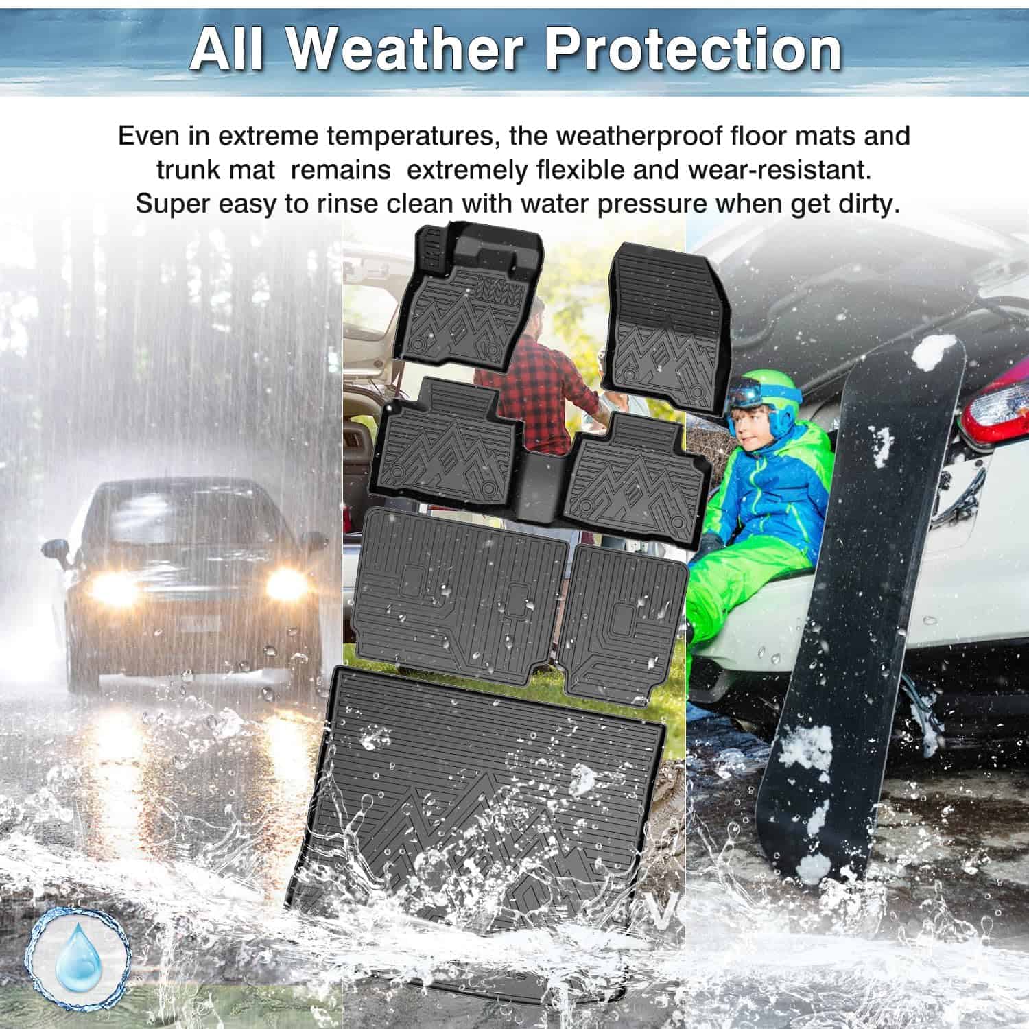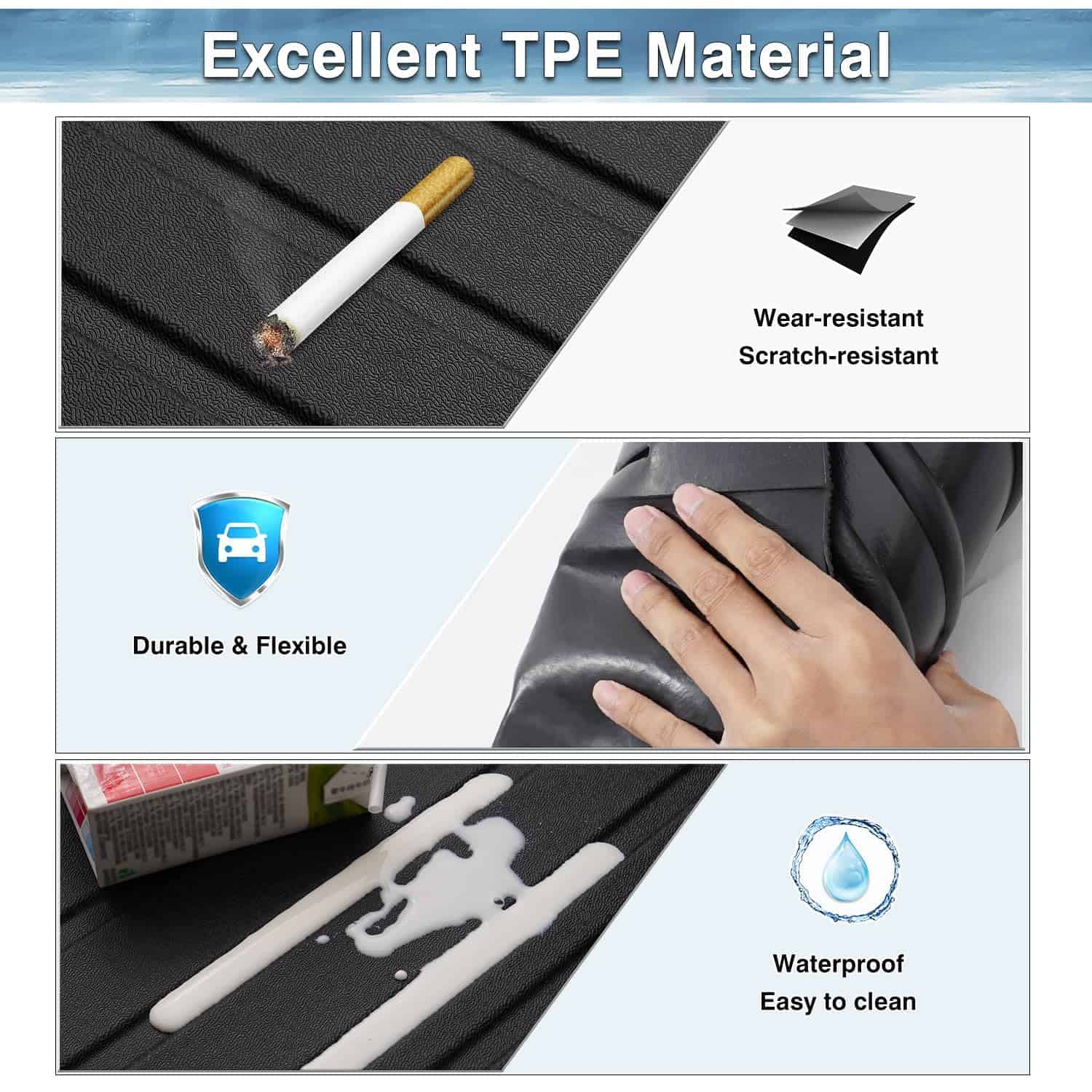3. Antideslizante y atrapa desechos: La alfombra de maletero texturizada y los forros para pisos antideslizantes pueden evitar que los elementos se deslicen durante el viaje. La alfombra para maletero resistente al clima y las alfombras para pisos tienen canales únicos que pueden atrapar efectivamente arena, agua, lodo, suciedad, lluvia y barro. 4. Laterales bloqueadores de derrames: La alfombrilla de maletero y los forros para pisos tienen un labio elevado alrededor para evitar que líquidos y desechos lleguen a su piso original. Asegúrese de que el desorden permanezca en los forros y lejos de su piso limpio original. 5. Conveniente y fácil de limpiar: La alfombra para maletero resistente al clima y resistente a las manchas se limpia fácilmente pasando un paño húmedo o enjuagándola con agua directamente. Atención: los forros están doblados para el envío. Simplemente colóquelo bajo el sol para ayudar a quitar los pliegues.
