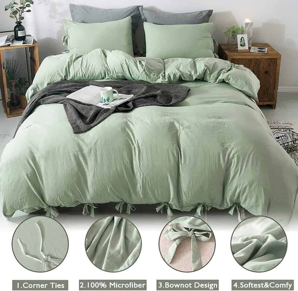 2. En lugar de una cremallera tradicional, nuestros diseñadores diseñaron una funda de edredón con moño más elegante y bonita. El fondo de nuestra funda de edredón con moño tiene un sobre de tela para sostener el edredón. ¿Todavía te preocupa que el edredón se enrolle por la noche? Hay pequeños lazos en la esquina para mantener el edredón en su lugar, sin miedo a que se agrupe en una bola.