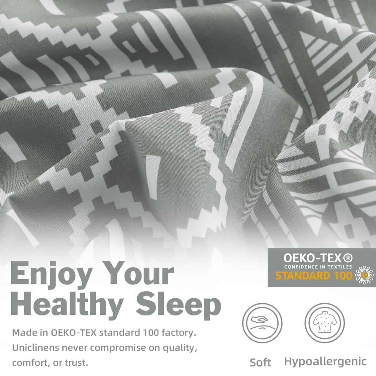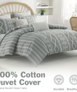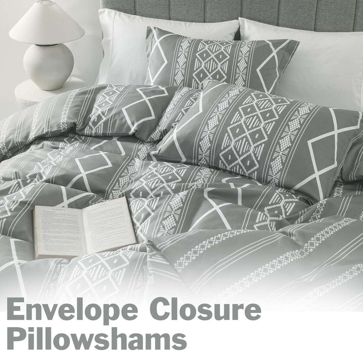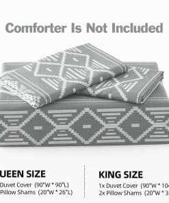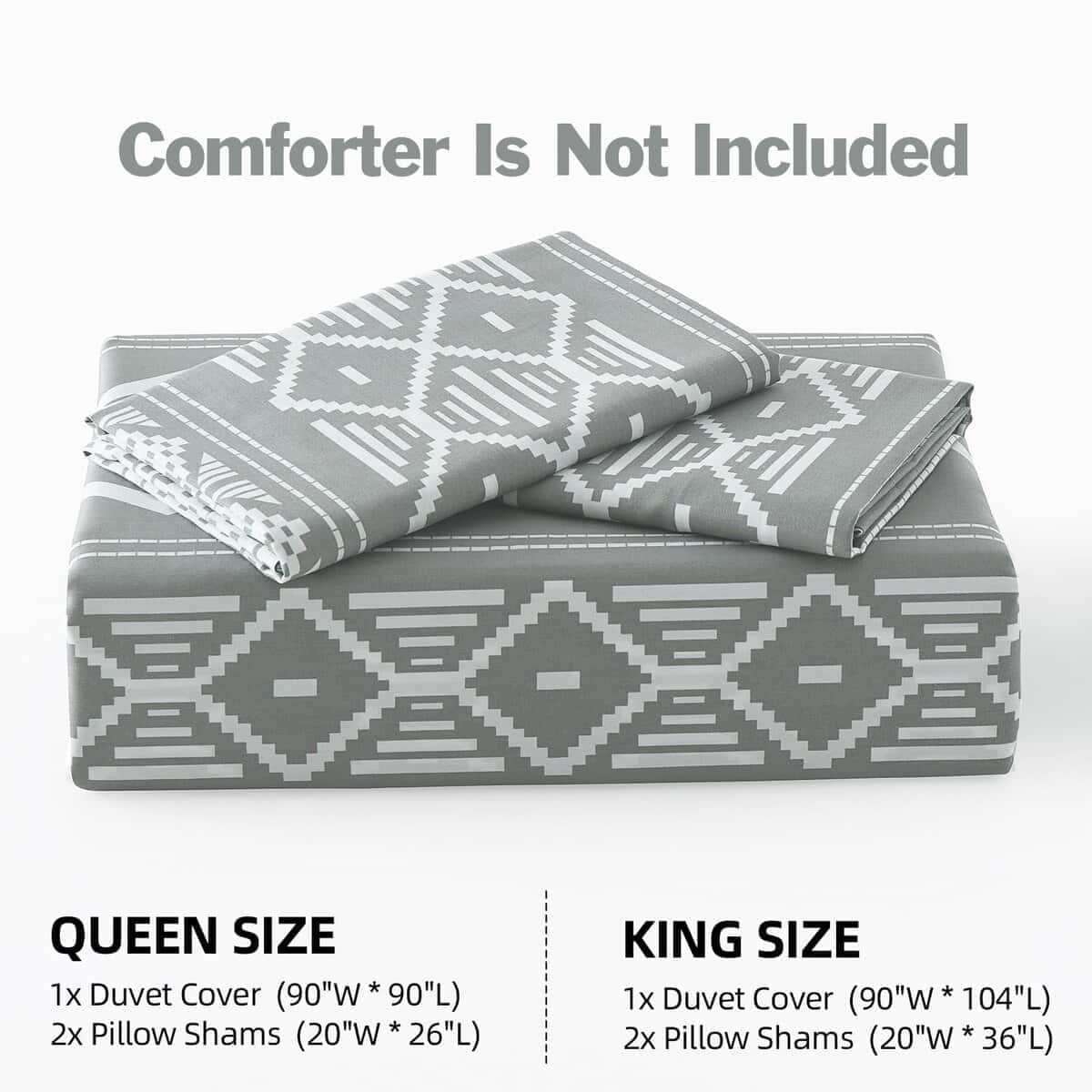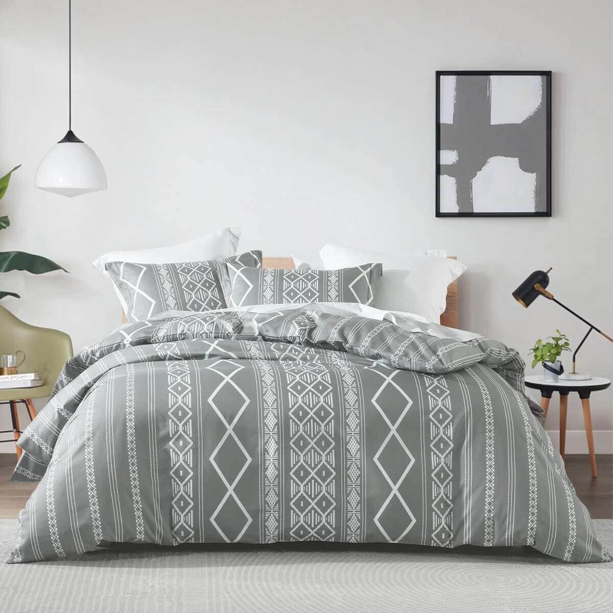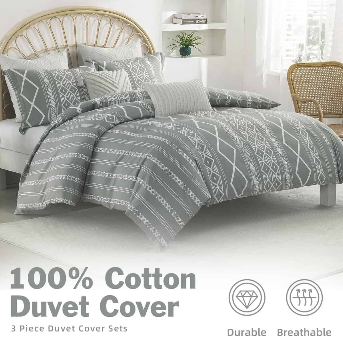 Juego de Funda de Edredón Boho EWlinens Tamaño Queen – Gris Funda de Edredón Geométrico de Cama de 3 Piezas Juego de Ropa de Cama Estampado Bohemio de Rayas de Algodón con Cierre de Cremallera y Lazos en las Esquinas, 90″x90″