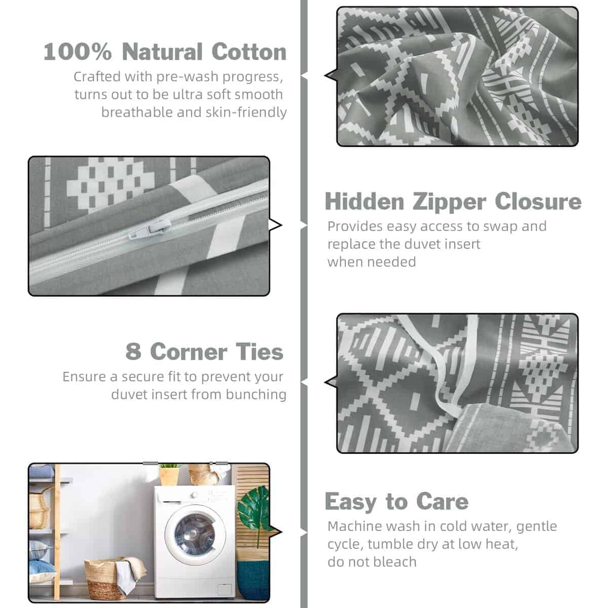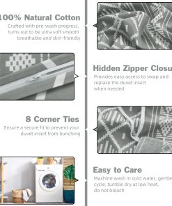 La funda de edredón cuenta con una cremallera oculta que es resistente y duradera, permitiendo insertar y quitar el edredón fácilmente. Además, cuenta con ocho lazos en las esquinas para asegurar que el edredón se mantenga en su lugar. Este conjunto de ropa de cama ayudará a proteger tu edredón del polvo y el desgarro, prolongando su vida útil.