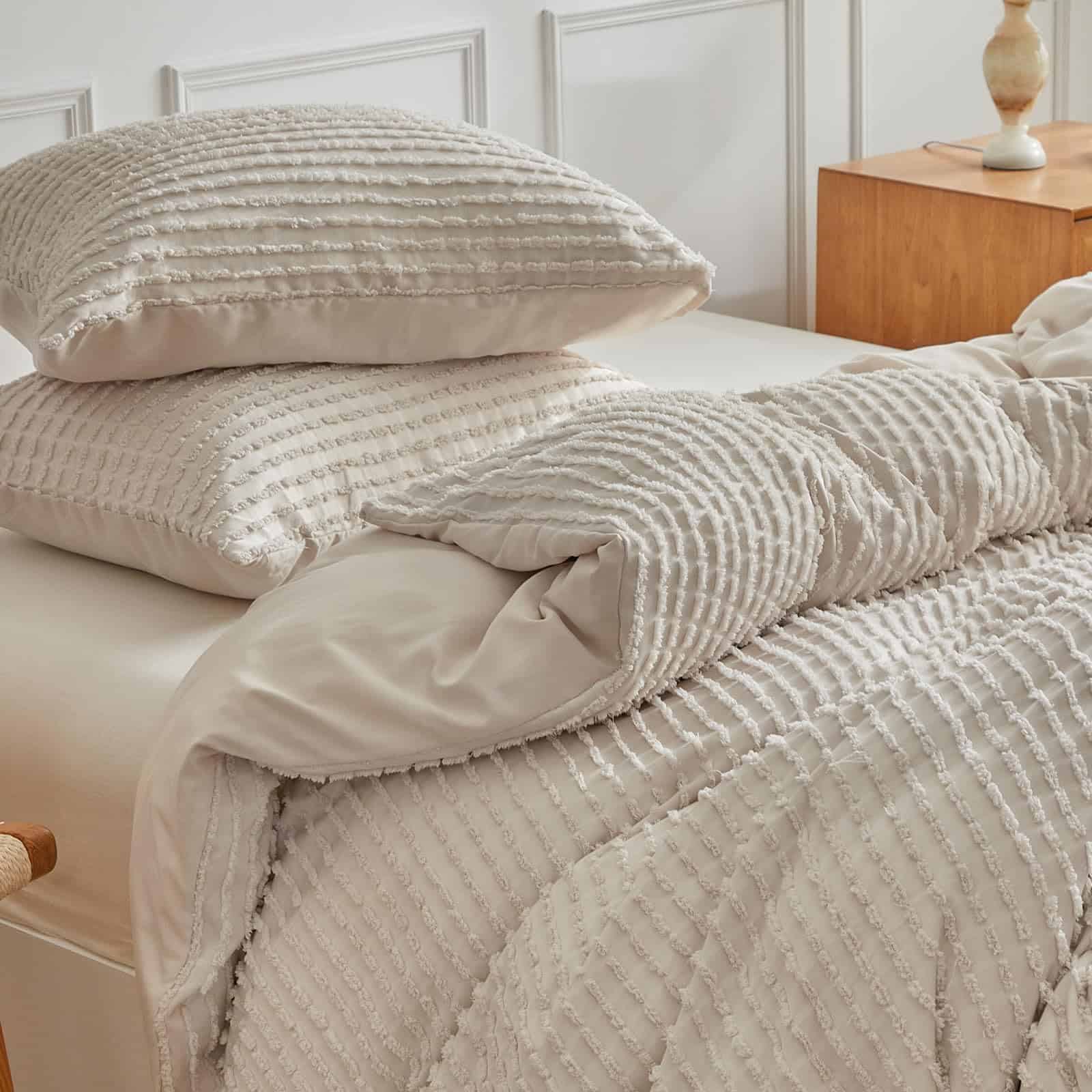 WARMDERN ha creado este hermoso juego de funda de edredón en tamaño king que hará que tu cama luzca elegante y cómoda. La funda de edredón a rayas en color caqui está hecha de microfibra lavada de alta calidad, que es suave y liviana para una sensación de lujo. El diseño único de las rayas y la textura de puntada le dan a esta funda de edredón un estilo boho sencillo pero elegante, que se puede combinar fácilmente con la decoración de tu habitación. Además, los detalles cuidadosos como la funda de almohada de sobre y las esquinas aseguradas con lazos hacen que esta funda de edredón sea práctica y fácil de usar. Sin complicaciones para el mantenimiento, simplemente lava a máquina en frío y seca al aire o en secadora a baja temperatura para mantener esta funda de edredón en perfectas condiciones. Con este juego de funda de edredón de WARMDERN, disfrutarás de un descanso nocturno cómodo y elegante.