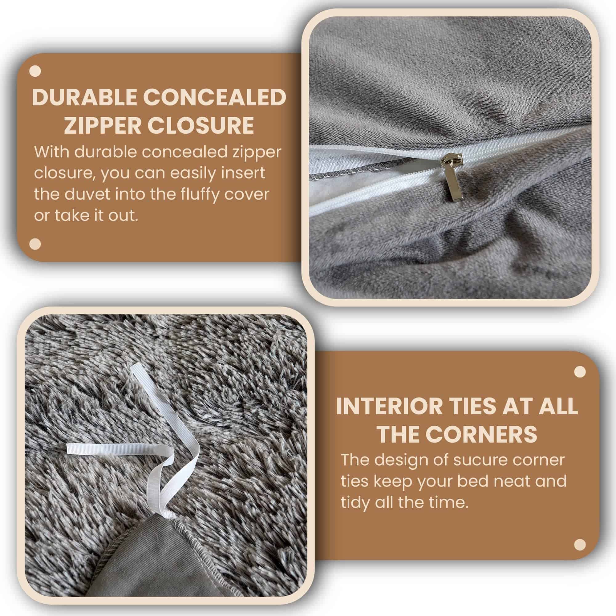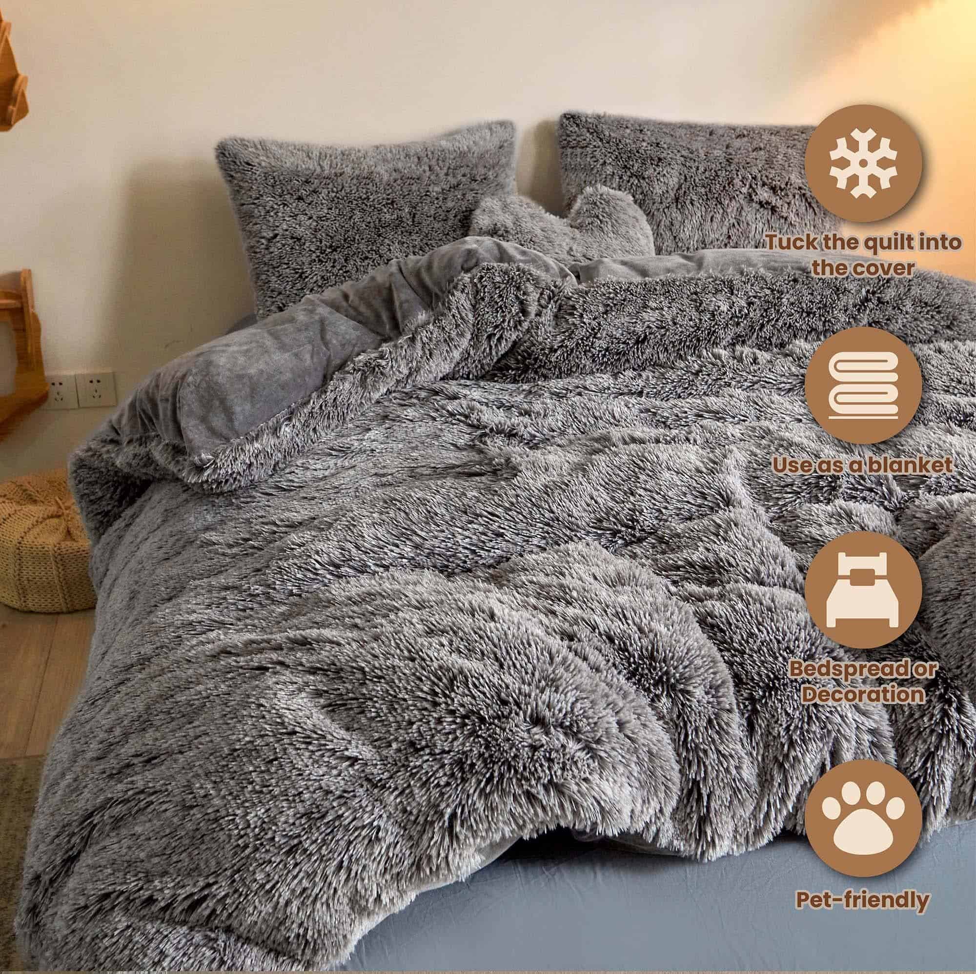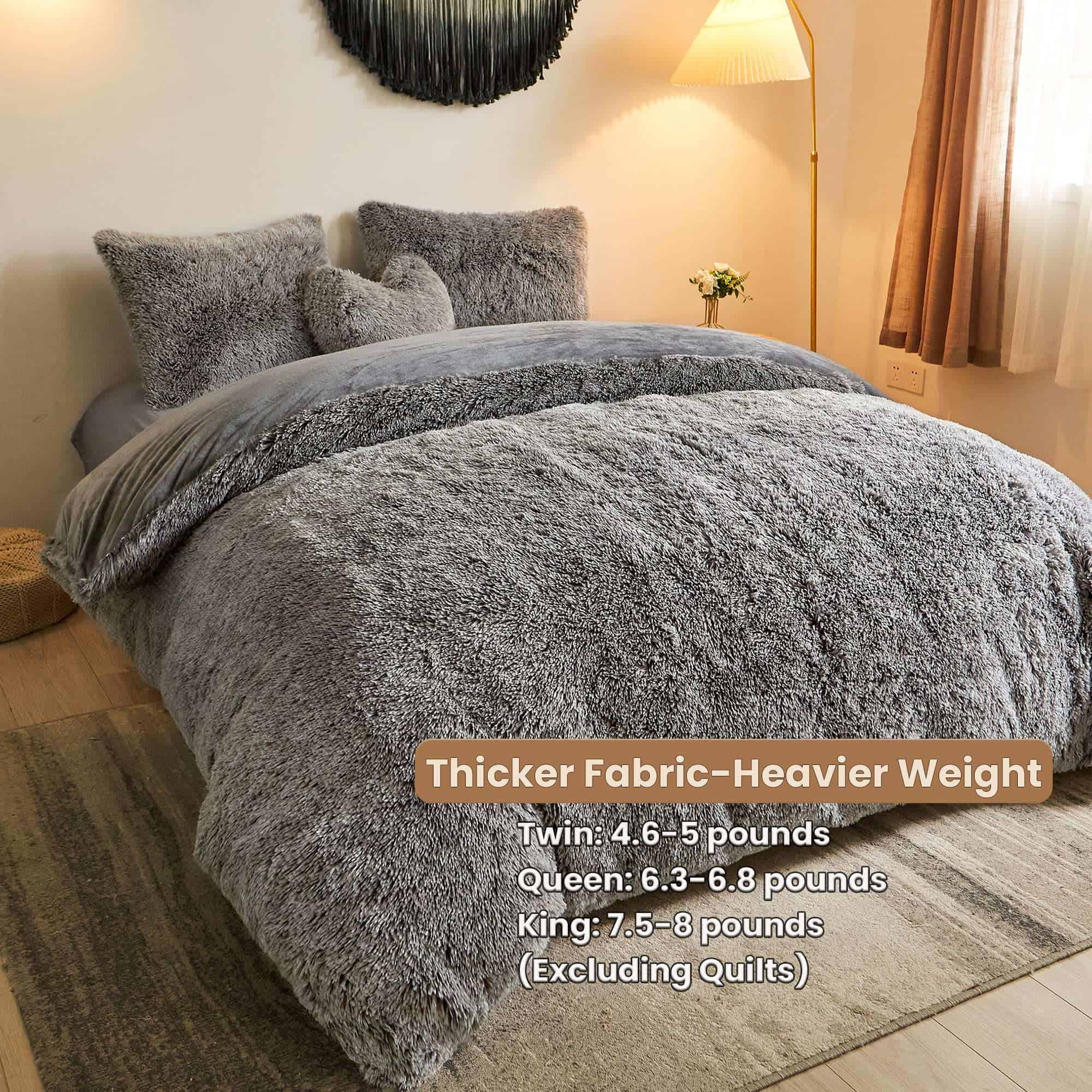 1. MATERIAL DE CALIDAD: Nuestro juego de ropa de cama de piel sintética está hecho de material de microfibra suave y de alta calidad. Lujoso pelaje largo de 45 mm, aporta un toque deslumbrante de glamur a la decoración de tu dormitorio/habitación de invitados. El lado reverso está hecho de material de terciopelo ultra suave y amigable con la piel, cómodo, cálido y suave, para crear una experiencia de sueño serena! Resistente a la decoloración, arrugas, encogimiento, resistente a las pelusas y transpirable. 2. PAQUETE: Juego de funda de edredón de tamaño Twin – 2 piezas incluye una funda de 68″x90″ y una funda de almohada de 20″x26″; Juego de funda de edredón de tamaño Queen – 3 piezas incluye una funda de 90″x90″ y dos fundas de almohada de 20″x26″; Juego de funda de edredón de tamaño King – 3 piezas incluye una funda de 90″x104″ y dos fundas de almohada de 20″x36″. 3. CARACTERÍSTICAS: En comparación con las pieles sintéticas comunes, nuestro juego de confortadores de felpa es más esponjoso y grueso. Con cierre de cremallera oculta, puedes introducir fácilmente el edredón en la funda esponjosa, y tu edredón se volverá lujoso y cálido. Es más que una simple funda de edredón peluda, en días de verano puedes sacar fácilmente el edredón y utilizarlo como manta grande para la cama. Este juego de funda de edredón es una excelente elección para uso diario y también puede ser un gran regalo para todos, festivales y otras ocasiones especiales. 4. LIMPIEZA: El cierre de cremallera oculta y las cuatro correas son fáciles de quitar el edredón y lavar el juego de funda. Voltea la funda del edredón del revés, Limpieza en Seco o Lavar a Máquina en agua fría. Ciclo suave solamente (Secadora en Baja/Sin Calor). Recomendamos sacudirlo al aire libre antes del primer uso para que sea más esponjoso y amigable con la piel. 5. SERVICIO AL CLIENTE: Ofrecemos servicio al cliente de por vida. Si tienes alguna pregunta, contáctanos directamente, te responderemos en un plazo de 24 horas y te daremos una respuesta satisfactoria.