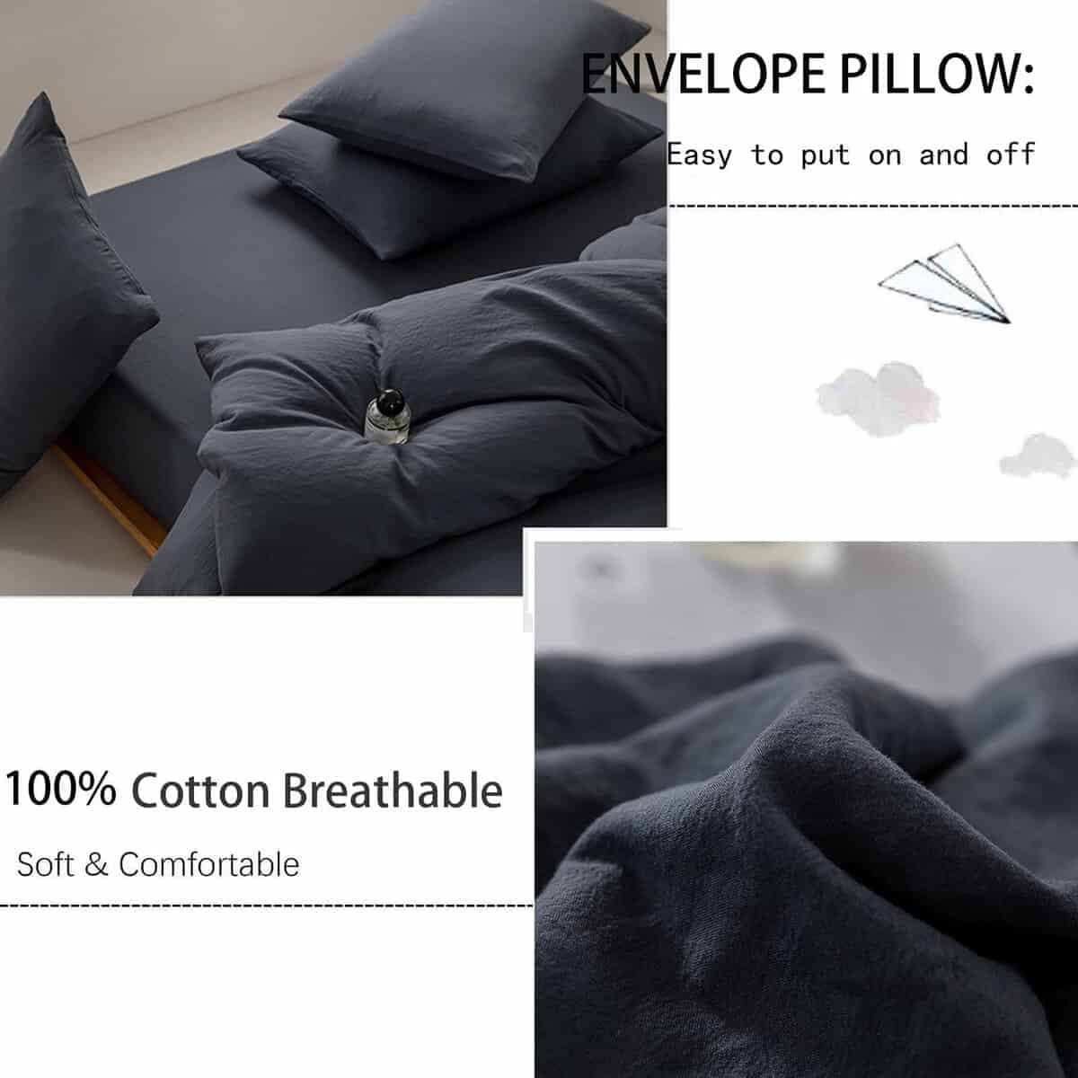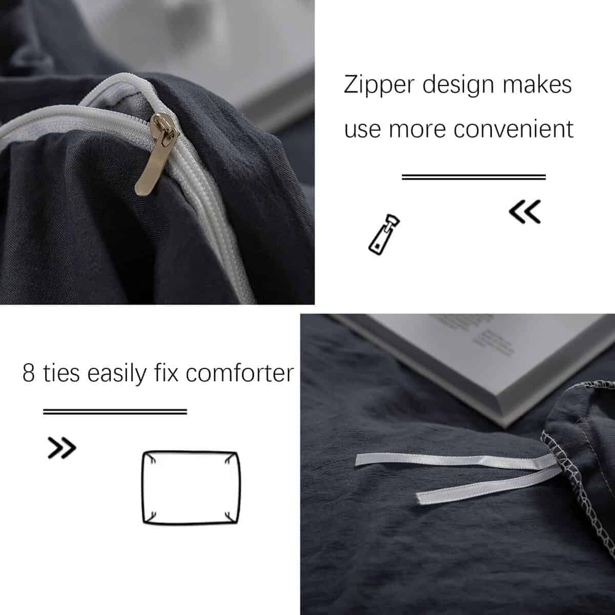 Lazos en las Esquinas La funda de edredón tiene un lazo en cada esquina en el interior, que puede fijar fácilmente el edredón y evitar que se agrupe o se mueva.