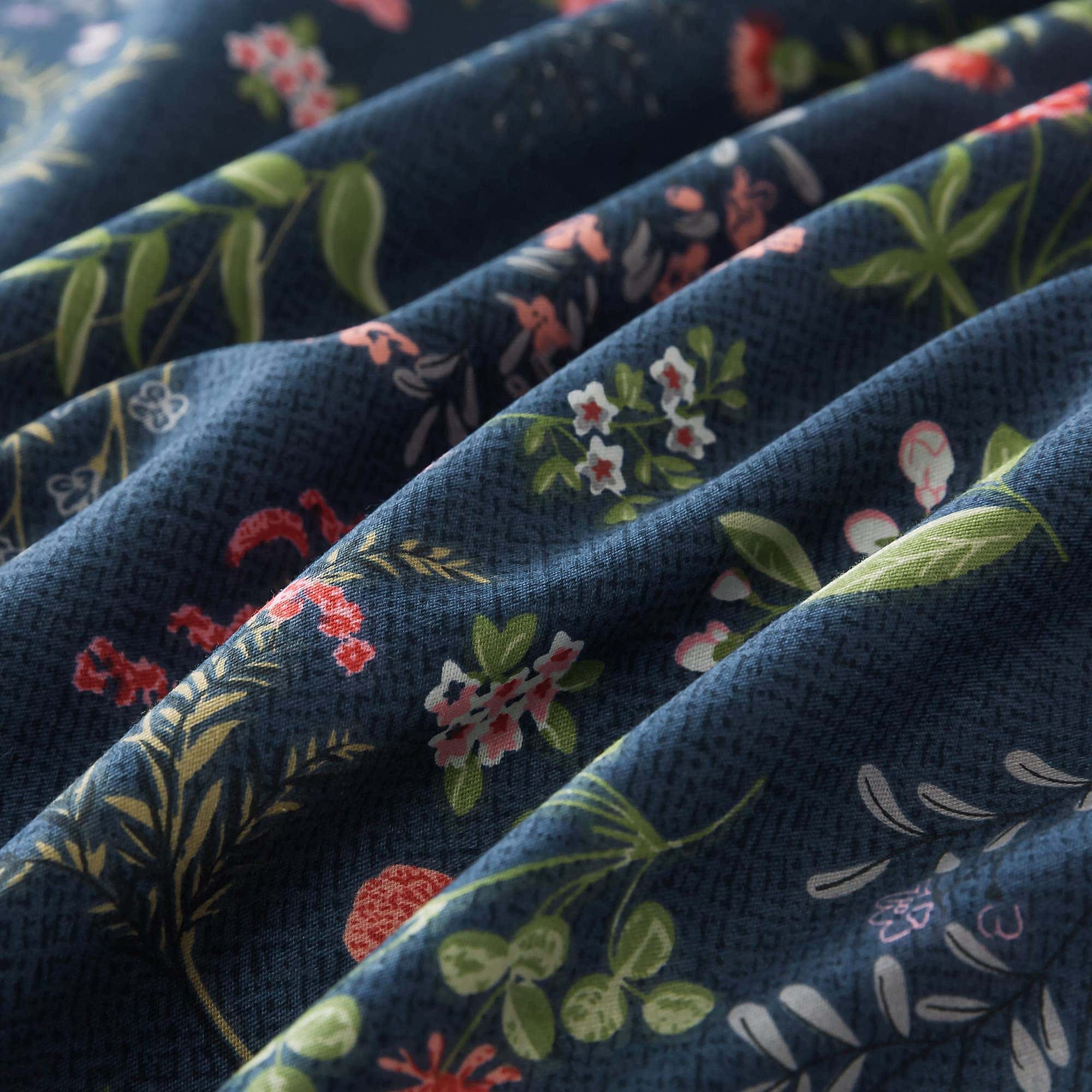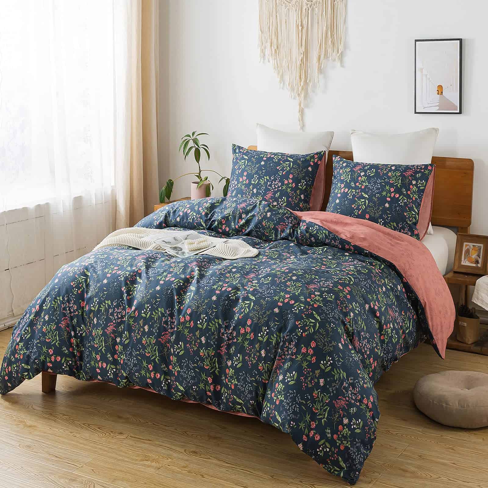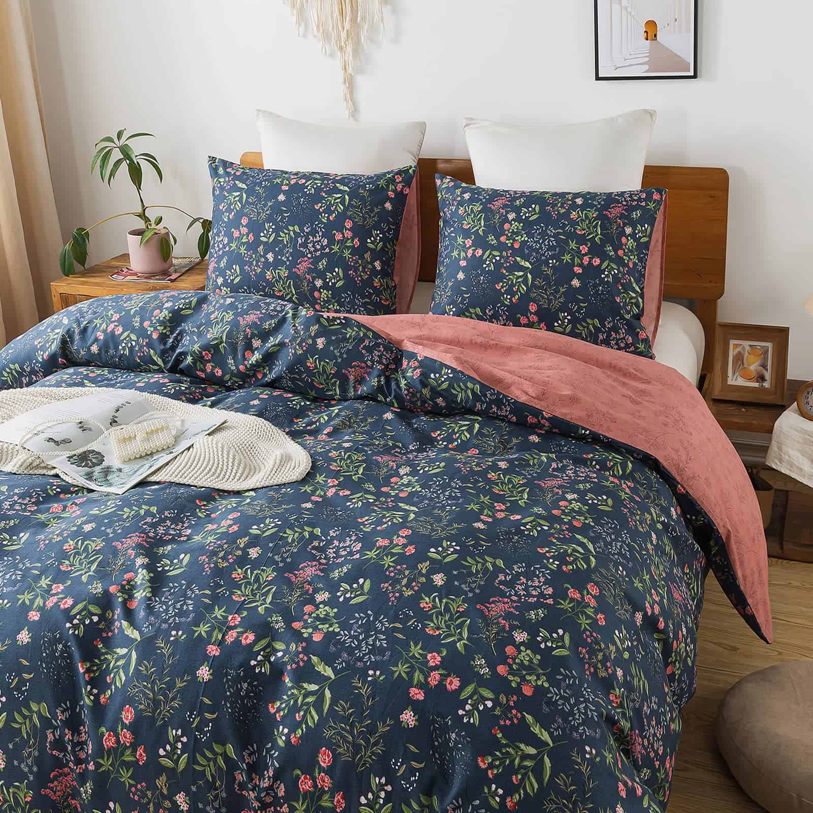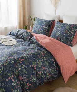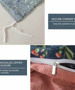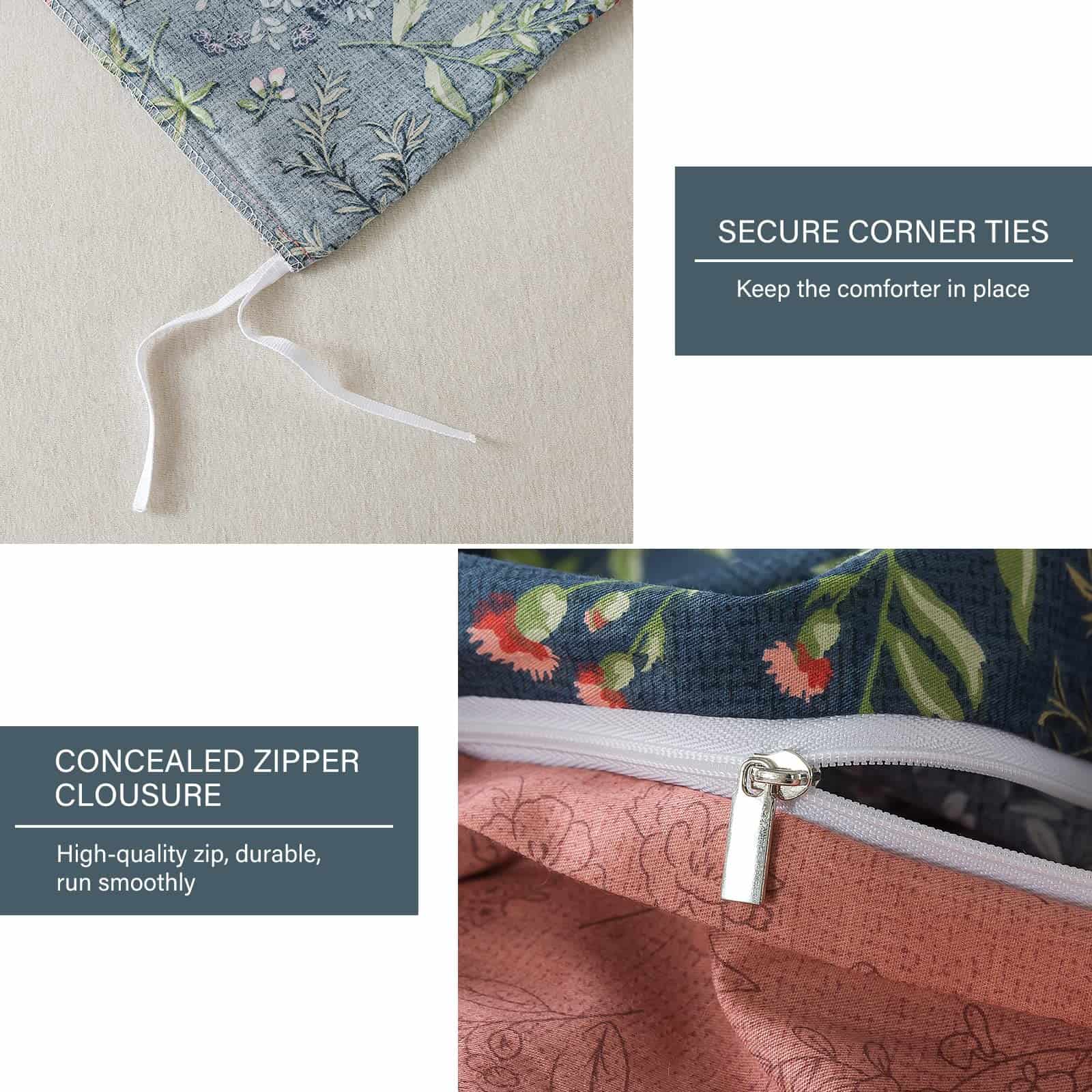 Material — 100% Algodón. Set Incluye — 1 X Funda de Edredón (90″x 90″), 2 X Fundas de Almohada (20″x 26″). Diseño Único — Reversible, patrón de flores marinas azul oscuro vintage y floral en rojo retro. Cierre de Cremallera & Lazos — La cubierta del edredón con cierre de cremallera oculta y lazos en las esquinas. Fácil Cuidado — Lavar a máquina en agua fría. Secar en secadora a baja temperatura. No usar blanqueador. Se recomienda lavar antes del primer uso.