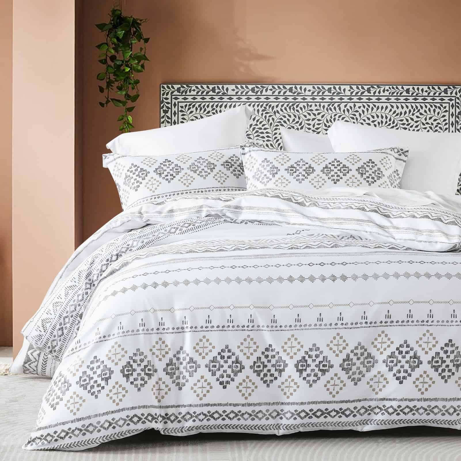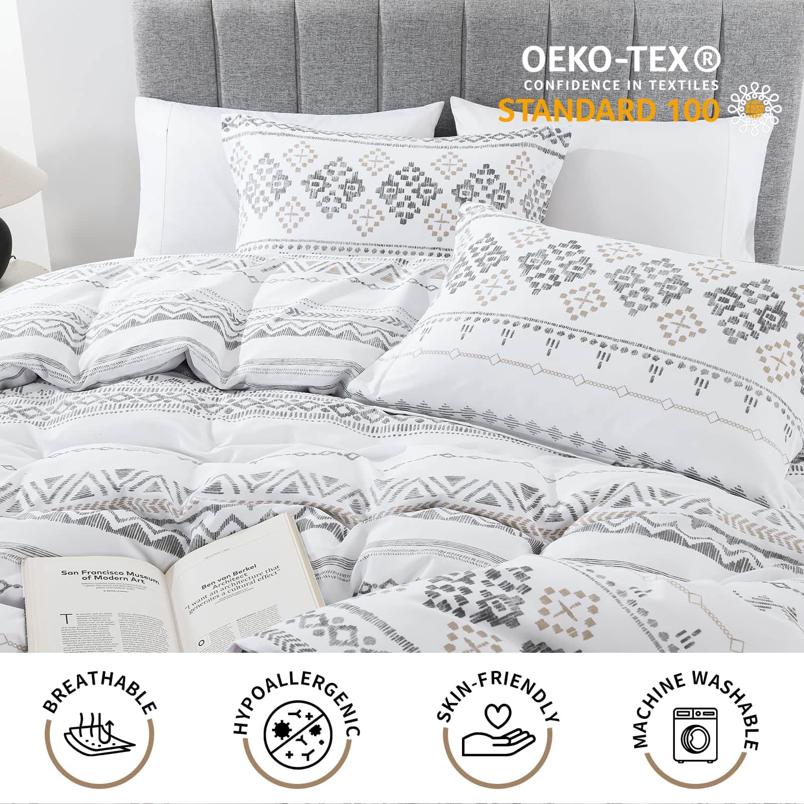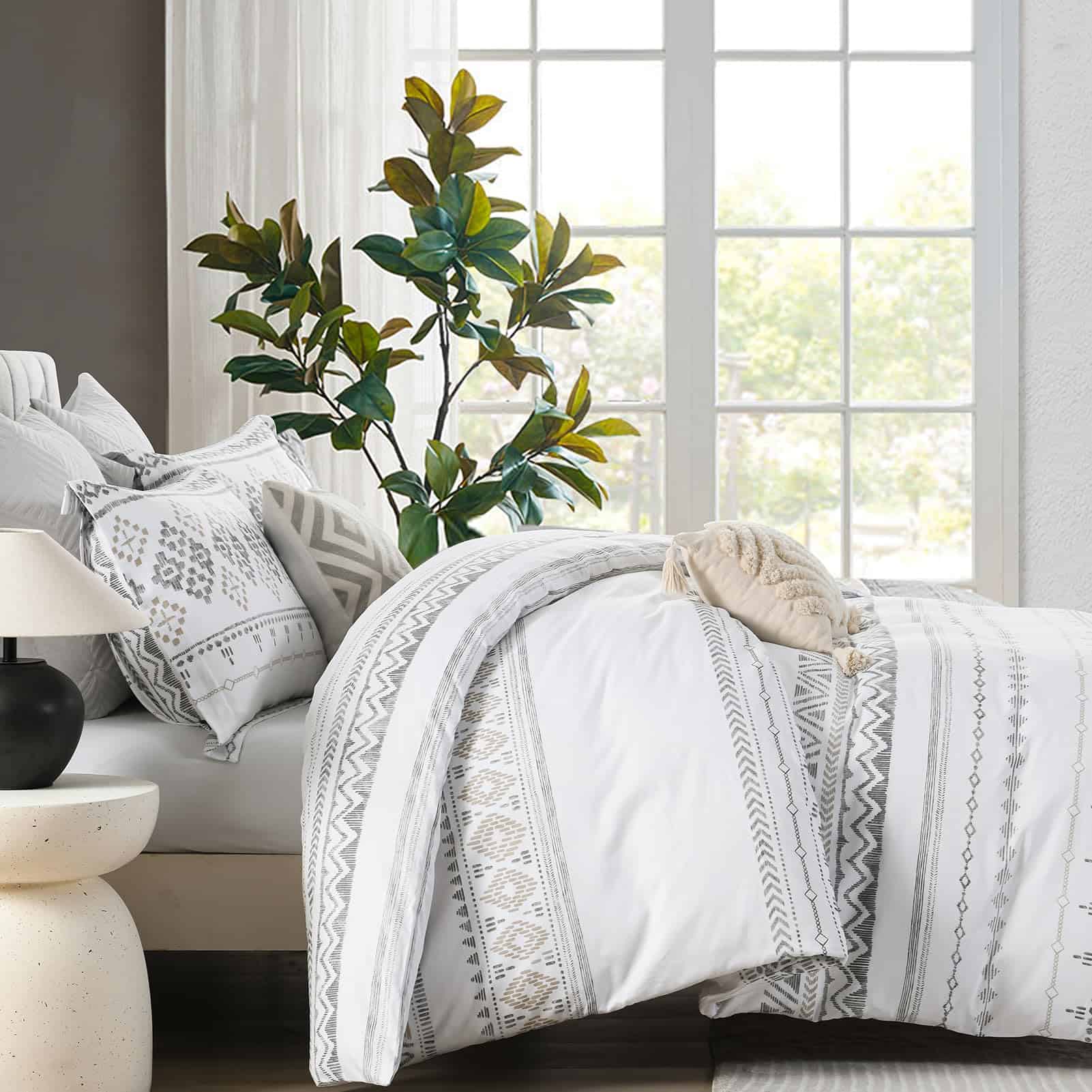 1. Funda de edredón boho queen estilo bohemio y estampado azteca en funda de edredón geométrico queen, funda de edredón blanca y gris, añade color y belleza a la habitación, la funda de edredón azteca queen conjunto de funda de edredón queen de estilo granja ilumina tu habitación. Elección perfecta para propietarios con gustos sofisticados en decoración del hogar. 2. Algodón ultra suave y mejor sueño Material certificado según Oeko-Tex Standard 100. La funda de edredón queen está hecha de 100% algodón. El acabado prelavado hace que la tela tenga una excelente suavidad, no se desvanezca fácilmente, sin olor. El juego de funda de edredón queen es adecuado para todo el año, es suave, cómodo y transpirable. 3. Diseño y regalo La funda de edredón de algodón tiene un exquisito patrón de rayas geométricas en la funda de edredón y las fundas de almohada, ideal para un aspecto de granja. Funcionará fabulosamente con cualquier decoración interior, adecuado para cualquier tema de habitación, haciendo que su habitación se vea elegante y limpia. Es una buena opción para sus amigos y familiares. 4. Cierre con cremallera y 8 lazos en las esquinas La cómoda y sin complicaciones cremallera oculta hace que sea fácil insertar y quitar su edredón en la funda de edredón, Los ocho lazos en las esquinas mantienen el edredón en su sitio. Permítete dormir pacífica y cómodamente toda la noche. 5. Instrucciones de cuidado La colección de fundas de edredón azteca king es fácil de cuidar, por favor no lave con alta frecuencia. Lavable a máquina a menos de 60 °C. No usar lejía. Secar en secadora con ciclo suave y sin calor. CONSEJOS: Lavar del revés, Es mejor secar al natural