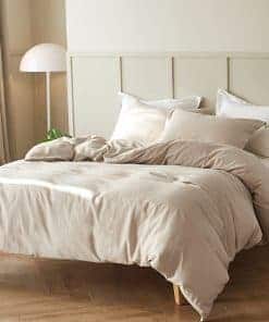 Juego de funda de edredón de lujo hecho de una mezcla de 55% de lino y 45% de algodón. Nuestro juego de funda de edredón de lino conserva la rica textura del lino, con un tacto suave y un estilo lavado. Tiene una mejor absorción de la humedad y transpirabilidad que el tejido de algodón, lo que garantiza que te sientas fresco en verano y cálido en invierno. Es adecuado para todas las estaciones, haciendo tu entorno de sueño muy cómodo. Se suaviza con cada lavado. No se encoje ni decolora fácilmente. Material certificado OEKO-Tex.