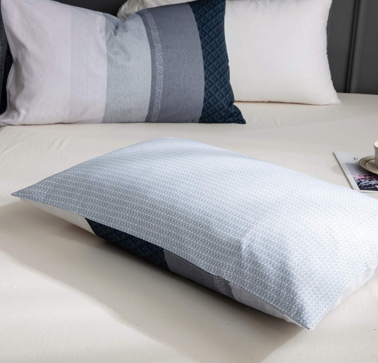 2. DISEÑO REVERSIBLE – Patrón de parches moderno y color azul, puedes cambiar el patrón de la parte delantera y trasera de la funda de edredón según tu estado de ánimo. Un color, un estado de ánimo.