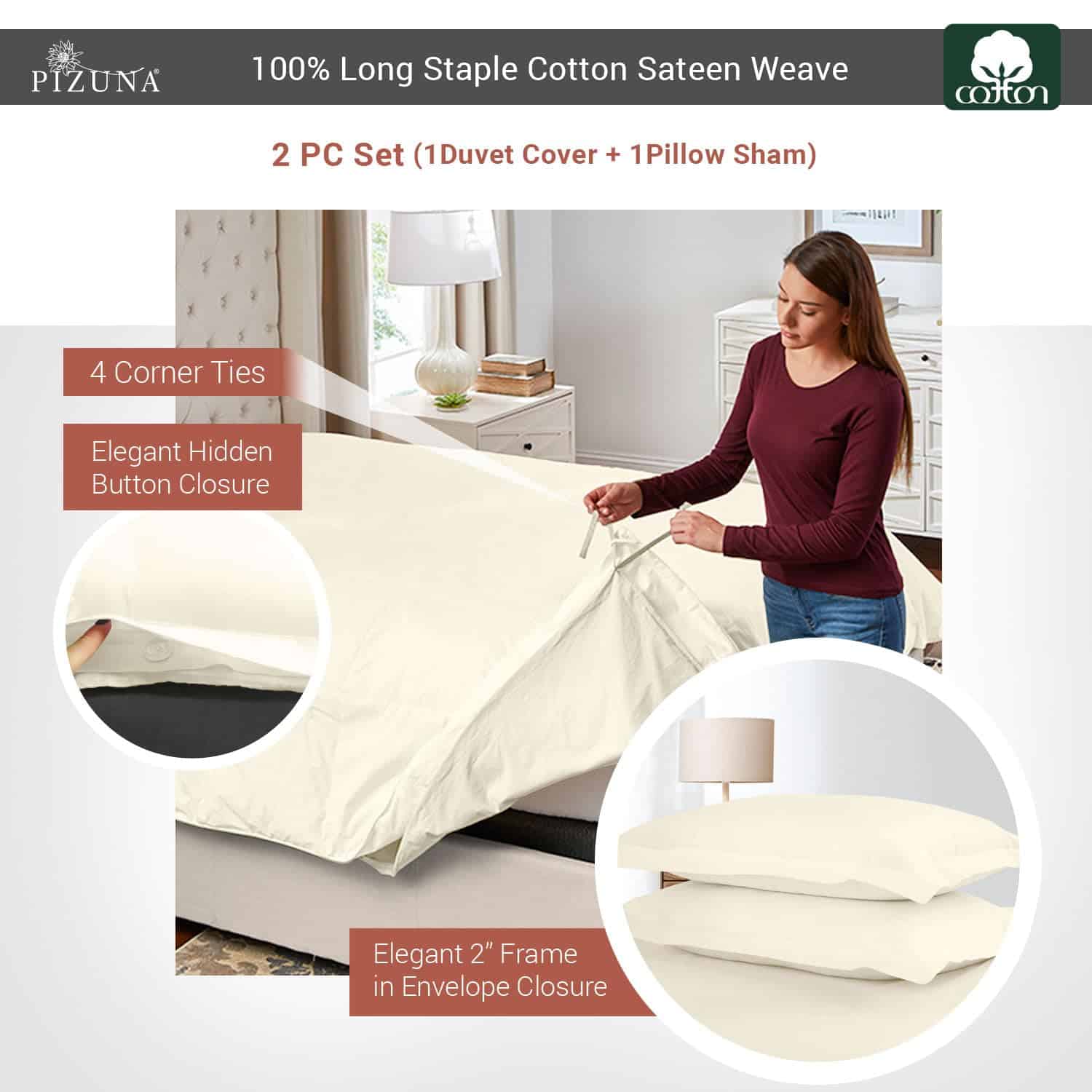 4. Estándar de Calidad Pizuna: Los productos de Pizuna son individualmente adaptados, medidos y revisados (pieza por pieza) por nuestro equipo de Control de Calidad. La tela de la funda de edredón twin de algodón es Certificada por OEKO-TEX & AZO-Free (2024), libre de sustancias sintéticas y respetuosa con el planeta, lo que la hace calmante incluso para las pieles más delicadas.
