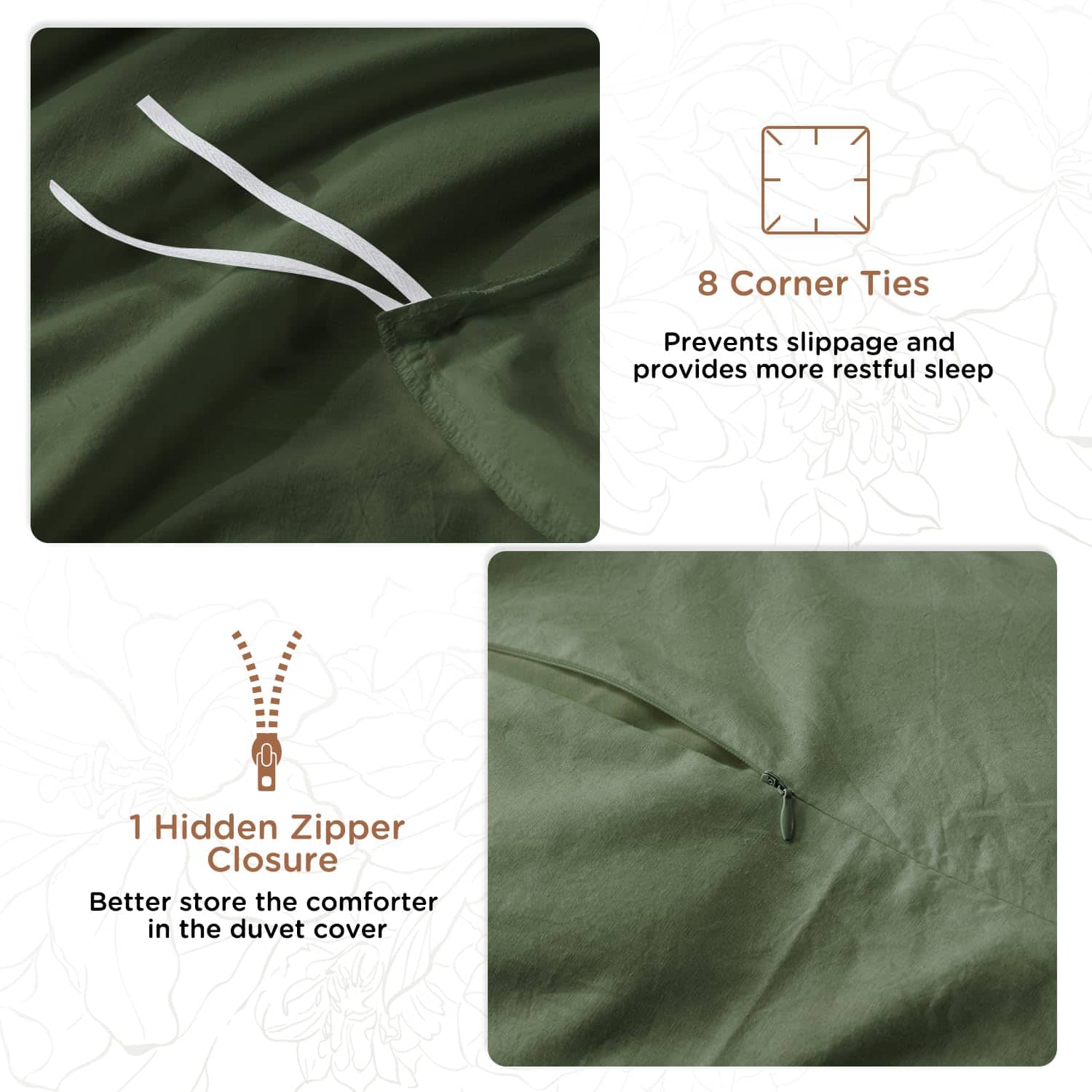 1. Juego de Funda de Edredón Tamaño Twin: 1 funda de edredón con cierre de cremallera y lazos en las esquinas (68×90), 1 funda de almohada (20×26). ¡SIN RELLENO! 2. Diseño Único: La funda de edredón está diseñada con 8 lazos en las esquinas y cierre de cremallera que aseguran que el edredón se mantenga fijo dentro del juego, el edredón se fija al dormir para que el cliente tenga un sueño de mayor calidad, y el diseño de cierre de sobre de la funda de almohada hace que sea más fácil meter la almohada. puede fijarse al dormir para que el cliente tenga un sueño de mayor calidad. 3. Suave y Transpirable – El juego de funda de edredón está hecho de 100% algodón lavado para mantenerte cómodo y cálido en noches frías y no hacerte sudar en noches calientes. Su aspecto ligeramente arrugado y sensación de lino pueden brindar un estilo elegante y de lujo a tu dormitorio. Su ventaja de transpirabilidad mantiene la cama sin olor a pelo de animal. 4. Garantía de Marca Calificada – Todas las piezas del juego de funda de edredón son fabricadas por nuestra propia fábrica la cual cuenta con la certificación OEKO-TEX Standard 100%. Hemos estado produciendo ropa de cama durante 22 años y todos los materiales del producto son cuidadosamente seleccionados, estrictamente inspeccionados. Nuestro objetivo es brindar a los clientes el retorno correcto por cada centavo que gastan. 5. Lavable a Máquina – Lavar a máquina en ciclo suave con agua fría, secar en secadora a baja temperatura para quitar las arrugas, no usar lejía ni planchar. La tela de algodón lavado al 100% permite que el producto mantenga su forma y suavidad después de cada lavado.