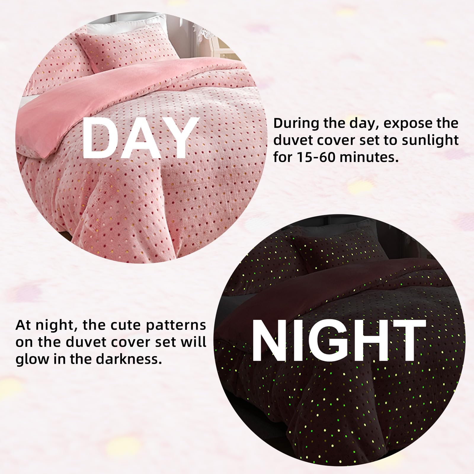 2. Brilla en la Oscuridad: El patrón luminoso de coloridos lunares en la funda de edredón rosa es seguro y no tóxico, la tela brilla en la oscuridad debido a los ingeniosos principios físicos. El patrón de coloridos lunares que brilla en la oscuridad está solo en un lado del juego de cama, el otro lado es puro rosa suave.