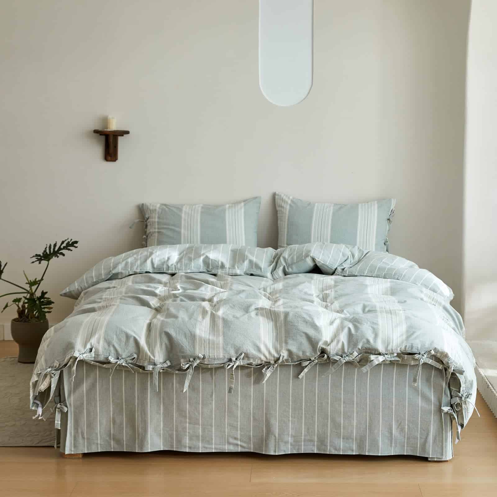 Material 100% algodón lavado certificado por OEKO-TEX STANDARD 100. Set King size incluye 1 funda nórdica (104″ x 92″) y 2 fundas de almohada tamaño King (20″ x 36″). Diseño único con lazo de moño en lugar de cierre tradicional. Fácil de cuidar, lavable a máquina y reversible.