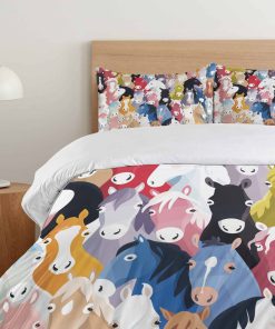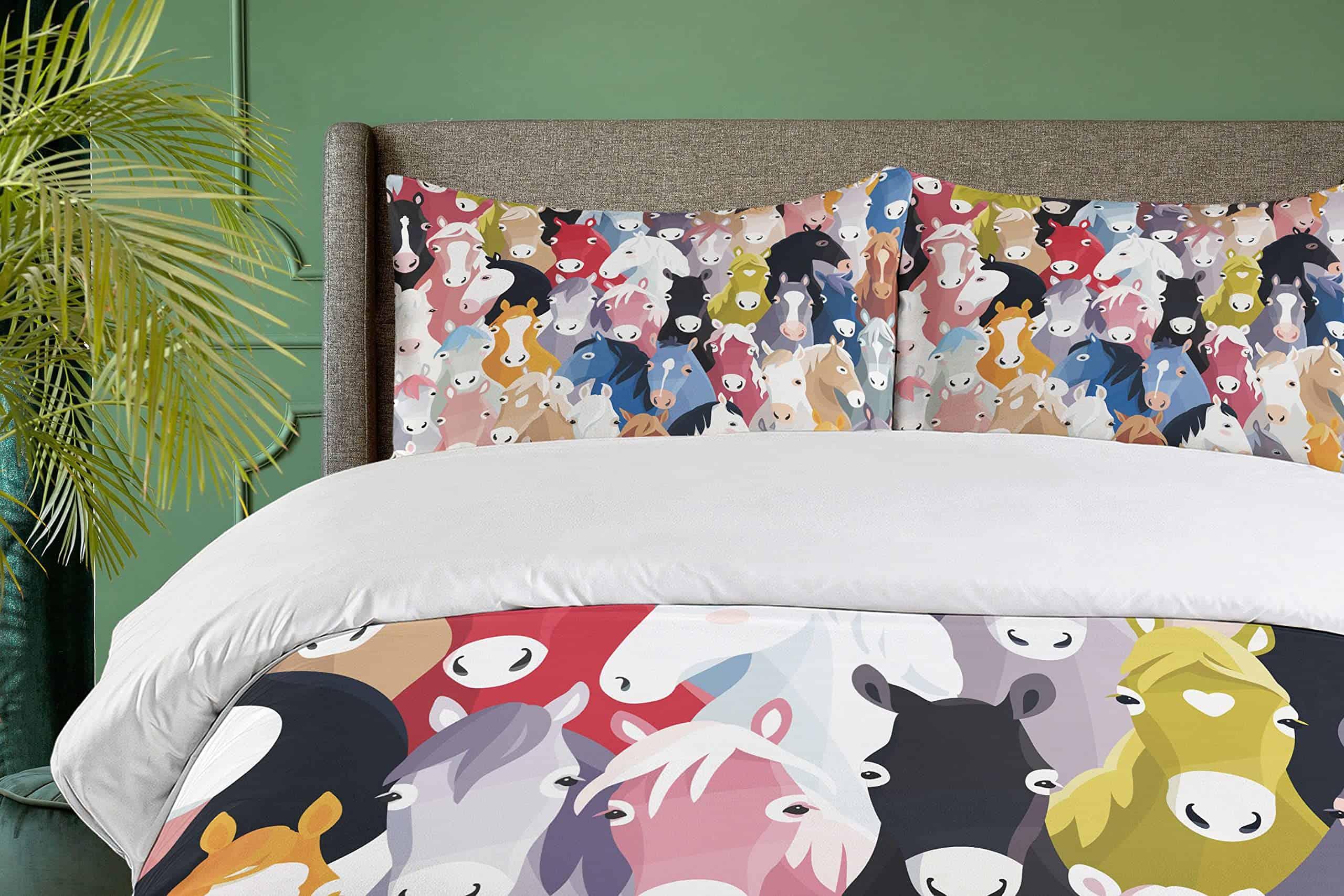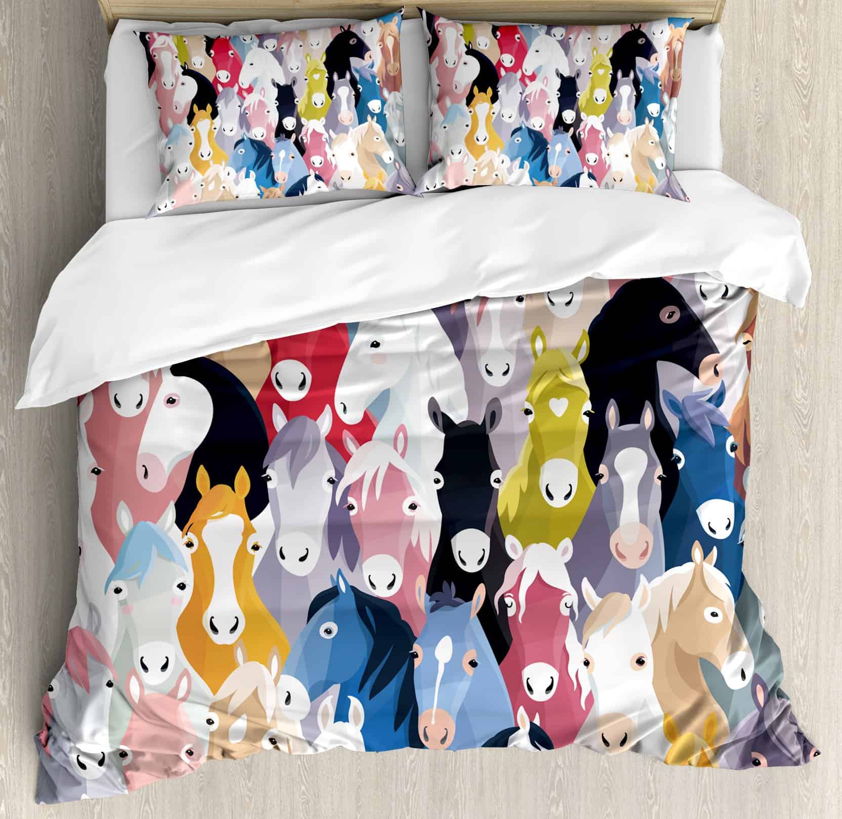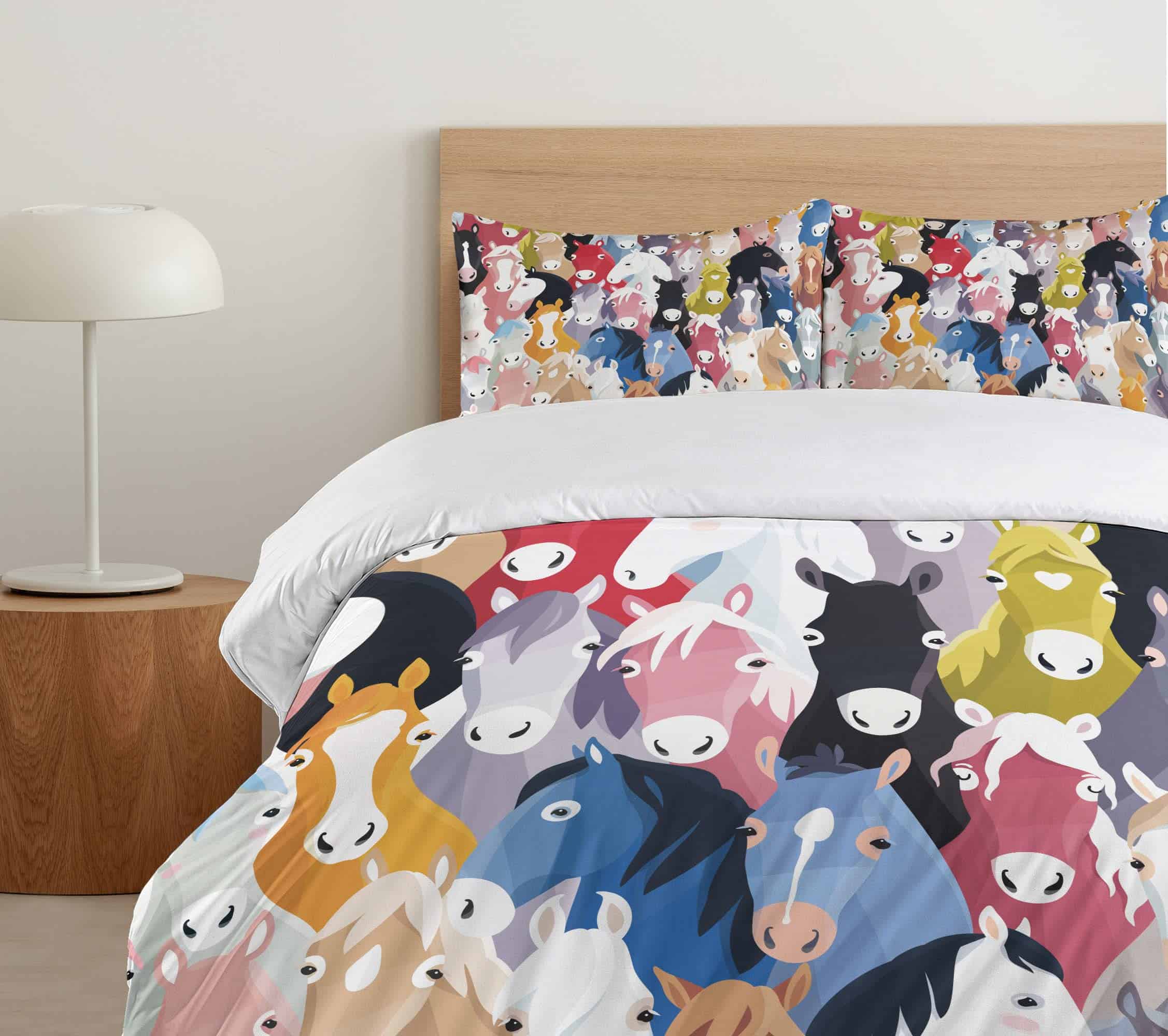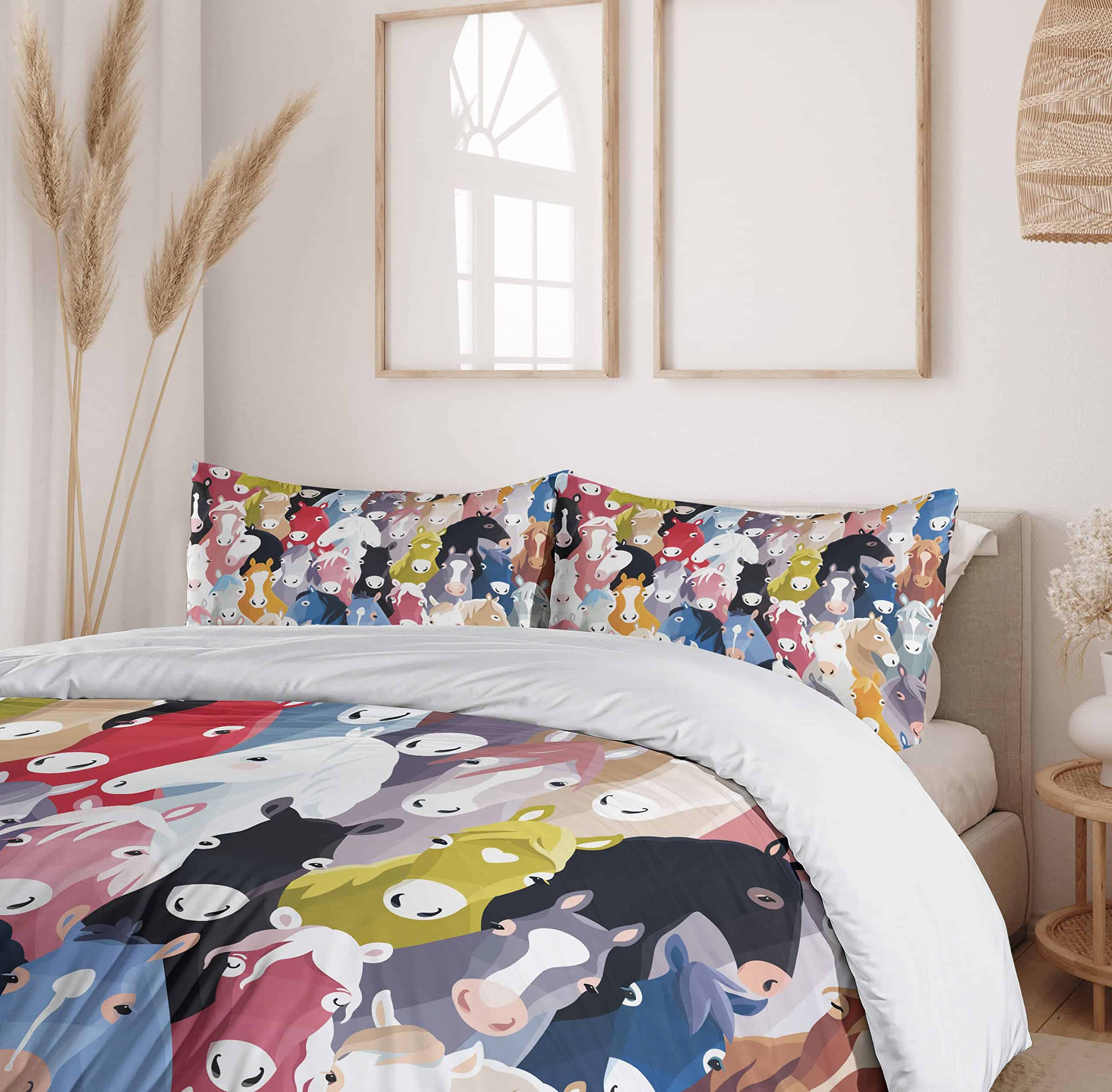 Patrón con Caballos de Estilo Cartón Coloridos Tema de la Infancia Arte Infantil. Hecho de 100% tela de microfibra cepillada. Súper suave para máxima comodidad. Colores e imágenes vívidas. Fácil de usar – La funda nórdica tiene una cremallera oculta sin complicaciones y las fundas de almohada tienen cierres de sobre. Lavable a máquina – ciclo frío, seguro para secadora. Planchado fácil. Excelente costura y mano de obra. Sin decoloración. Impreso con tecnología digital de última generación. La funda nórdica y las fundas de almohada están impresas solo en el lado delantero.