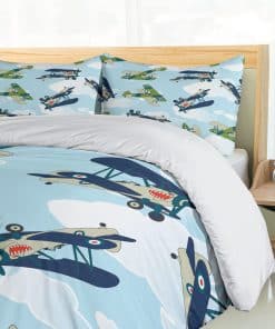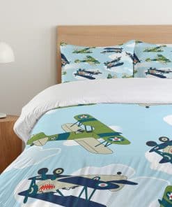 Funda nórdica Ambesonne con diseño de avión vintage con patrón de dientes de tiburón cartoon de los aliados volando. Ideal para dar un toque único a tu habitación. La funda nórdica tiene una cremallera oculta sin complicaciones y las fundas de almohada tienen cierres de sobre. Fácil de lavar a máquina en ciclo frío, apto para secadora y fácil de planchar. Excelente costura y mano de obra. Sin decoloración. Impreso con tecnología digital de última generación. Funda nórdica y fundas de almohada impresas solo en el lado frontal.