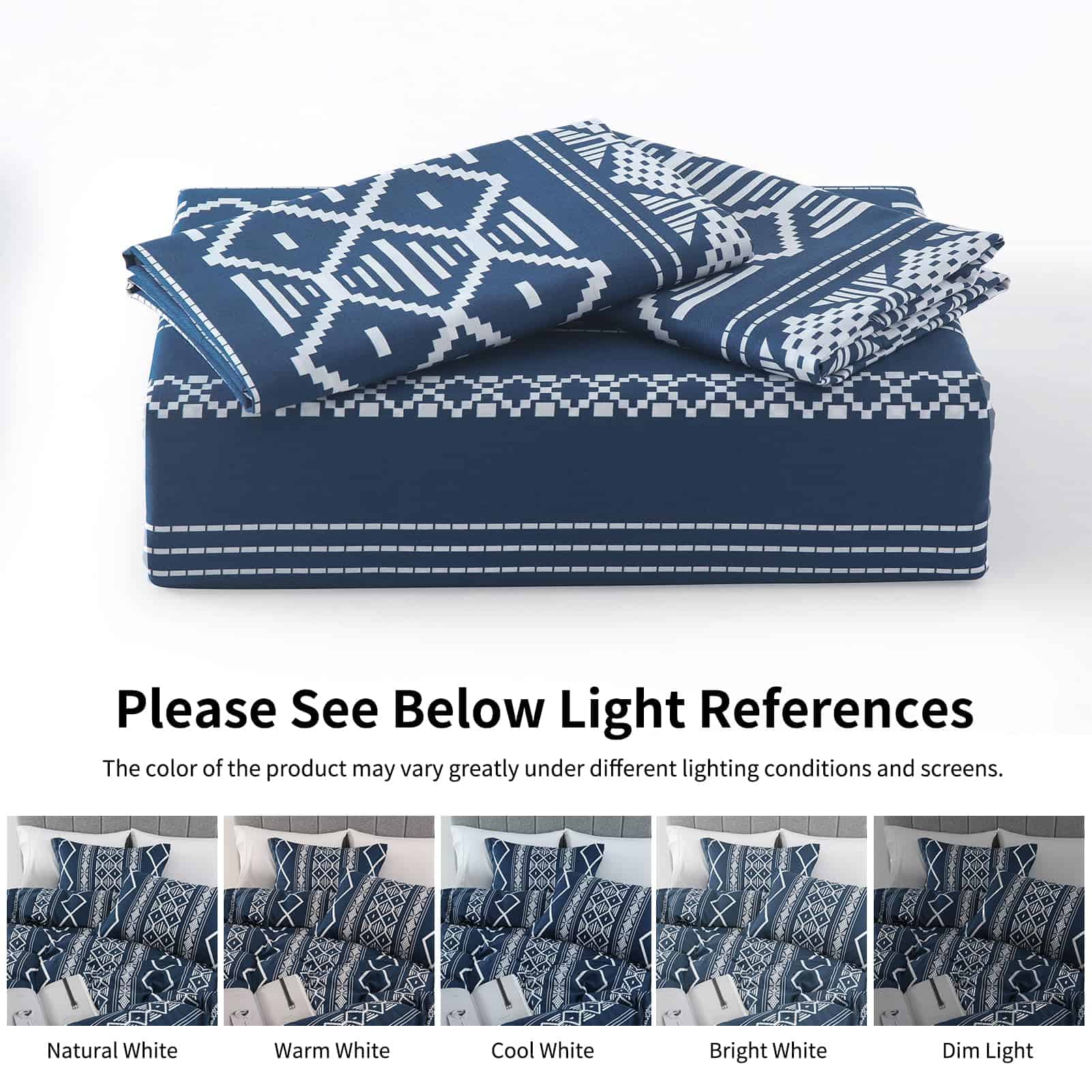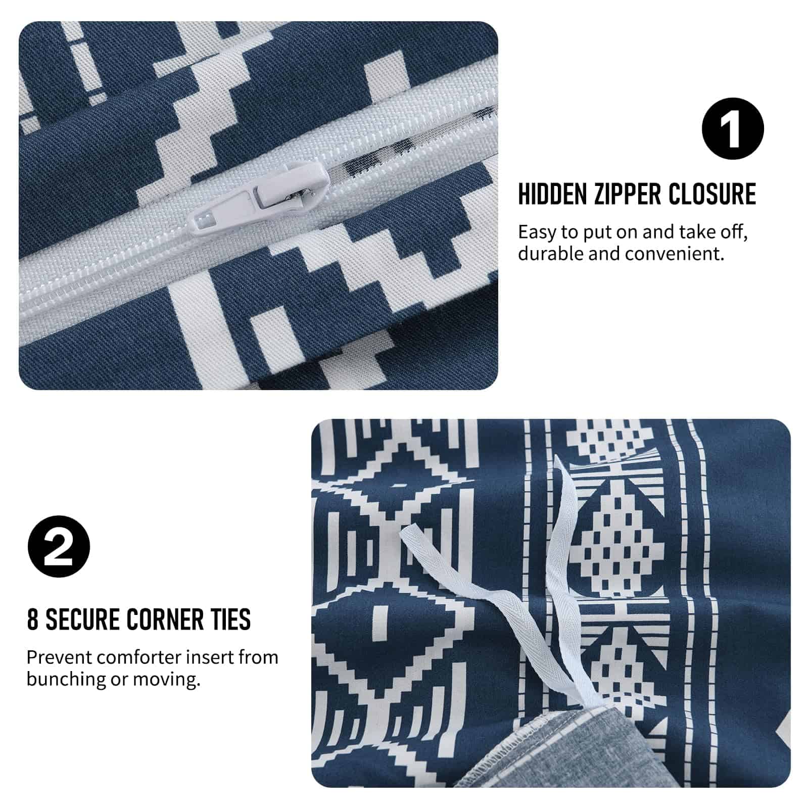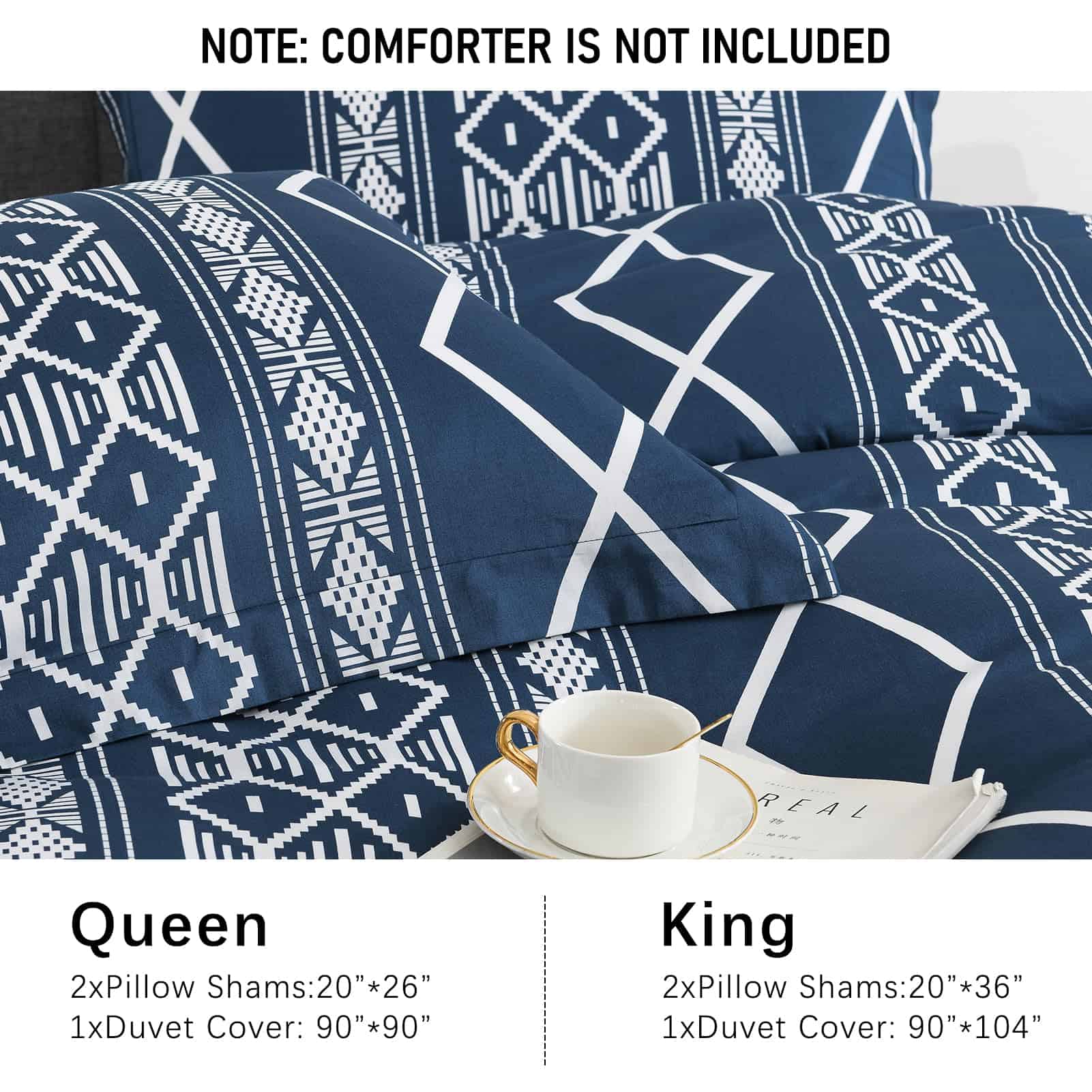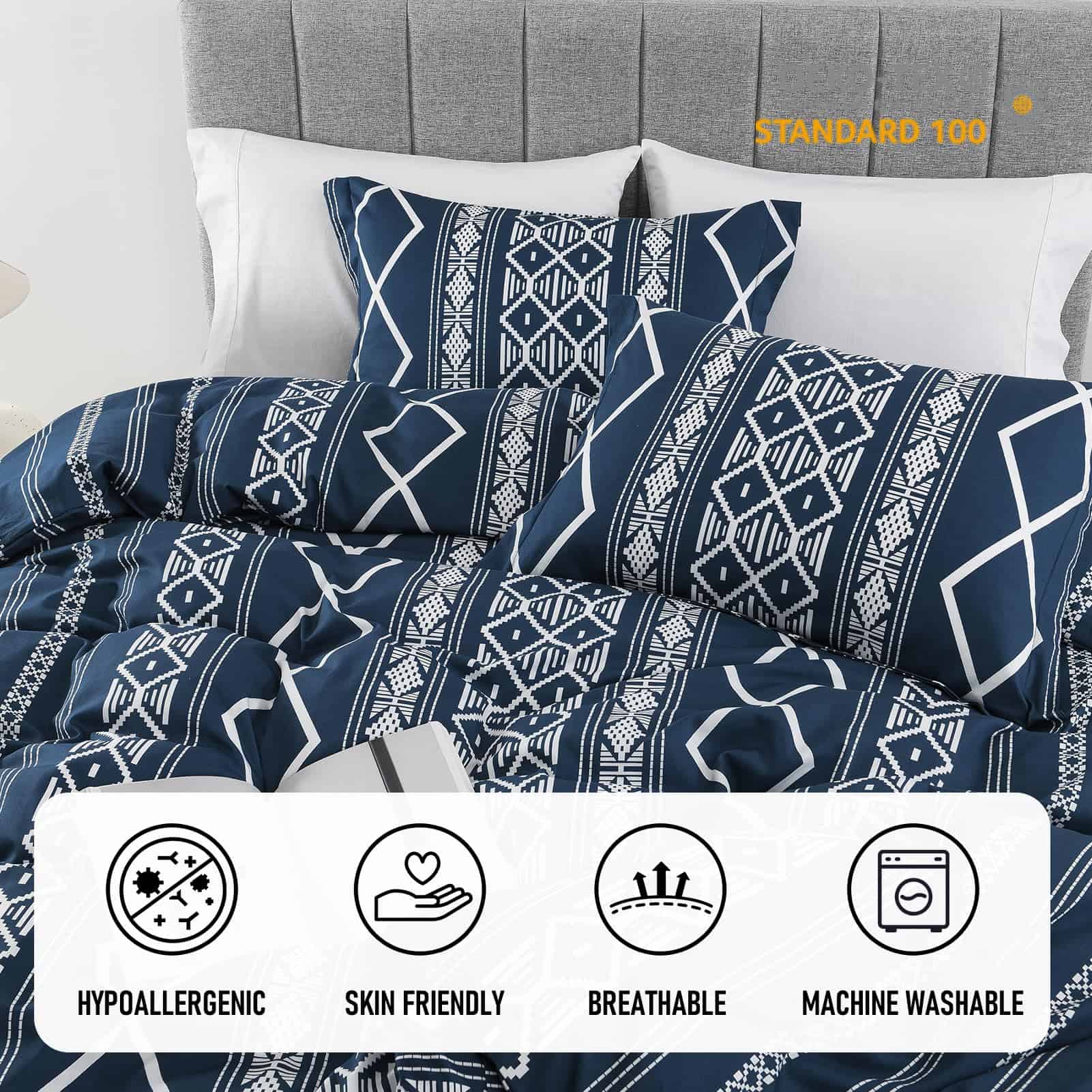 1. Tamaño King & Incluye Set de 3 piezas de ropa de cama de algodón: 1 funda nórdica azul marino tamaño king (104″ x 90″), 2 fundas de almohada (20″x 36″). Nota: El relleno nórdico y las almohadas no están incluidos. 2. Algodón Ultra Suave & Mejor Sueño Material certificado Oeko-Tex Standard 100. La funda nórdica con estampado geométrico está hecha de 100% algodón. La artesanía prelavada hace que la tela sea suave, no se desvanezca fácilmente, no tenga olor. El juego de funda nórdica king es adecuado para todo el año, es suave, cómodo y transpirable. 3. Cierre con Cremallera y 8 Lazos de Esquina Cierre de cremallera oculto conveniente sin complicaciones que facilita insertar y quitar el relleno nórdico en la funda nórdica, Los ocho lazos de esquina mantienen el relleno en su lugar. Te permiten dormir pacífica y cómodamente toda la noche. 4. Diseño & Regalo La funda nórdica de algodón tiene un exquisito patrón de rayas aztecas en la funda nórdica y fundas de almohada, ideal para un look de granja. Funcionará de manera fabulosa con cualquier decoración interior, adecuado para cualquier tema de habitación, haciendo que tu habitación se vea elegante y limpia. Es una buena elección para tus amigos y familia. 5. Instrucciones de Cuidado La colección de fundas nórdicas geométricas king es fácil de cuidar, por favor no laves con alta frecuencia. Lavable a máquina a menos de 60 grados. No usar lejía. Secar en secadora con ciclo suave y sin calor. CONSEJOS: Lavar al revés, Secar al natural es mejor