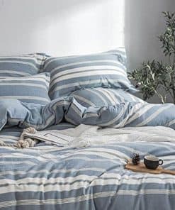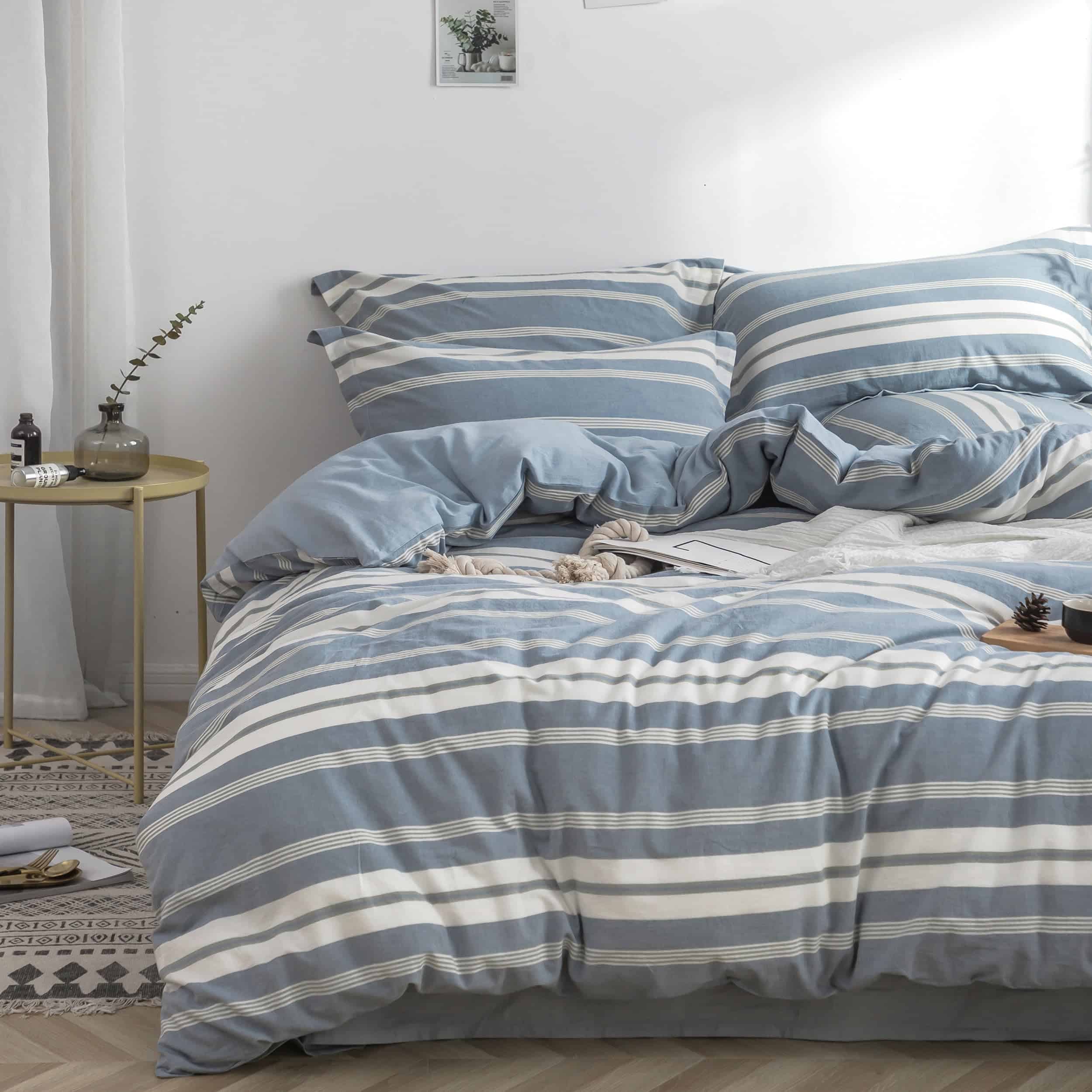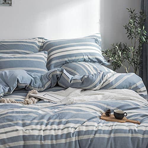 1. MATERIAL 100% algodón lavado. El tejido ha sido tratado con un proceso especial, lo que lo hace más suave y cómodo, con una textura como la del lino. Nuestro producto ha sido certificado por OEKO-TEX STANDARD 100, el sello definitivo de excelencia para productos que son buenos para su salud y el medio ambiente. 2. CONJUNTO DE VALOR El juego de tamaño King incluye 1 funda nórdica (104″ x 92″) y 2 fundas de almohada de tamaño King (20″ x 36″), no incluye el relleno. 3. CARACTERÍSTICA Diseño reversible, rayas teñidas en su cara, color sólido teñido en el reverso para adaptarse al diseño de contraste actual, puedes variar según tu estado de ánimo. El cierre de botón invisible es hermoso y 4 lazos internos de esquina pueden mantener tu edredón en su lugar. 4. FÁCIL DE CUIDAR Lavable a máquina, lavar en ciclo suave bajo 60 con colores similares. No lavar en seco. No utilice detergentes que contengan blanqueador o blanqueador óptico. Secar en secadora a baja temperatura. Planchar a fuego medio si es necesario. La tela de algodón se volverá más suave después de cada lavado. 5. Opción de regalo Aplicado en una variedad de ocasiones y usos: Tu apartamento, dormitorio universitario, habitación de niños, habitación de invitados, regalo/presente para tus familiares o amigos. Ofrecemos servicio al cliente 24/7. Si hay algún problema con el producto, contáctenos, le ayudaremos a resolverlo en 24H.