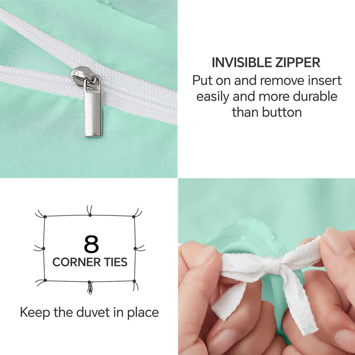 4. Ajuste Perfecto: Nuestra funda nórdica cuenta con una cremallera que puedes cerrar fácilmente para un ajuste perfecto. Además, cuenta con 8 lazos en las esquinas dentro de la funda nórdica para evitar que el relleno se desplace y garantizar un ajuste seguro. Diseño de funda de almohada estilo sobres, plana y cómoda.