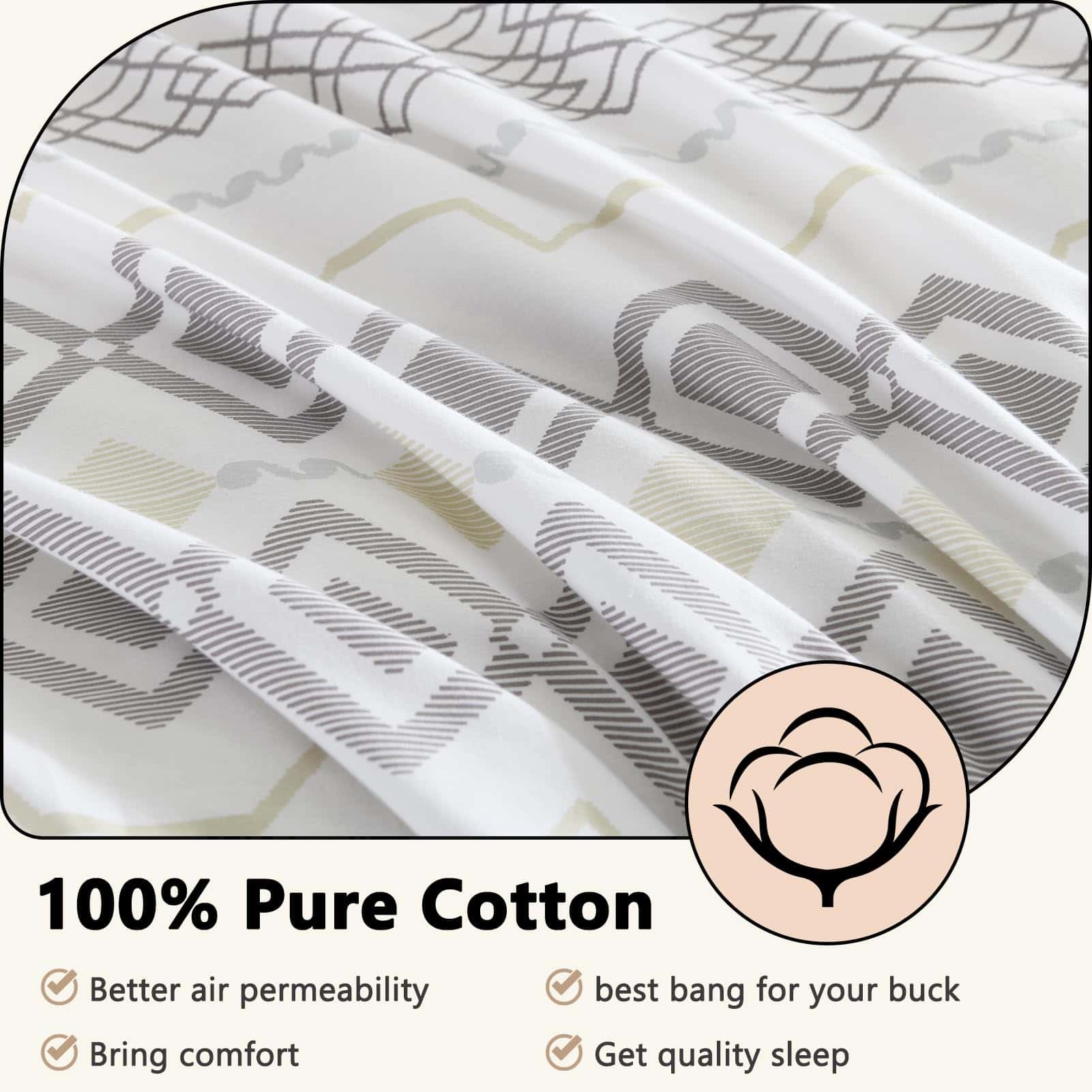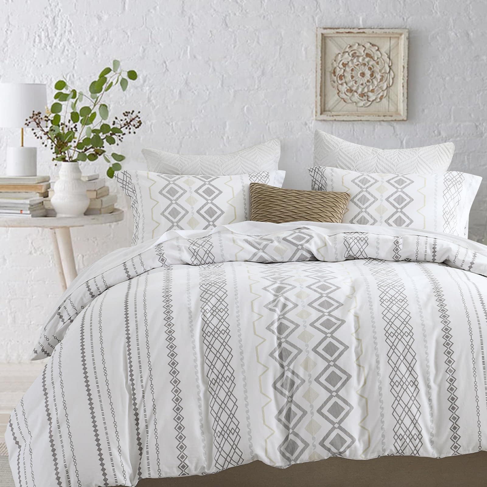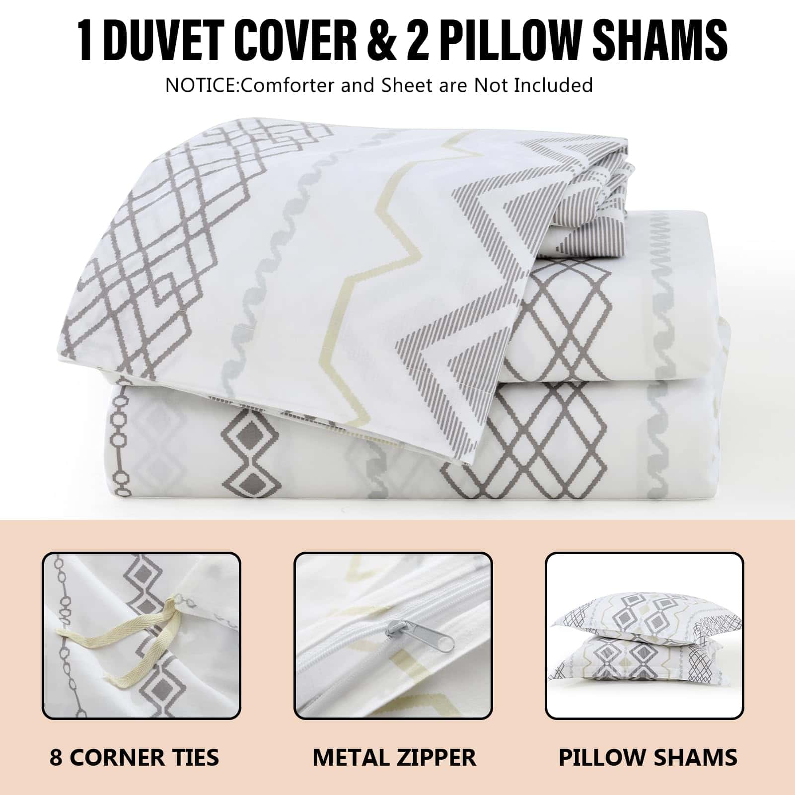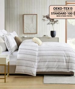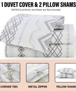 Hecho de algodón natural 100%, este juego de funda nórdica king es suave, seguro para la piel y resistente a las alergias y la electricidad estática para ti y tu familia. El proceso de prelavado le brinda una excelente suavidad que se vuelve más suave con cada lavado y se mantiene cómodo durante años. Nuestras fundas nórdicas king cuentan con un patrón geométrico bohemio de rayas compuesto por varios rombos y líneas en el frente, una combinación perfecta de moda y arte abstracto que es amada tanto por hombres como por mujeres, convirtiéndola en el regalo perfecto para las fiestas. El cierre de cremallera y los 8 lazos en las esquinas de la funda nórdica king aseguran que la funda no se deslice con un ajuste ultra preciso. La cremallera oculta facilita la colocación y eliminación de la funda nórdica de manera más rápida y estéticamente agradable. Nuestras fundas nórdicas king son rigurosamente probadas de acuerdo con el Estándar 100 de OEKO-TEX para asegurar que nuestros productos se produzcan de manera respetuosa con el medio ambiente y socialmente responsable, y se ha demostrado que están libres de sustancias nocivas y seguras para que las personas las utilicen con un excelente sentido de seguridad. El juego de funda nórdica king incluye 1 funda nórdica (90″ x 104″) y 2 fundas de almohada (20″ x 36″). (Funda nórdica y relleno de almohada no incluidos)