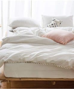 Material de poliéster y algodón lavado. Es el material bruto manejado por un proceso especial. Es más suave y cómodo que otros materiales. Conjunto para tamaño Individual: (1) 66″ X 90″ Funda nórdica + (2) 20 X 26 pulgadas de fundas de almohada (Nota: el edredón no está incluido). Diseño de borlas Pom-Poms en el borde de la funda nórdica y las fundas de almohada. hace que el conjunto de funda nórdica simple y moderno. No se necesita planchado para mantener la textura arrugada. Cierre de cremallera, conveniente para meter y sacar su edredón; lazos en las esquinas para mantener su inserción de edredón en su lugar. Instrucciones de cuidado: Lavar a máquina en frío, ciclo suave, secar a baja temperatura, planchar en frío si es necesario. No usar lejía.