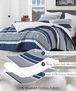 La descripción larga proporcionada para este producto está incompleta. Sin embargo, se puede observar que se mencionan las características clave como el material 100% algodón natural, el diseño moderno de rayas reversibles, la ligereza y esponjosidad del relleno de microfibra, la certificación OEKO-TEX para materiales seguros y la facilidad de cuidado lavable a máquina. Se destaca también el hecho de que el juego de edredón incluye un edredón de tamaño Queen y 2 fundas de almohada, lo que lo convierte en un regalo ideal para amigos y familiares, ideal para diversas ocasiones especiales.