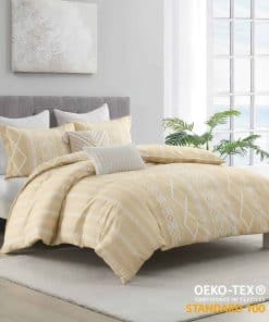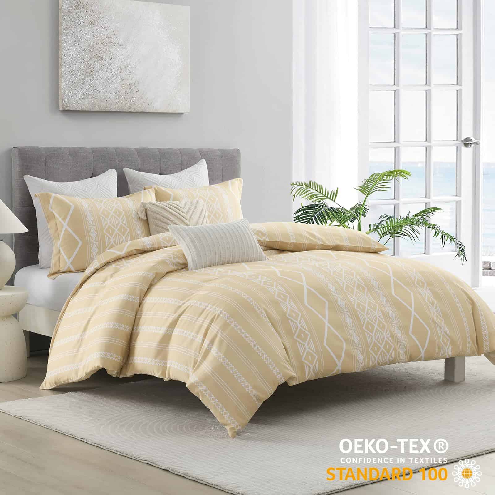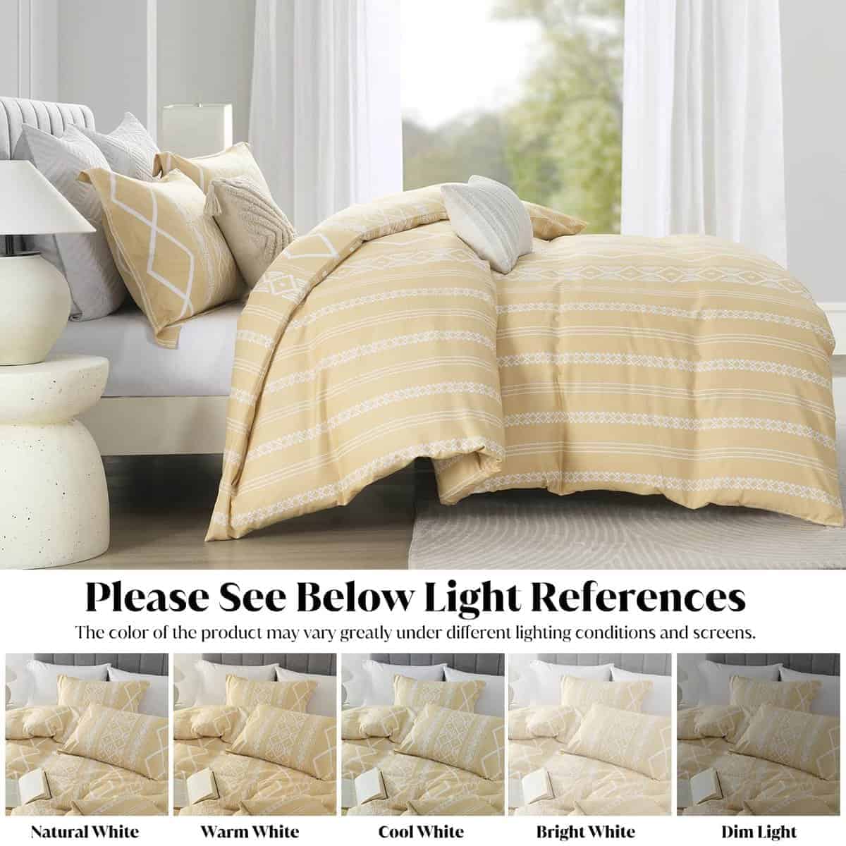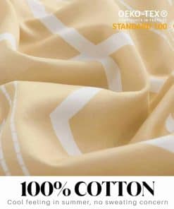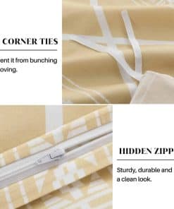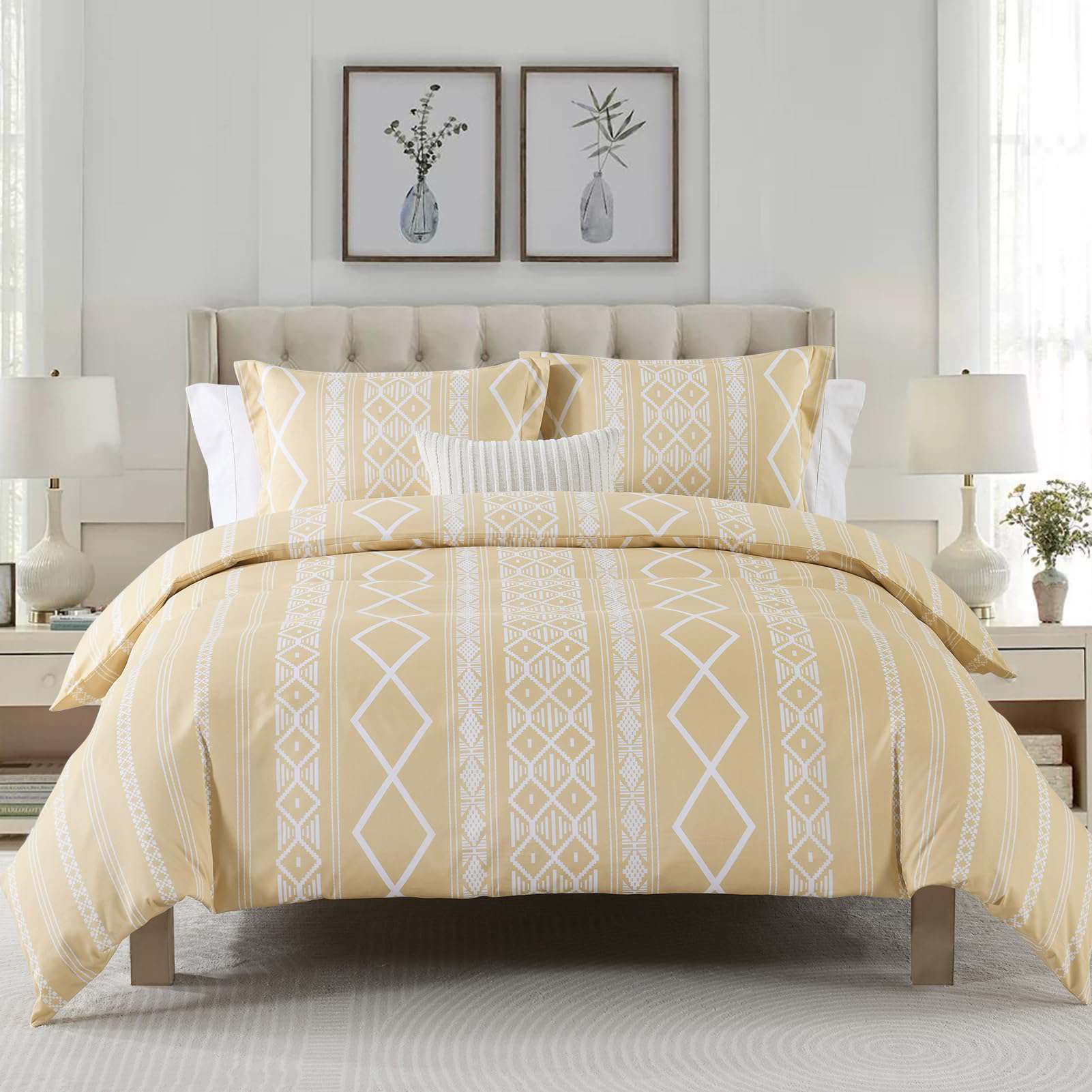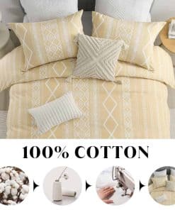 CozyDH Juego de Funda Nórdica Tamaño King – Déjate envolver por la comodidad y estilo de la funda nórdica CozyDH. Hecha de tela de alta calidad y 100% algodón, esta funda de edredón garantiza durabilidad, comodidad y frescura para un descanso reparador. Con un diseño único de patrón geométrico bohemio en tonos beige y amarillo, esta funda nórdica agrega un toque de elegancia y estilo a tu dormitorio, convirtiéndola en una elección ideal para diversas ocasiones como bodas, cumpleaños y festividades. Además, la funda nórdica cuenta con 8 lazos en las esquinas para mantener el edredón en su lugar y un cierre de cremallera oculto para facilitar su apertura y cierre. Las fundas de almohada incluidas cuentan con un cierre de sobre para un fácil acceso. Disponible en tamaños king y queen, este juego de 3 piezas no incluye edredón ni almohada, pero es lavable a máquina para tu comodidad. Disfruta de un descanso tranquilo y sin preocupaciones con la funda nórdica CozyDH.