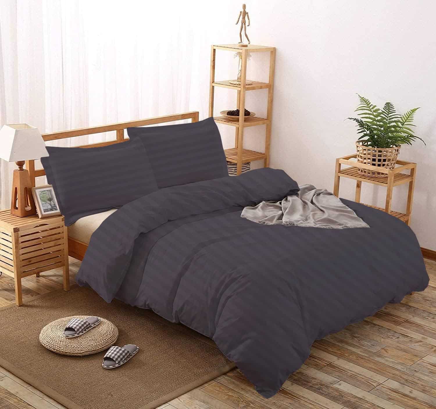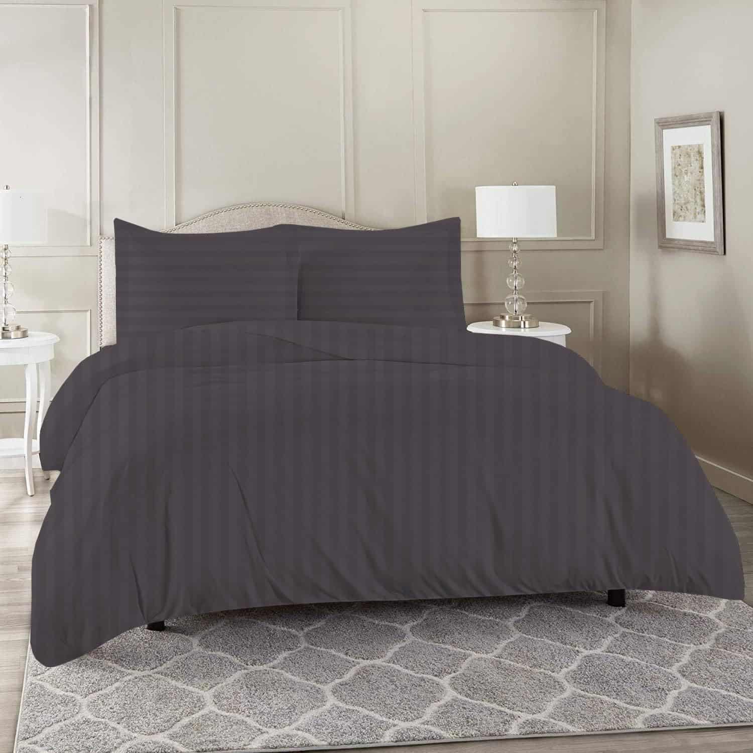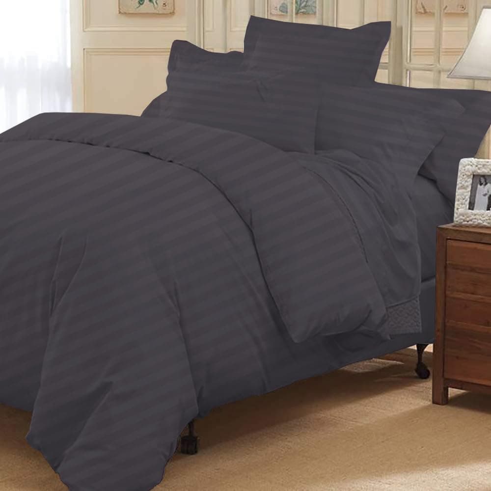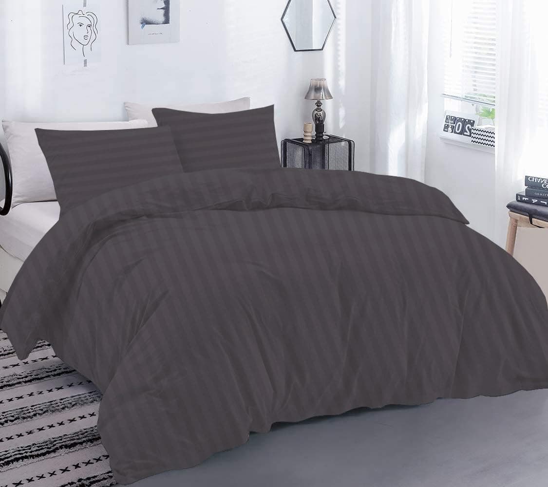 Juego de Funda Nórdica de Lujo, Suave 800 Hilos 100% Algodón Egipcio King/California King (94″x104″) Pulgadas, 3 Piezas con Cierre de Cremallera y Lazos en las Esquinas (1 Funda Nórdica y 2 Fundas de Almohada). Color Gris Oscuro con Rayas. El juego de funda nórdica está hecho de algodón egipcio de alta calidad con 800 hilos, lo que ofrece una suavidad sedosa y una gran transpirabilidad. Incluye una funda nórdica en tamaño King/California (94″x104″) pulgadas y dos fundas de almohada (20″x40″) pulgadas para un ajuste perfecto en tu cama. La funda nórdica tiene un cierre de cremallera oculta y lazos en las esquinas para mantener tu edredón en su lugar. Disponible en una variedad de colores clásicos para adaptarse a cualquier estilo de decoración de dormitorio. Fácil de cuidar, ya que es lavable a máquina, lo que garantiza una belleza duradera y una sensación de frescura en tu dormitorio.
