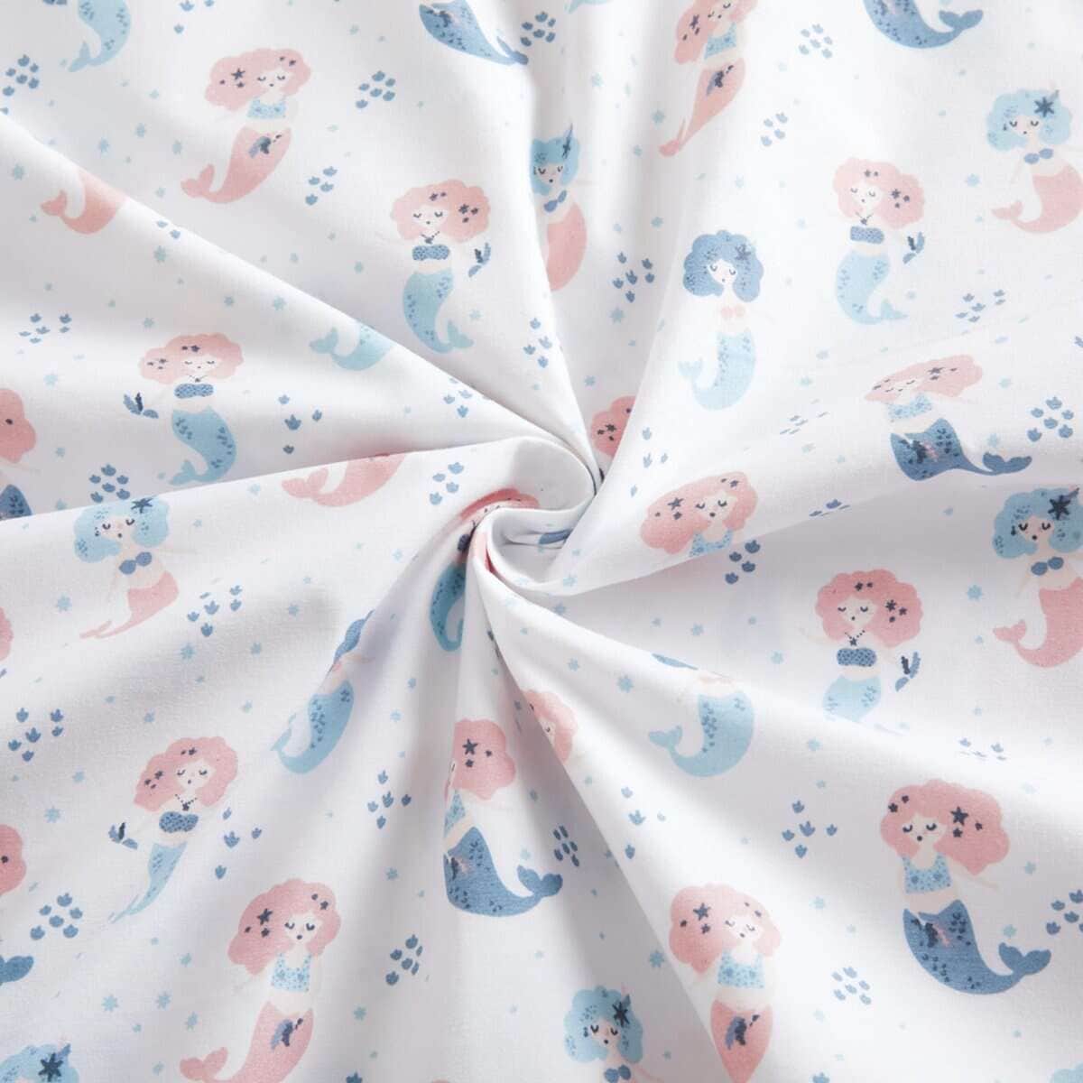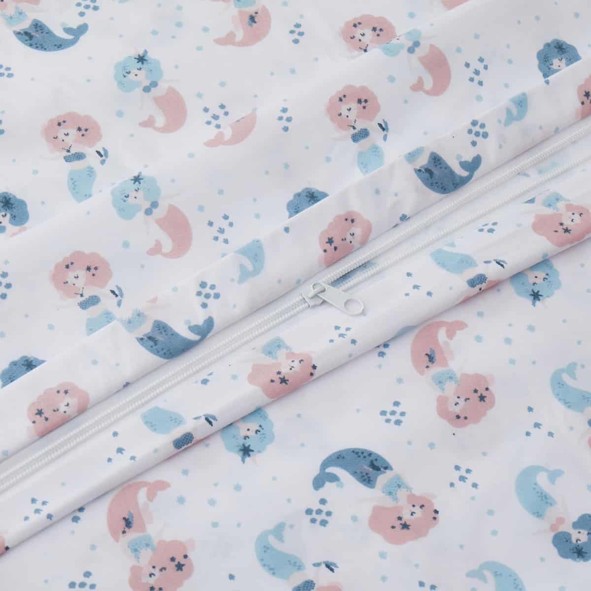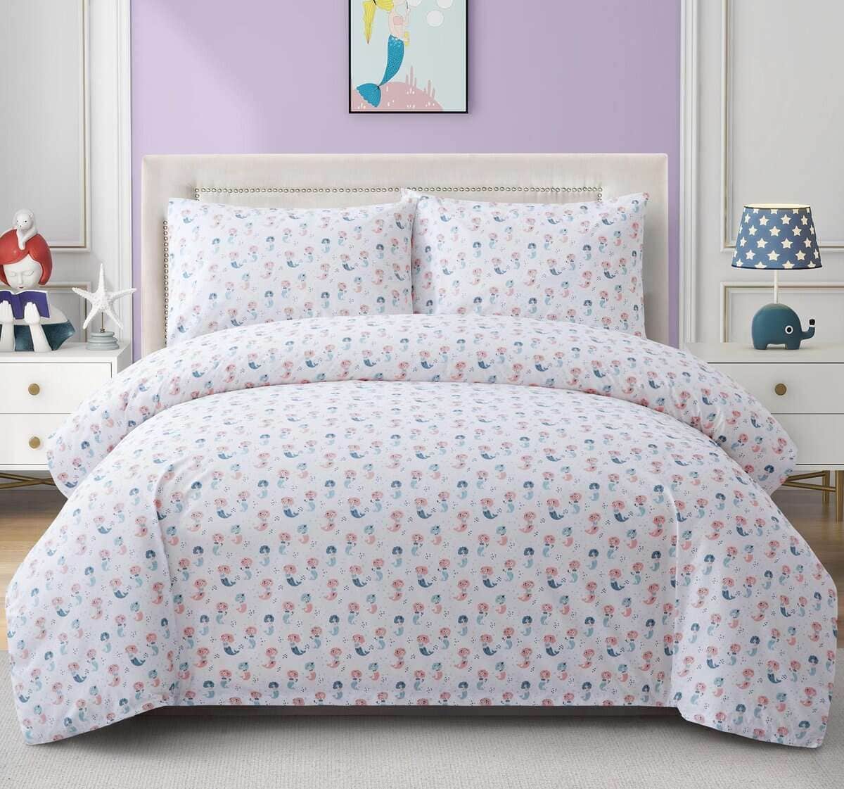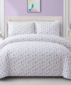 Este juego de funda nórdica para niños de 3 piezas es perfecto para la habitación de cualquier niño. El moderno patrón de sirena con una sirena cantante rosa y azul sobre una base blanca seguro que encantará a cualquier niña pequeña. Las fundas de almohada a juego con el diseño impreso complementan perfectamente la funda nórdica para crear un ambiente divertido y acogedor en la habitación. Este juego de cama para niños está diseñado con elementos encantadores que hacen que la hora de dormir sea más divertida y relajante para los niños.
