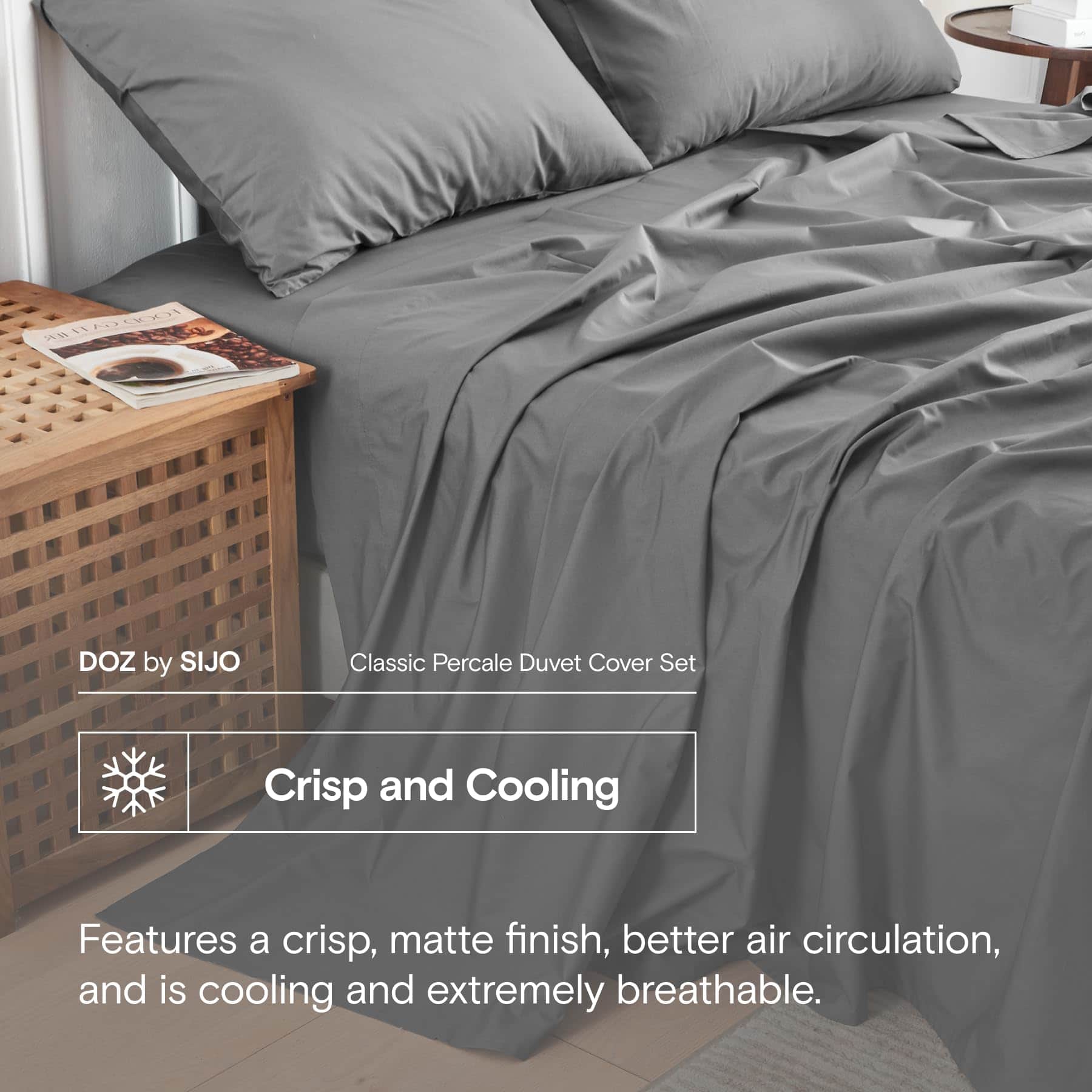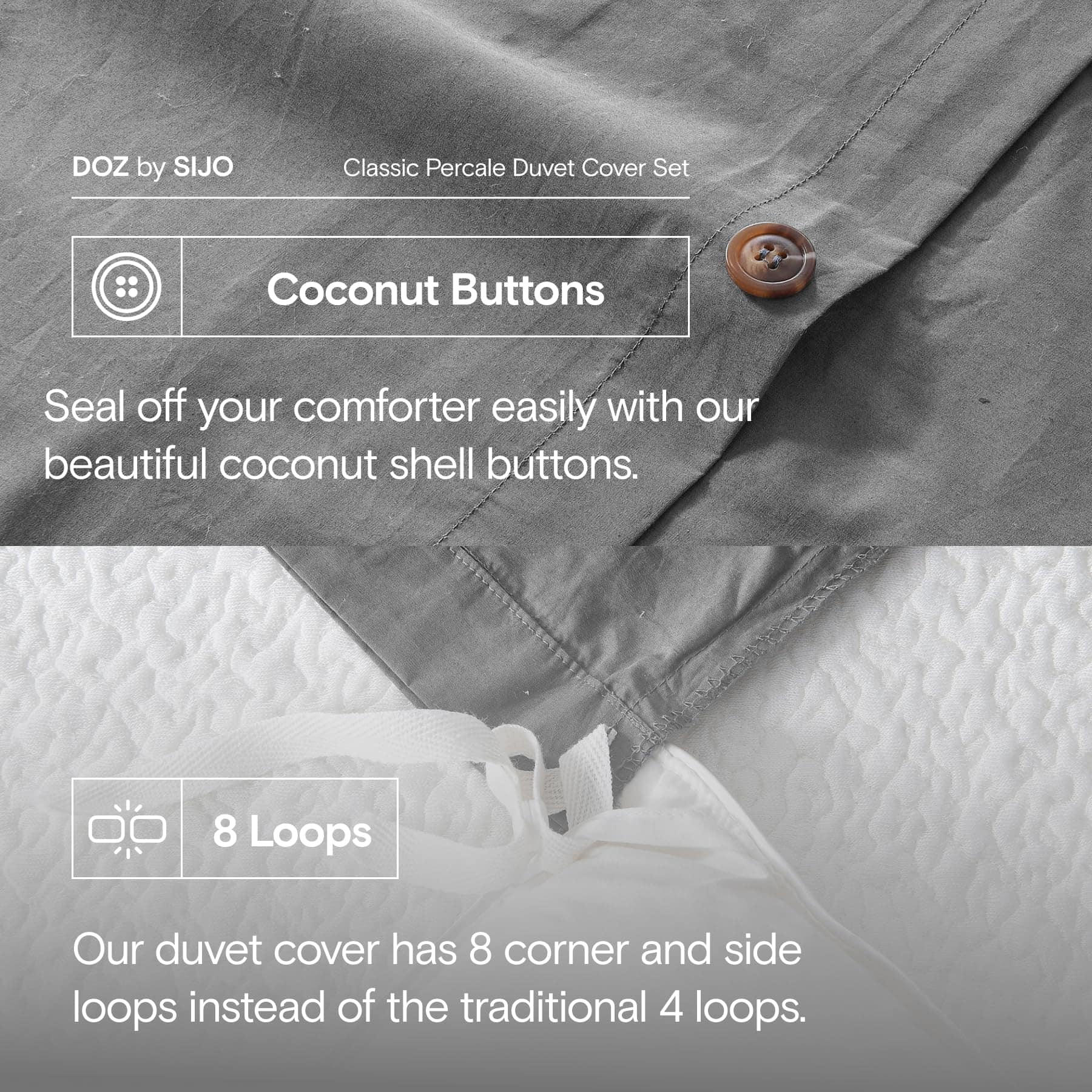 1. Fundas nórdicas de algodón DOZ by SIJO: SIJO es una marca de ropa de cama experta en materiales innovadores. Nuestra misión y productos nos han valido numerosos premios y reconocimientos de la industria. Ahora, llevamos esa misma experiencia y pasión por los productos para dormir a DOZ by SIJO. Descansa sabiendo que DOZ, respaldado por la marca SIJO, contará con artículos de alta calidad, bien elaborados y con buen precio para ayudarte a lograr un mejor sueño noche tras noche. 2. TEJIDO DE UNA CAPA Y PERCAL VERDADERO: Solo utilizamos tejidos de algodón de una capa que son 100% genuinos de hilos de algodón de fibra larga. El hilo de una sola capa se fabrica utilizando una fibra de algodón de fibra larga para crear un hilo. 300 hilos es la cantidad perfecta de hilos para las sábanas de percal, está tan tejido que garantiza una durabilidad premium al mismo tiempo que asegura que las sábanas sean extremadamente transpirables y frescas al tacto para darte un buen y fresco sueño. Confía en nosotros, este juego es tan duradero que durará años. 3. ALGODÓN OEKO-TEX: Las fundas nórdicas de algodón percal Doz by SIJO están certificadas por Oeko Tex 100 Clase 1 con los requisitos más estrictos para las prendas de bebé. Nuestras sábanas de algodón se fabrican sin toxinas en cada paso, puedes dormir tranquilo sabiendo que el 100% de nuestras sábanas están libres de químicos dañinos, pesticidas y OMG. 4. 8 LAZOS: Nuestra funda nórdica tiene 8 lazos en las esquinas y laterales en lugar de los tradicionales 4 lazos. Sella tu edredón fácilmente con nuestros hermosos botones de resina. Full/Queen 90″x90″. King/Cal King 106″x90″. 5. REFRESCANTE: El tejido percal es transpirable, se siente suave contra la piel y le da a las sábanas una sensación ligera y una apariencia más estructurada que las sábanas con tejido satén. Nuestras sábanas percal se alejan de la piel para permitir una mejor circulación del aire y un rendimiento refrescante. Las personas que tienden a sudar o tener calor por la noche apreciarán la calidad aireada de estas sábanas. Las sábanas se volverán más suaves después de cada lavado.