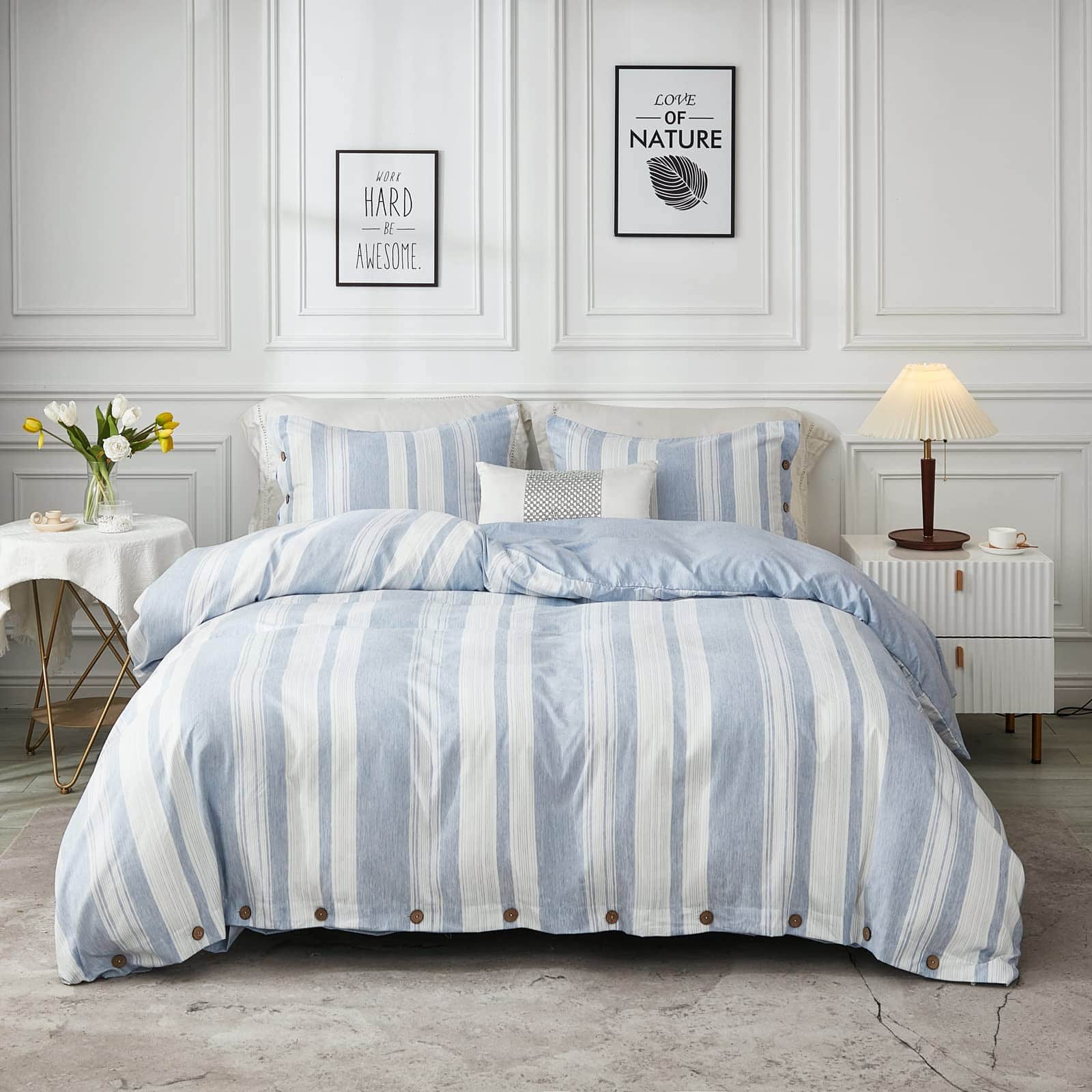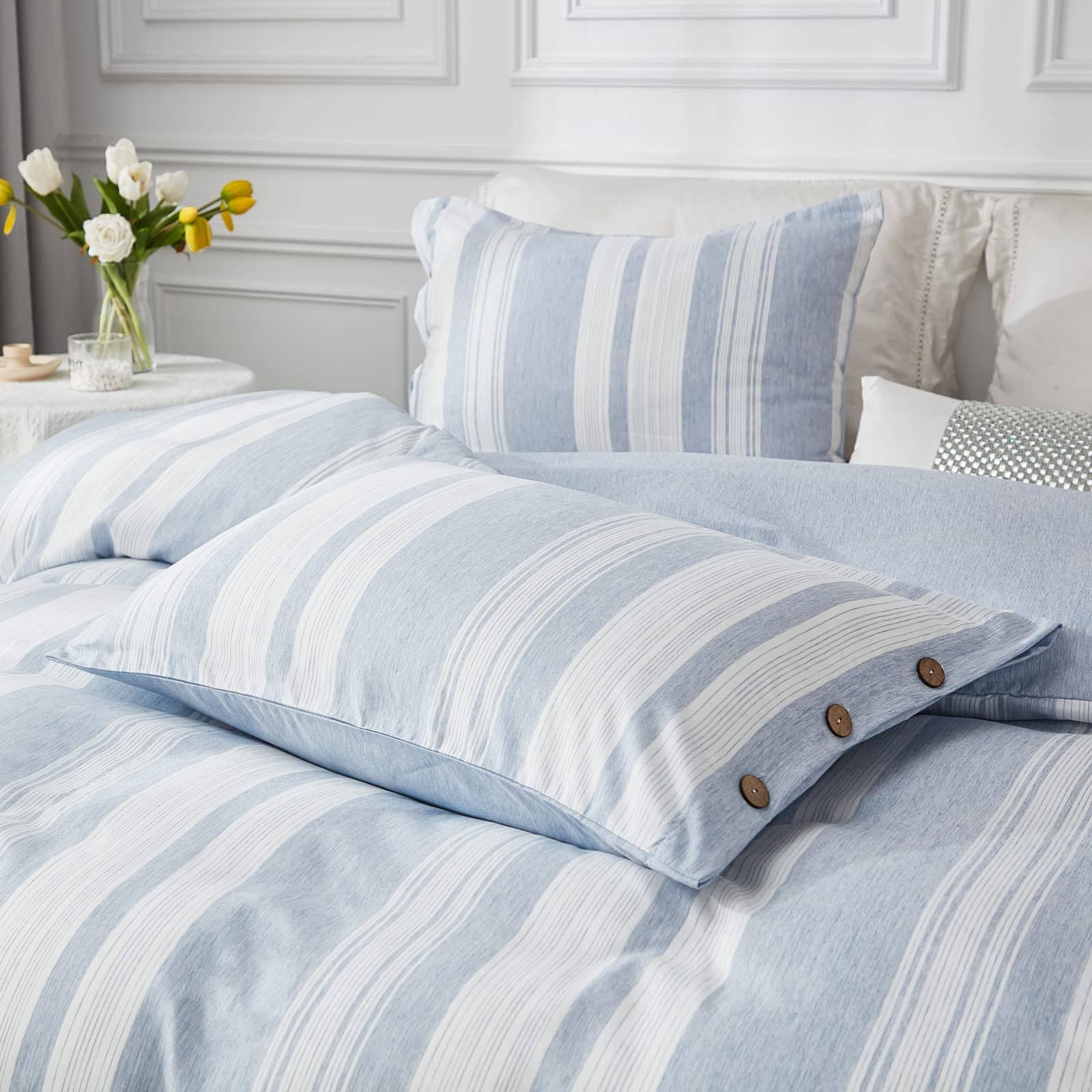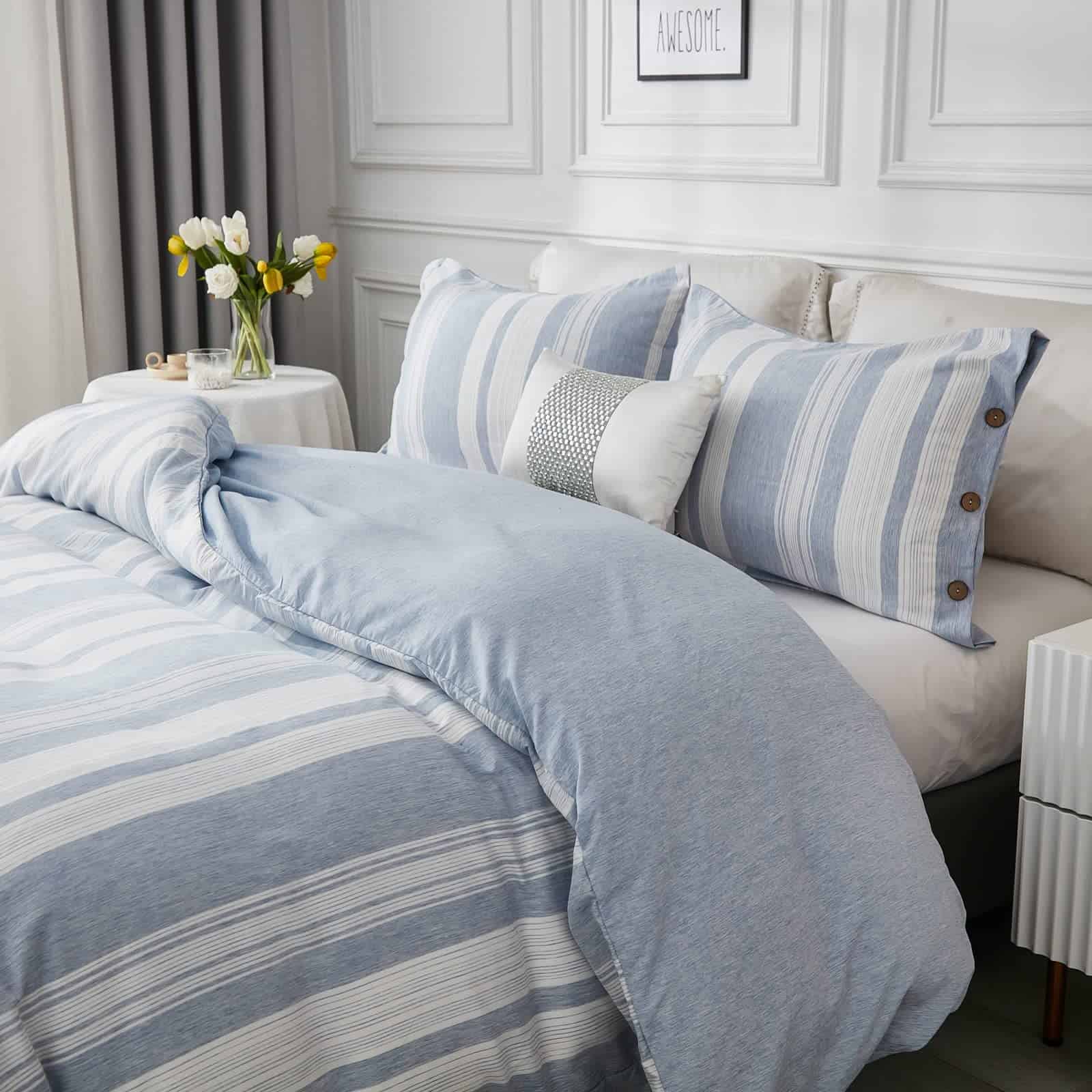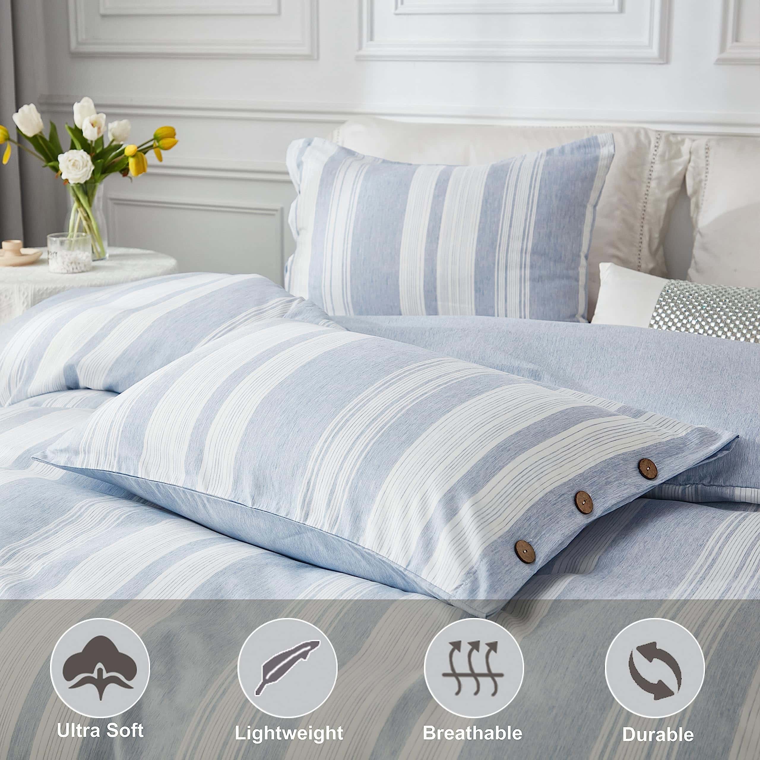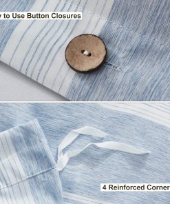 1. Cierre de botón y Lazos en las esquinas: Diseño de cierre con botones de concha de coco, aspecto moderno simple y elegante que añade una sensación relajante a tu espacio para dormir; Hay cuatro lazos en cada esquina de la funda nórdica que mantienen el edredón en su lugar.