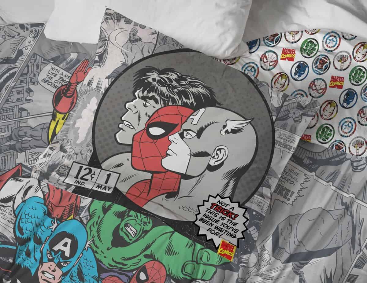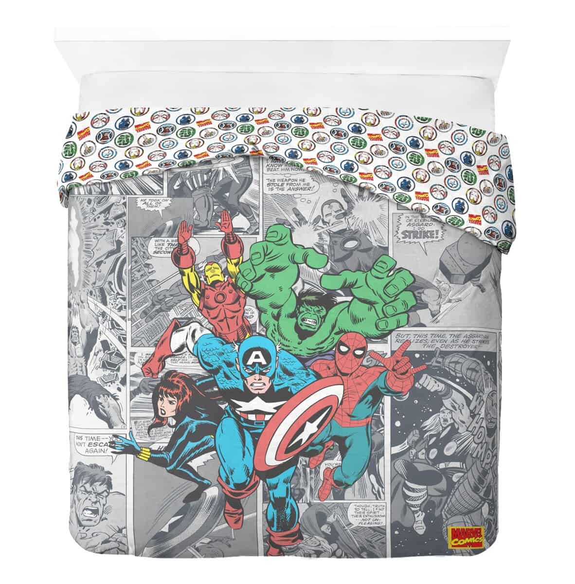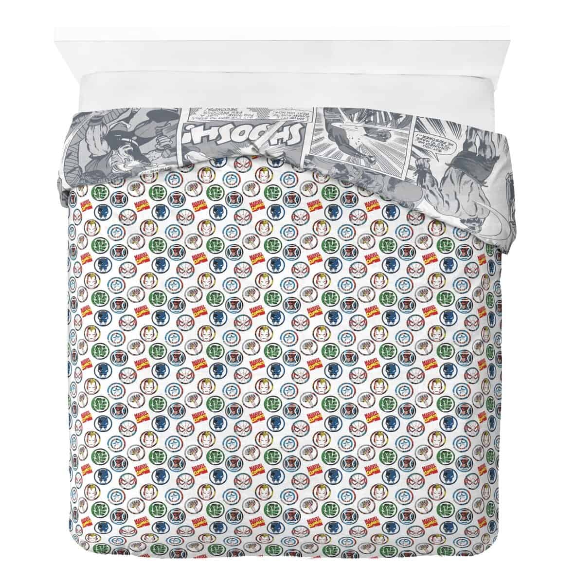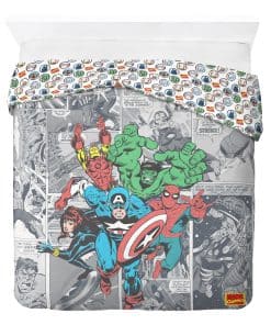Transforma la habitación de tu hijo con nuestro juego de funda nórdica de tamaño completo Marvel Comics Avengers de 3 piezas, que incluye una funda nórdica y dos fundas de almohada a juego. Perfecto para agregar comodidad, estilo y personalidad a cualquier habitación infantil, este set da vida a la hora de dormir con su diseño reversible y su estilo juguetón. Hecho de premium 100% de poliéster microfibra cepillado, la funda nórdica y las fundas de almohada son increíblemente suaves, duraderas y transpirables para una noche de sueño reparador. La funda nórdica incluye un cierre de botón para un uso fácil y un ajuste seguro, mientras que el diseño reversible te permite cambiar la apariencia de la cama de tu hijo cuando lo desees. El set incluye una funda nórdica de tamaño completo (76″ x 86″) y dos fundas de almohada a juego (20″ x 26″), facilitando la creación de un espacio de descanso coordinado y acogedor. Ideal tanto para niños como niñas, este set de funda de edredón es perfecto para uso diario, pijamadas o como un regalo atento para cumpleaños y días festivos. Los diseños vibrantes con tus superhéroes favoritos: Capitán América, Hulk, Thor, Spiderman, Iron Man y Black Widow agregan un toque de diversión a cualquier decoración de dormitorio infantil, ayudando a potenciar la imaginación y hacer que su habitación se sienta extra especial. Los padres adorarán la conveniencia de este juego de funda nórdica lavable a máquina, garantizando fácil cuidado y color duradero que se mantiene genial lavado tras lavado. Dale a la habitación de tu hijo una actualización fresca con este divertido, versátil y elegante juego de funda nórdica Marvel, la forma perfecta de crear un ambiente de sueño cómodo y acogedor que les encantará!