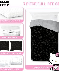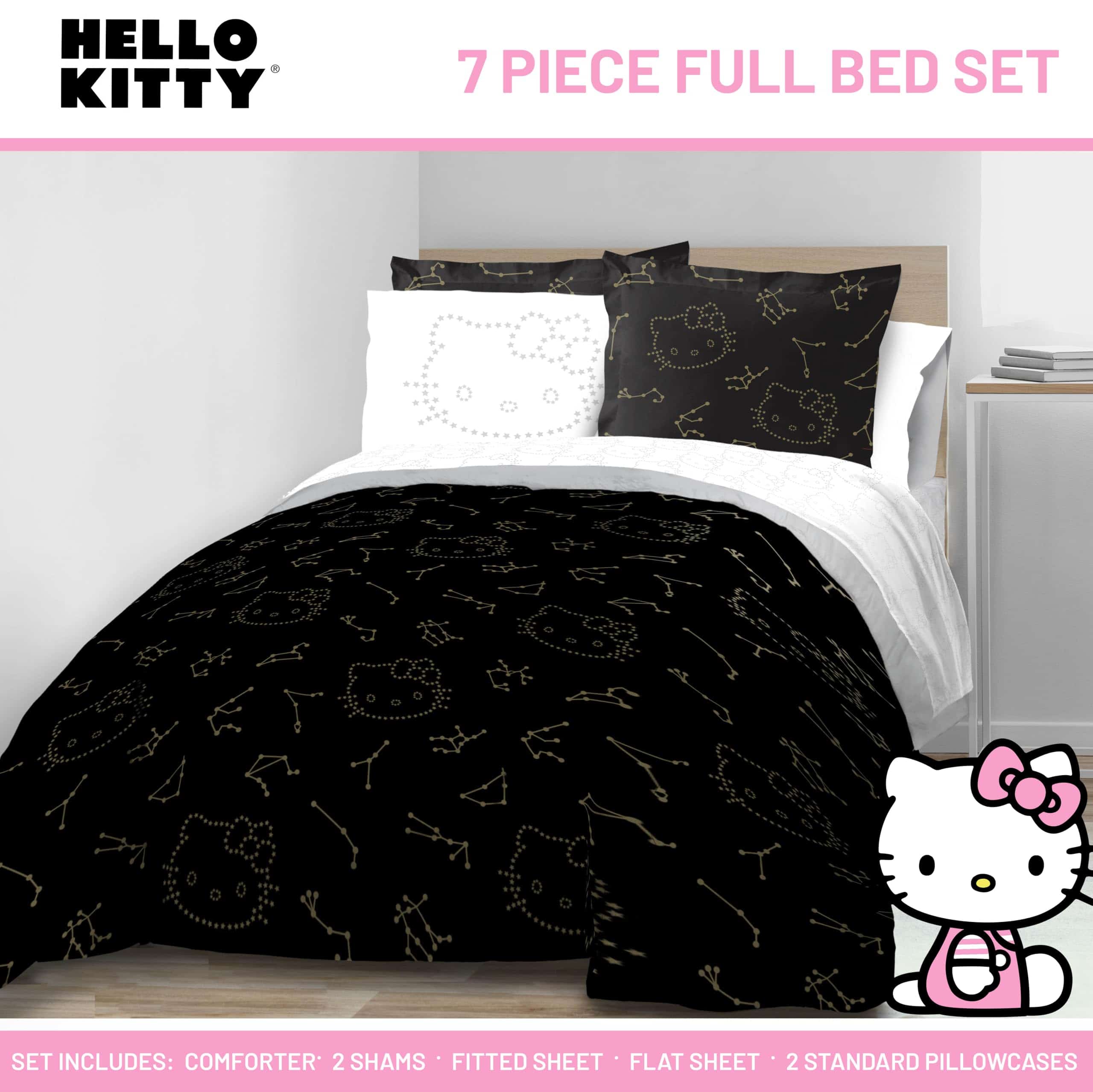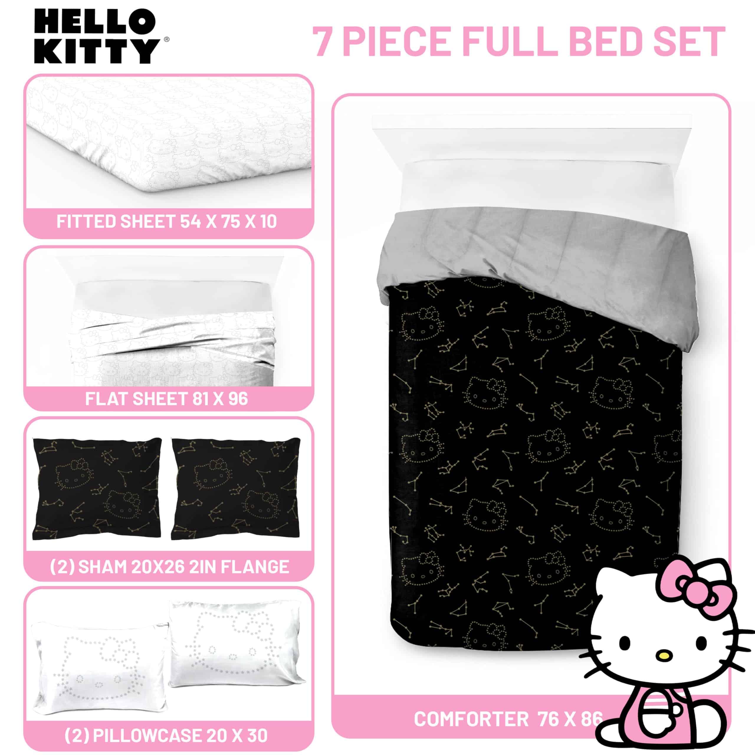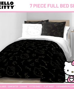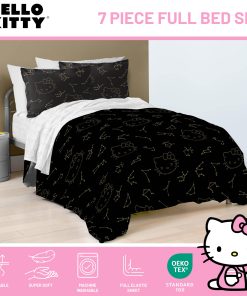 Transforma tu dormitorio con este juego de cama completo Hello Kitty Stars! Este fantástico diseño de constelaciones del zodiaco decorará cualquier dormitorio, haciéndote emocionar por saltar a la cama. El conjunto de ropa de cama completo incluye un edredón completo, sábana ajustable, sábana plana, dos fundas de almohada estándar de 20 x 30 pulgadas y dos fundas de almohada de 20 x 26 pulgadas. Fácil cuidado, lavar a máquina en frío, secar a baja temperatura.