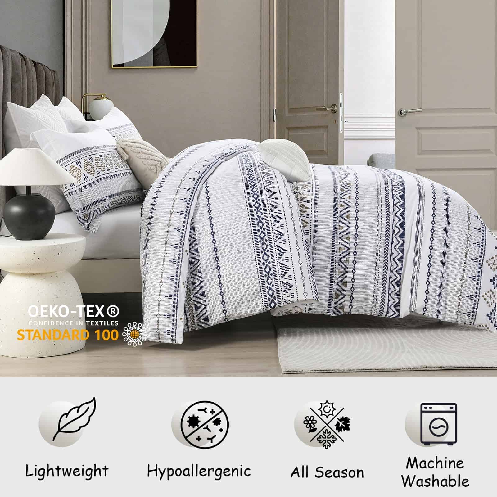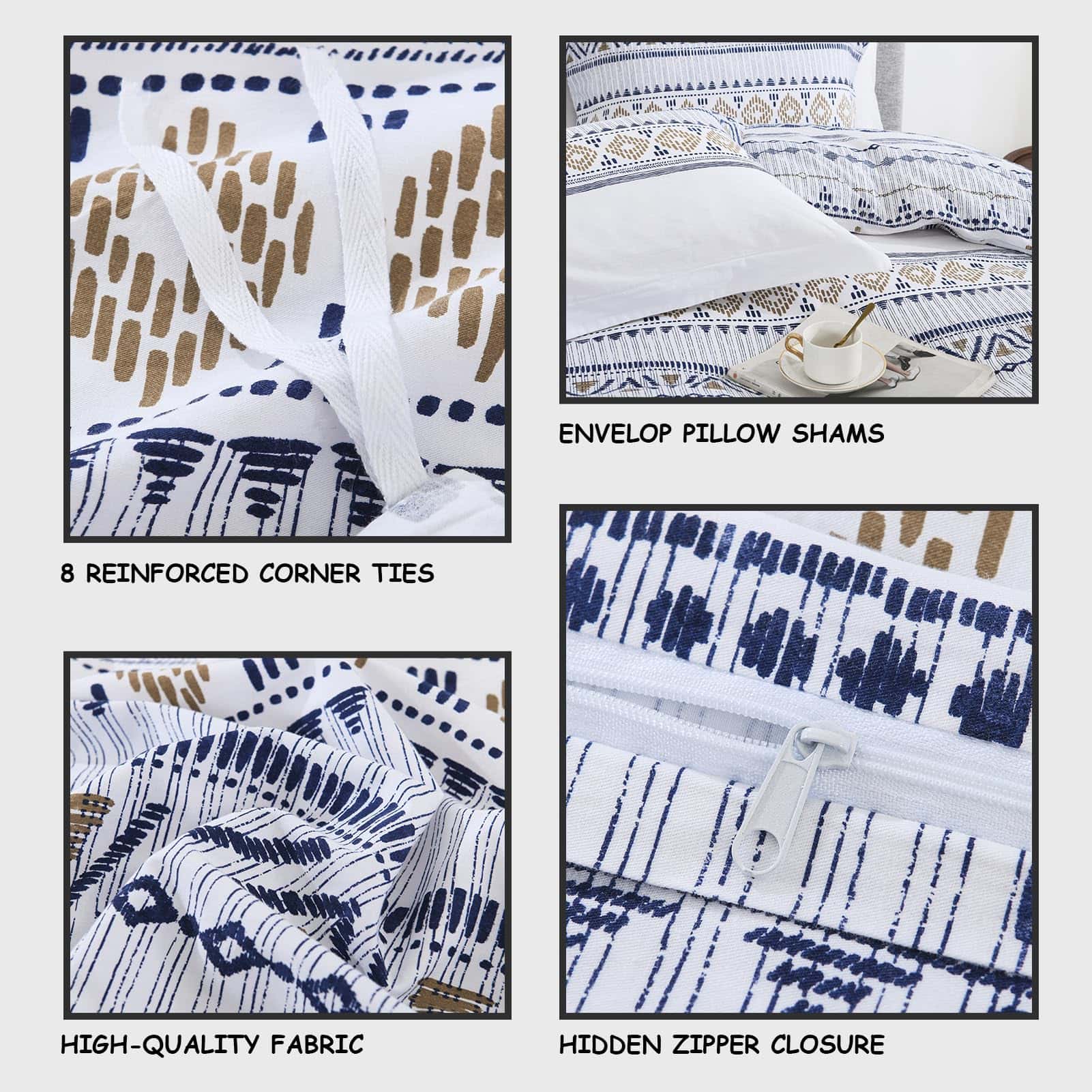 3. 8 Lazos en las esquinas y cierre de cremallera de la funda nórdica: Nuestra funda nórdica bohemia King viene con ocho lazos en cada uno de los bordes y esquinas para evitar que tu relleno nórdico se amontone dentro o se desplace, brindándote tranquilidad en la cama. El cierre de cremallera oculto hace que poner y quitar la funda nórdica King de algodón sea más fácil y apunta a un uso más duradero que el cierre de botones.
