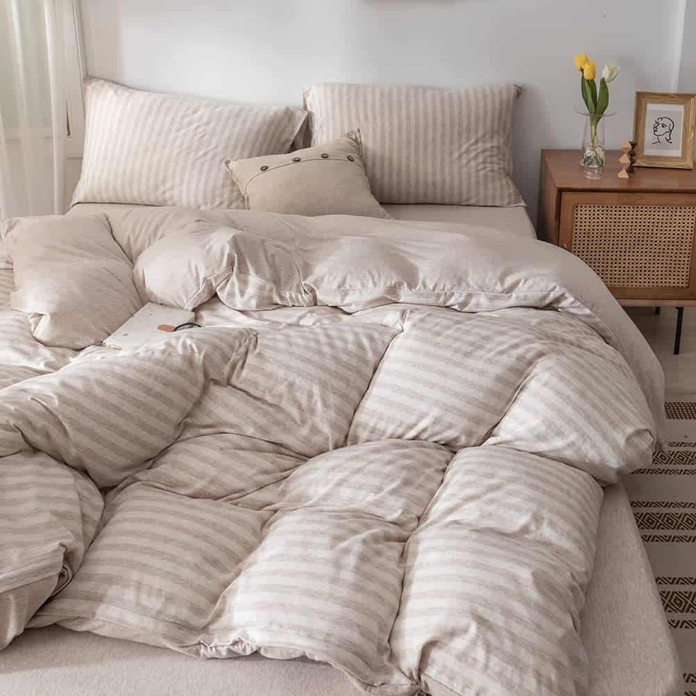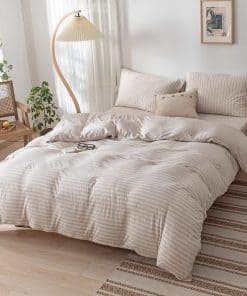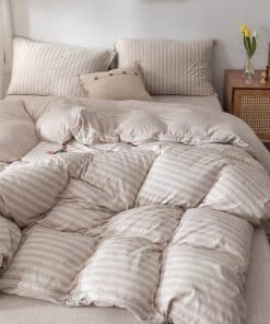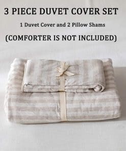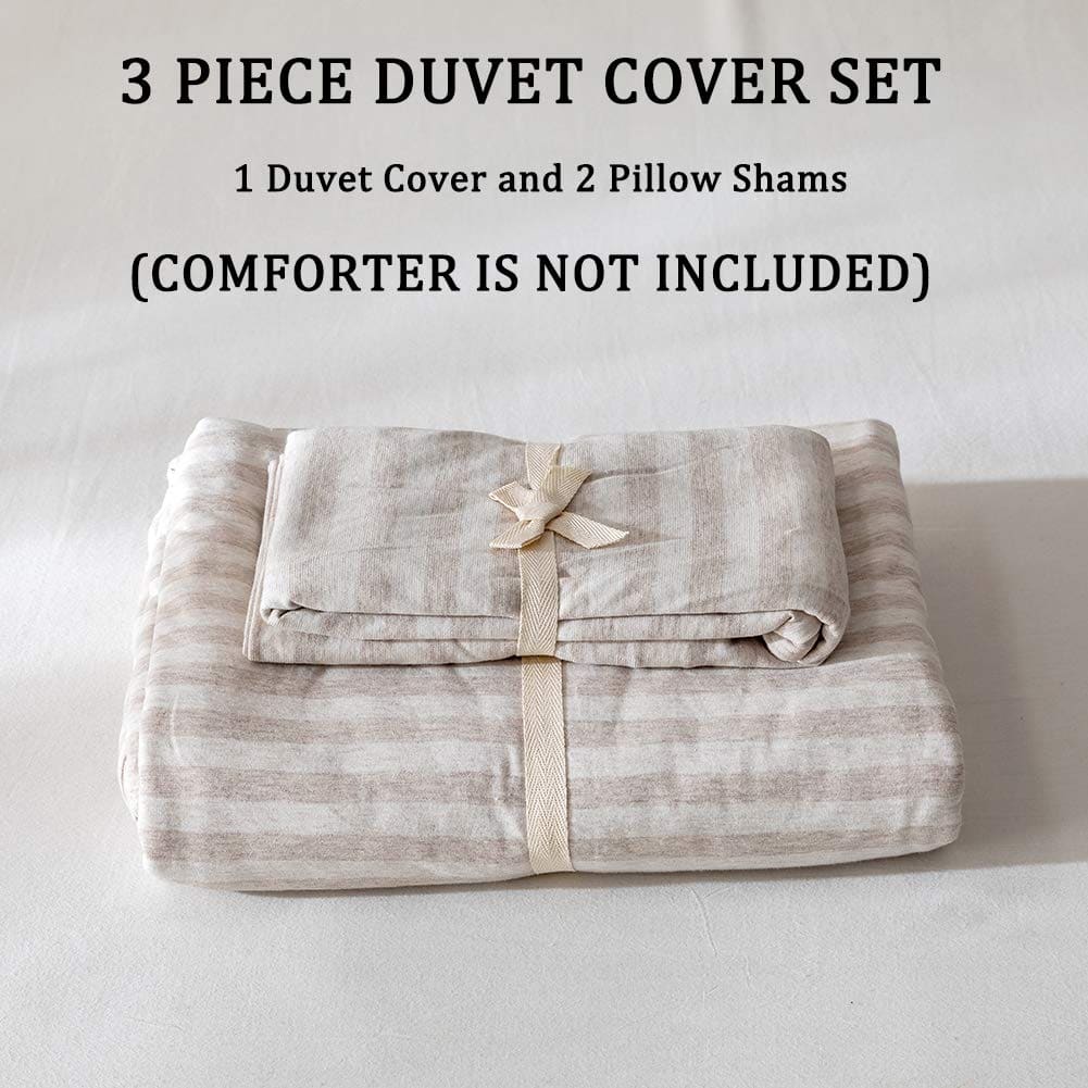 Juego de Funda nórdica King Size DONEUS – Juego de Ropa de Cama a Rayas en Beige con Cierre de Cremallera, 3 Piezas, Incluye 1 Funda nórdica (104″x90″) y 2 Fundas de Almohada, SIN Edredón. Este juego de funda nórdica está hecho de tela de algodón 100% jersey knit, tan cómodo como una camiseta favorita, súper suave, ligero, resistente a la decoloración, hipoalergénico y transpirable, y con una sensación de mano extra suave que se vuelve aún más suave después de los lavados. El juego de funda nórdica de jersey knit presenta diseños de estilo a rayas que se mezclan sin esfuerzo con varios estilos de decoración de dormitorio, añadiendo un toque de simplicidad y elegancia a la atmósfera de tu dormitorio. La funda nórdica beige king se adapta perfectamente a cualquier espacio. El juego de funda nórdica king de 3 piezas incluye 1 funda nórdica king size (104″ x 90″) y 2 fundas de almohadas (20″ x 36″). Por favor, consulta la guía de tallas cuidadosamente y elige la talla que más te convenga. El juego de funda nórdica cuenta con un cierre de cremallera oculto para insertar fácilmente tu edredón en la funda y mantenerlo seguro sin moverse ni apiñarse. Además, 4 lazos en las esquinas dentro de la funda nórdica mantienen el edredón en su lugar. Nuestra funda nórdica se puede limpiar fácilmente, secar a baja temperatura. ¡NO BLANQUEAR, PLANCHAR o LIMPIAR EN SECO! Por favor, compra con confianza, porque no importa qué dificultades ocurran, ¡te tenemos cubierto!
