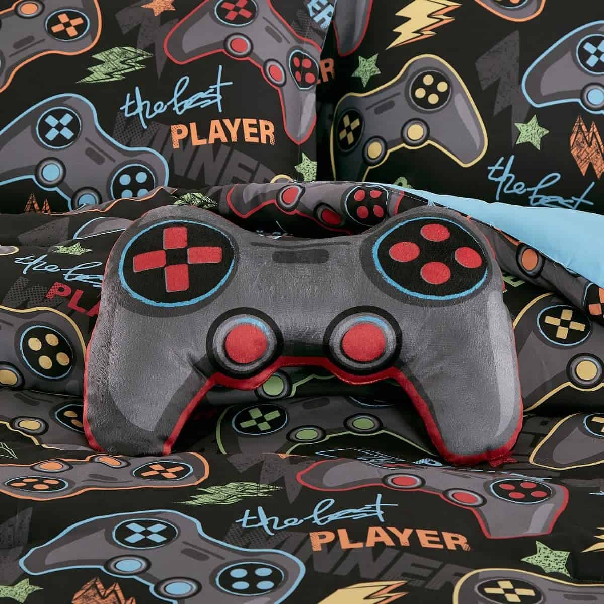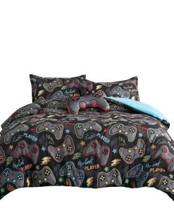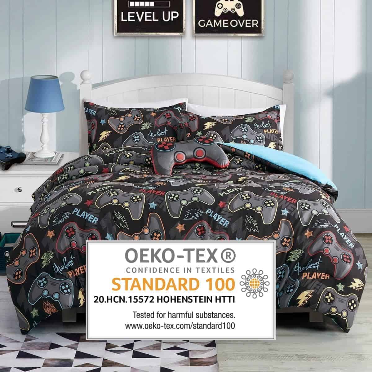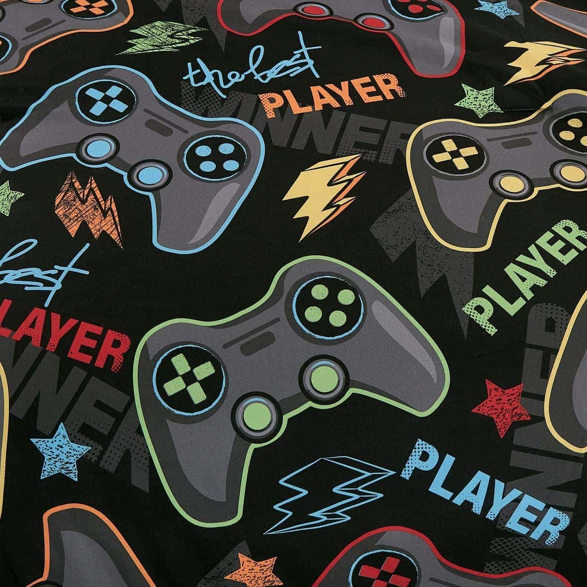 Juego de funda nórdica de tema de videojuegos para la habitación de los niños. Ropa de cama de diseño gamer suave con estampado de patrón estilo retro de mando de consola de videojuegos. El lado delantero es estampado de mando de juego y el lado trasero es azul sólido. También incluye sábana ajustable y funda de almohada y un suave almohada de mando para dormir plácidamente. Tamaño disponible en set Twin de 4 piezas o set Full de 5 piezas. El set Twin de 4 piezas incluye funda nórdica tamaño 168 cm de ancho x 218 cm de largo, sábana ajustable tamaño 99 cm x 190 cm, almohada de peluche y funda de almohada 51 cm x 66 cm. El set Full de 5 piezas incluye funda nórdica tamaño 193 cm de ancho x 218 cm de largo, sábana ajustable tamaño 137 cm x 190 cm, almohada de peluche y dos fundas de almohada 51 cm x 66 cm. El material de la funda nórdica de microfibra es súper suave y duradero. Mantiene a los niños cálidos y acogedores toda la noche y mientras juegan sus videojuegos favoritos en la cama. Este juego de cama de alta calidad es ideal para cualquier habitación de niños, niñas o adolescentes. Los estampados y colores son vibrantes y se pueden lavar en la lavadora y secadora sin preocuparse de que el patrón temático colorido y los personajes animados se desvanezcan. Fabricado en una fábrica con certificación OEKO-TEX Standard 100, un sistema de certificación independiente que garantiza la confianza del cliente al asegurar que los textiles se prueban para detectar sustancias nocivas y cumplen con altos estándares de seguridad del producto y ambientales. Instrucciones de cuidado: -lavar antes del primer uso -lavar a máquina en agua fría -ciclo suave -secar a baja temperatura -no usar blanqueador -no limpiar en seco