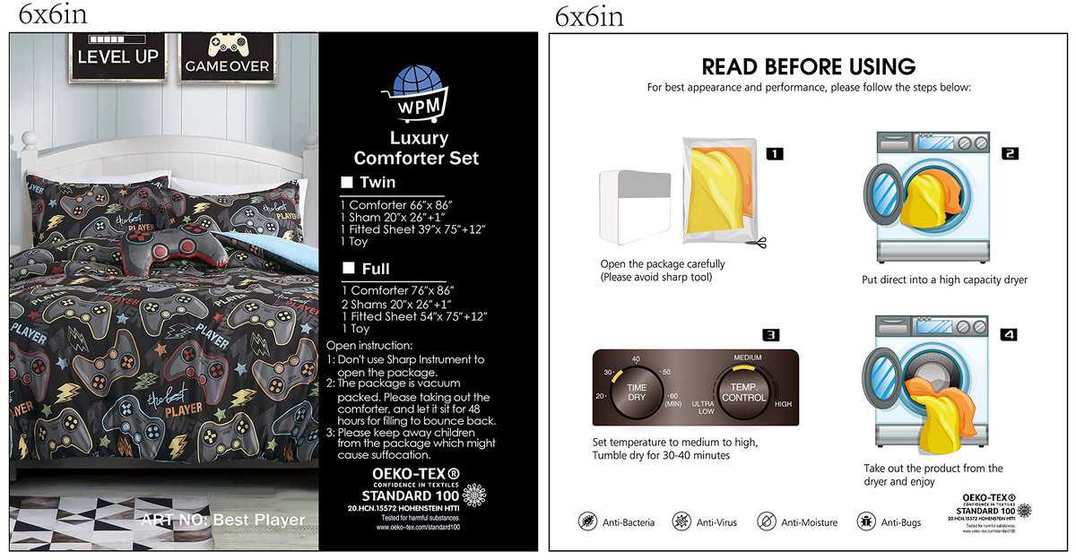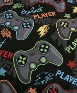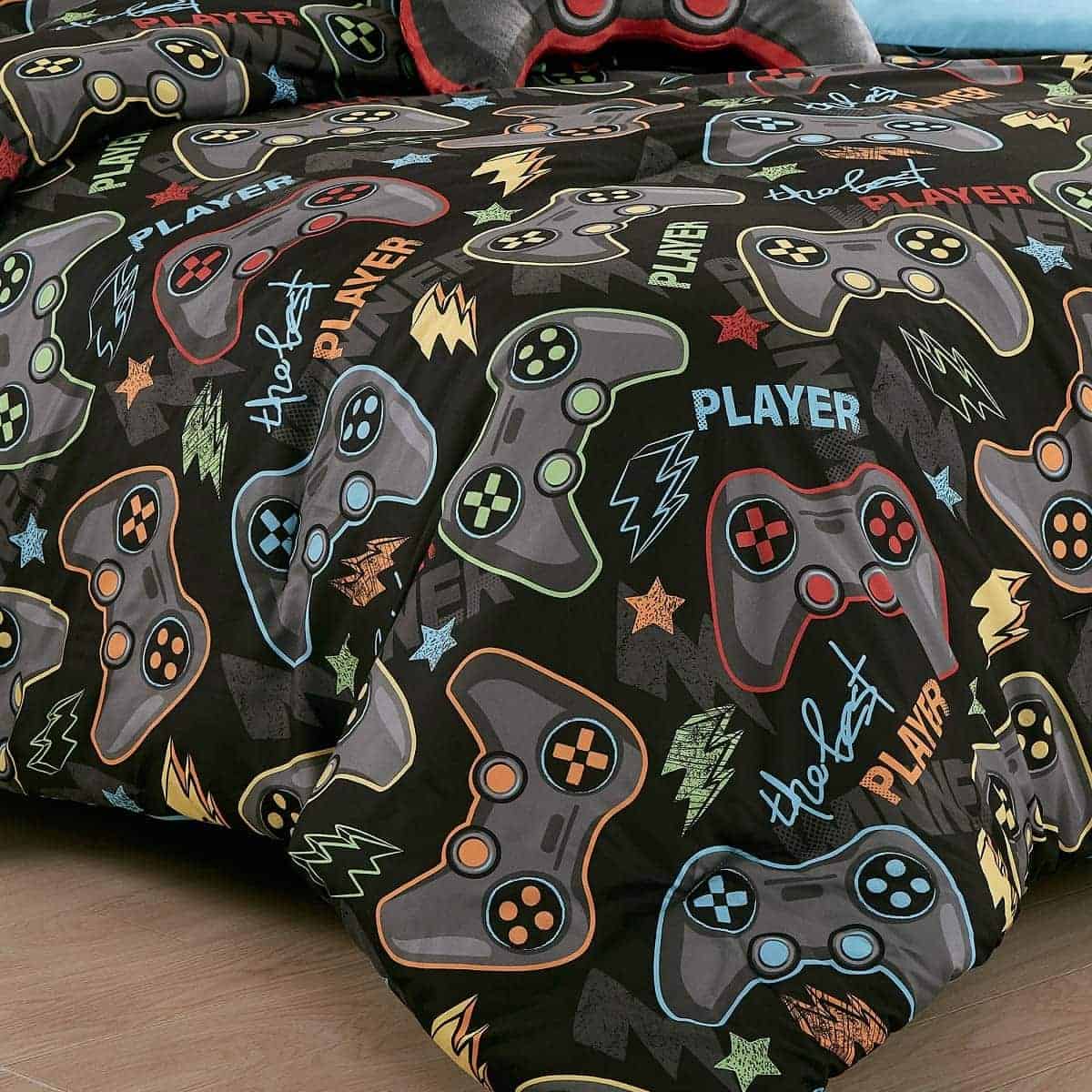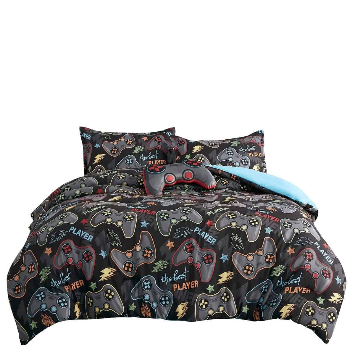 Juego de funda nórdica de tema de videojuegos para la habitación de los niños. Ropa de cama de diseño gamer suave con estampado de patrón estilo retro de mando de consola de videojuegos. El lado delantero es estampado de mando de juego y el lado trasero es azul sólido. También incluye sábana ajustable y funda de almohada y un suave almohada de mando para dormir plácidamente. Tamaño disponible en set Twin de 4 piezas o set Full de 5 piezas. El set Twin de 4 piezas incluye funda nórdica tamaño 168 cm de ancho x 218 cm de largo, sábana ajustable tamaño 99 cm x 190 cm, almohada de peluche y funda de almohada 51 cm x 66 cm. El set Full de 5 piezas incluye funda nórdica tamaño 193 cm de ancho x 218 cm de largo, sábana ajustable tamaño 137 cm x 190 cm, almohada de peluche y dos fundas de almohada 51 cm x 66 cm. El material de la funda nórdica de microfibra es súper suave y duradero. Mantiene a los niños cálidos y acogedores toda la noche y mientras juegan sus videojuegos favoritos en la cama. Este juego de cama de alta calidad es ideal para cualquier habitación de niños, niñas o adolescentes. Los estampados y colores son vibrantes y se pueden lavar en la lavadora y secadora sin preocuparse de que el patrón temático colorido y los personajes animados se desvanezcan. Fabricado en una fábrica con certificación OEKO-TEX Standard 100, un sistema de certificación independiente que garantiza la confianza del cliente al asegurar que los textiles se prueban para detectar sustancias nocivas y cumplen con altos estándares de seguridad del producto y ambientales. Instrucciones de cuidado: -lavar antes del primer uso -lavar a máquina en agua fría -ciclo suave -secar a baja temperatura -no usar blanqueador -no limpiar en seco